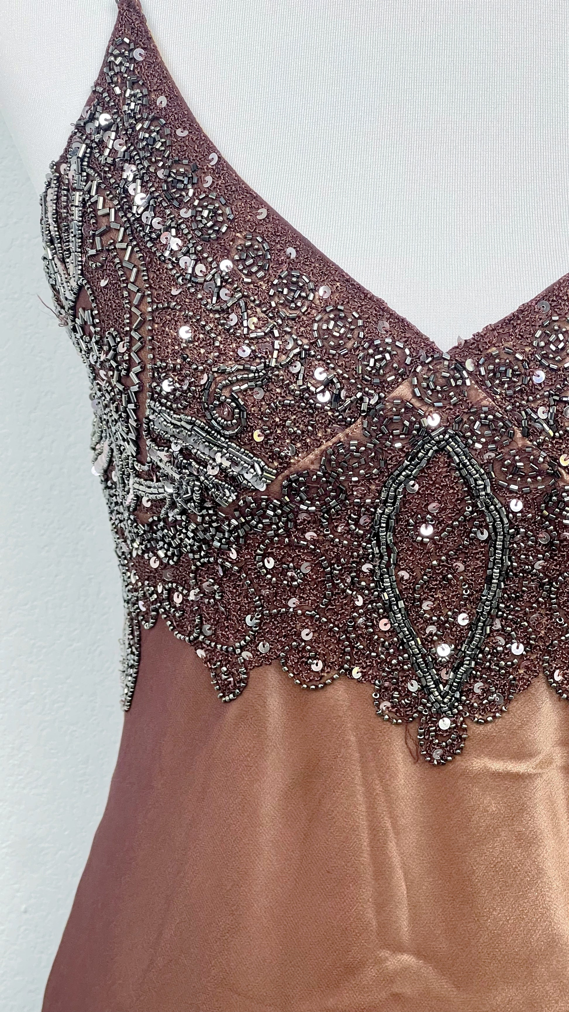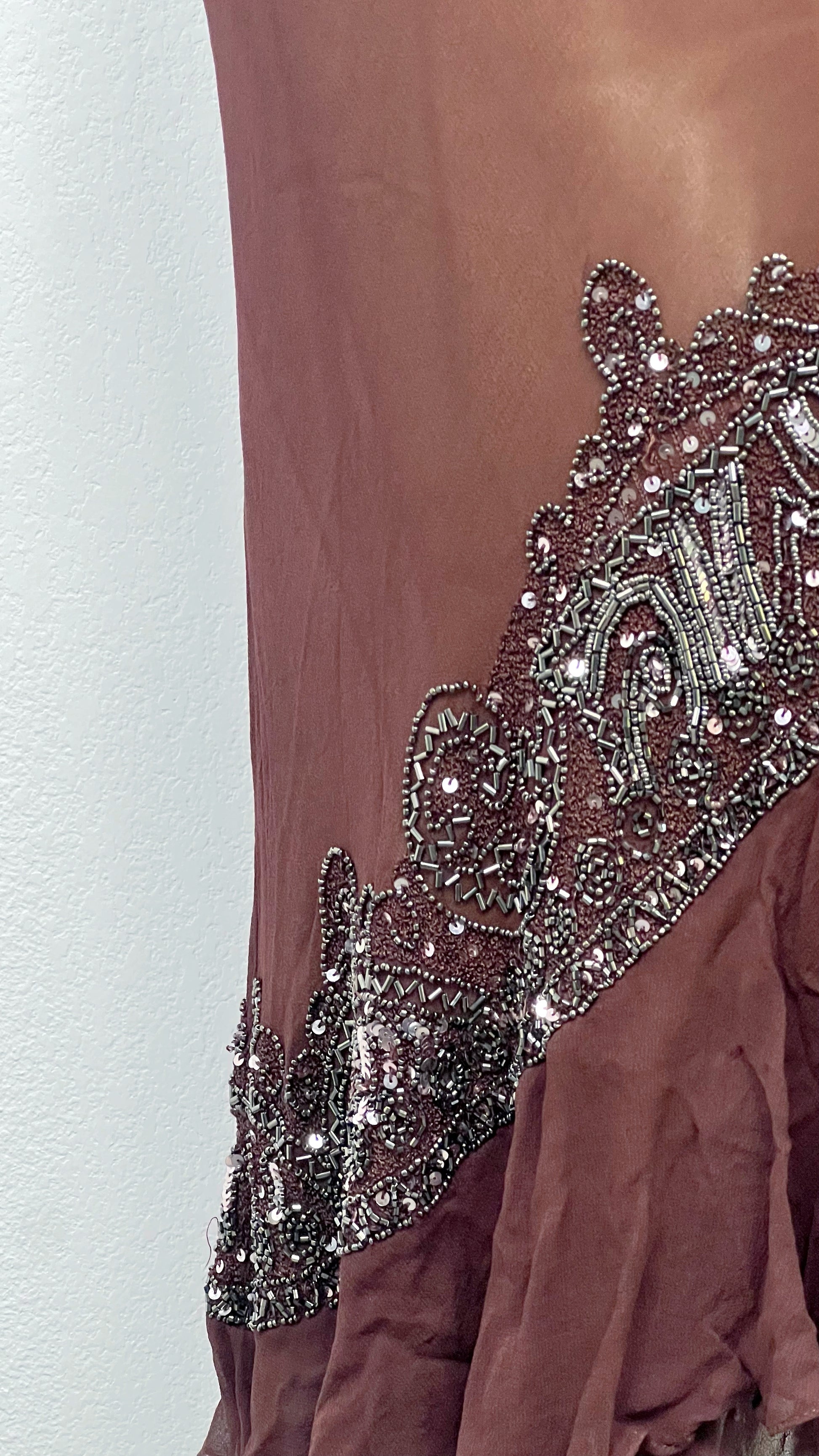 Its deep chocolate hue is adorned with shimmering embroidery and beading, tracing intricate arabesques that catch the light like twilight reflections.