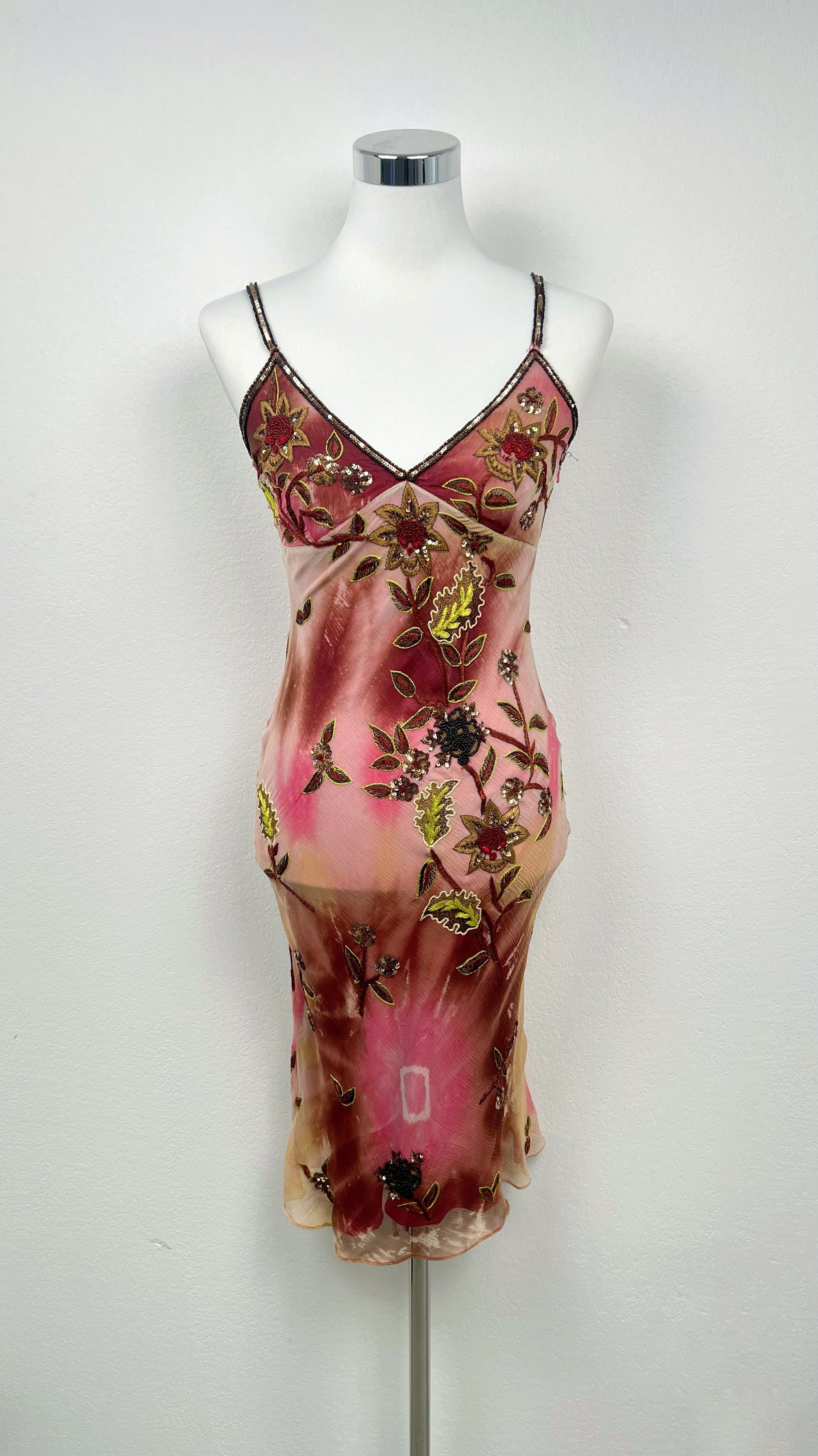 The Sunset Garden Dress is a textile work of art, where lightweight silk takes on warm shades, blending tender pink and golden brown like a summer sunset.