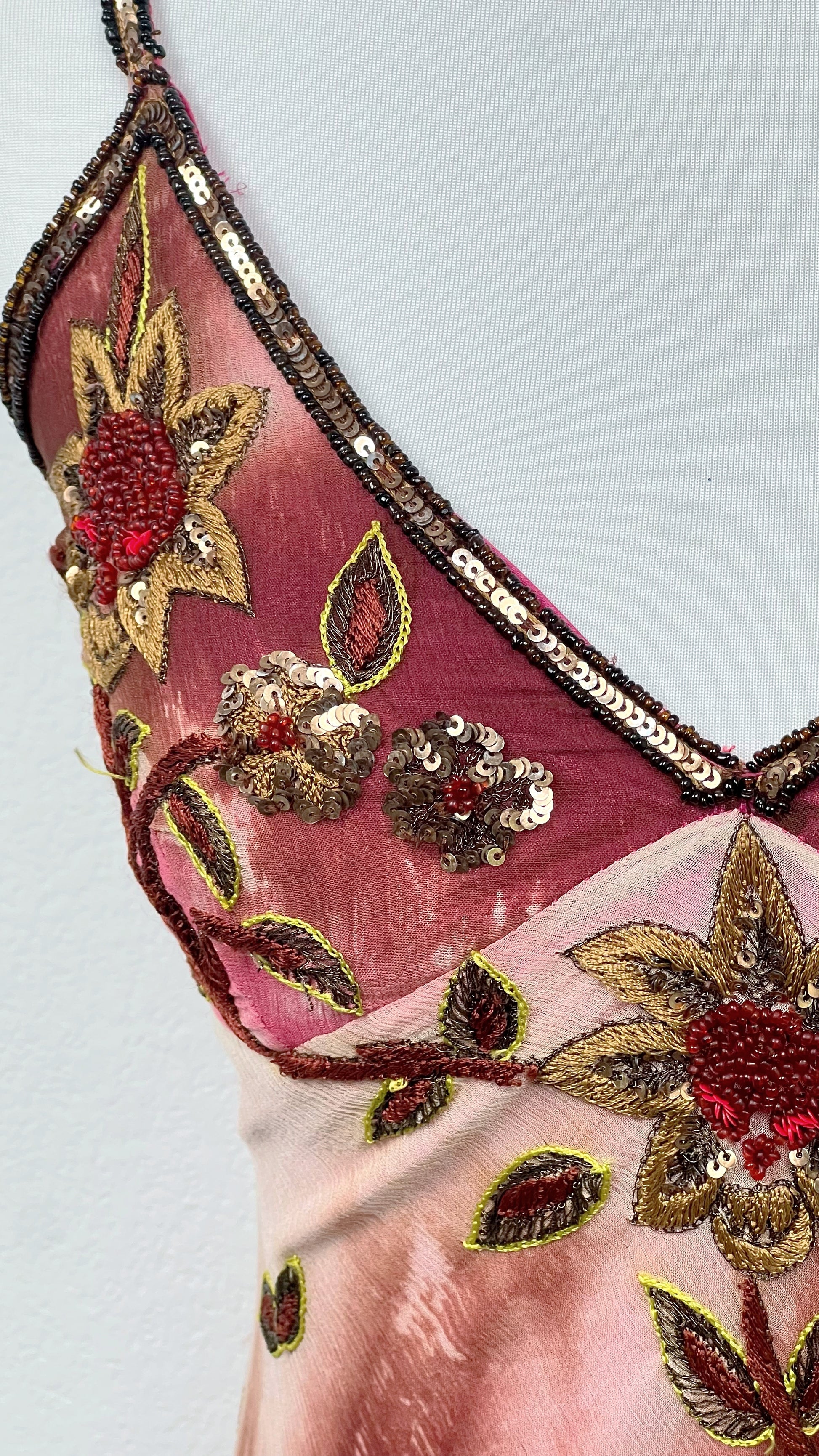 Color: Rosé-brown gradient with multicolored beaded floral embroidery