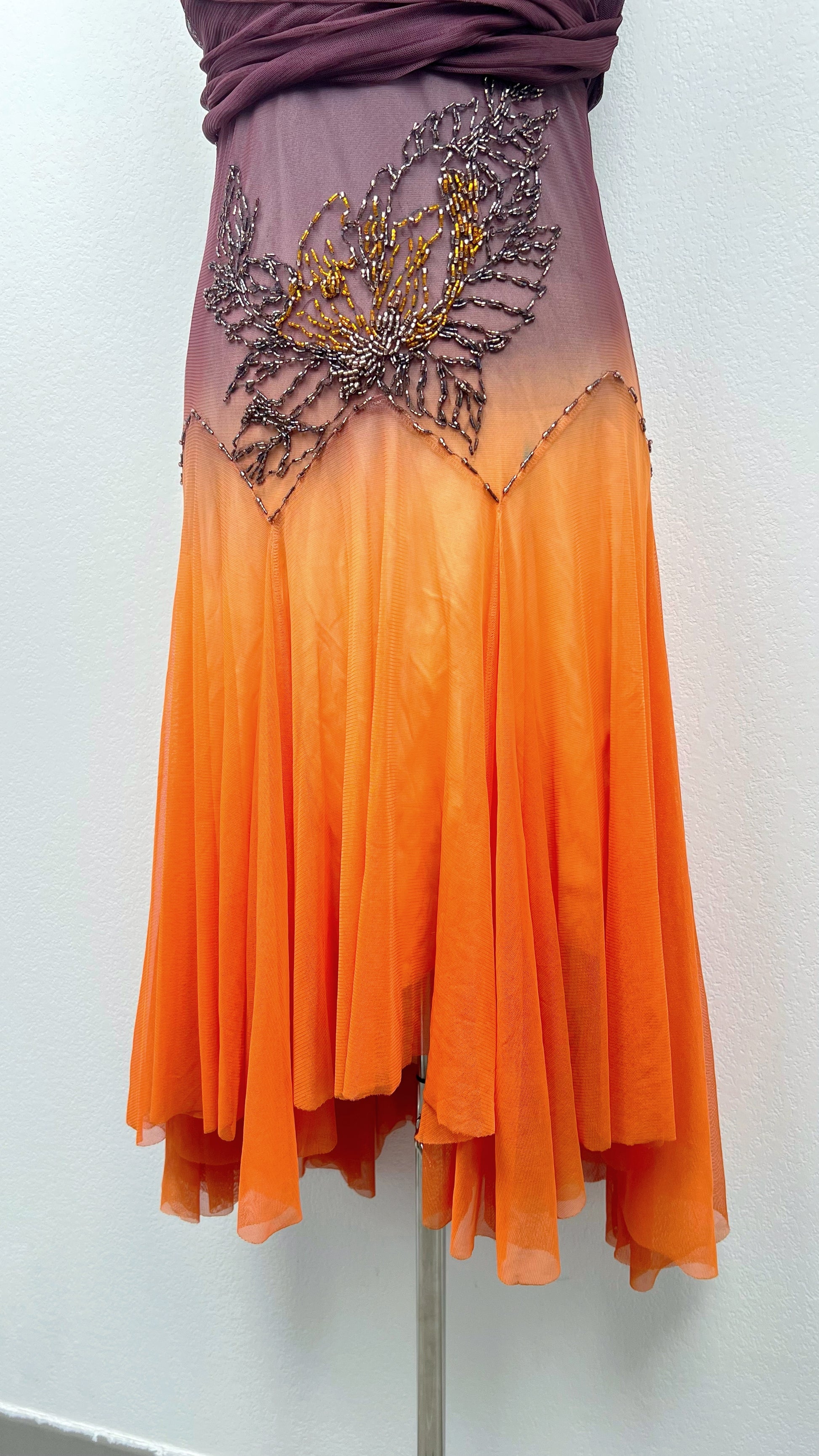 Details: artisanal beading, burgundy-to-orange ombré gradient, airy skirt