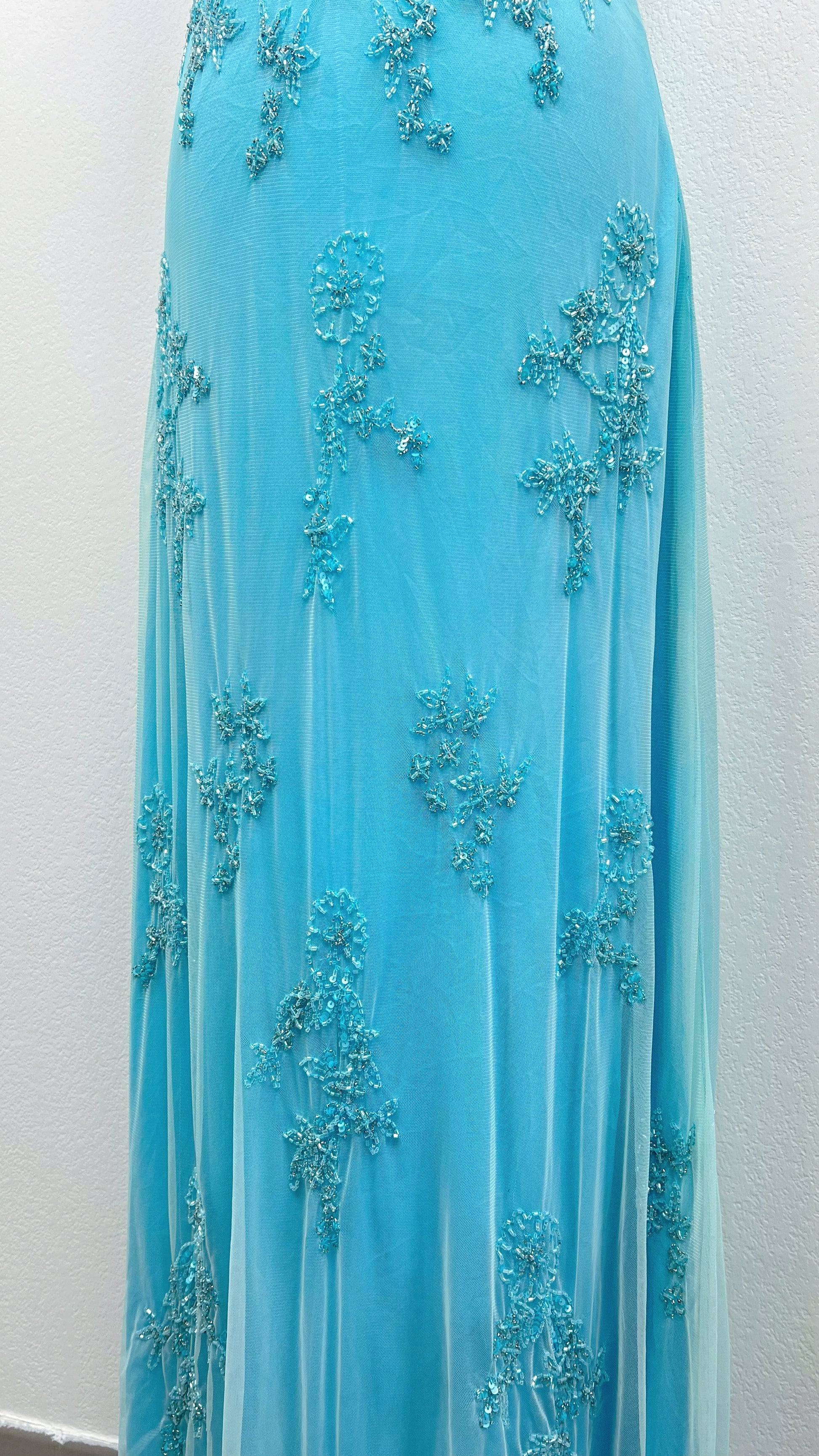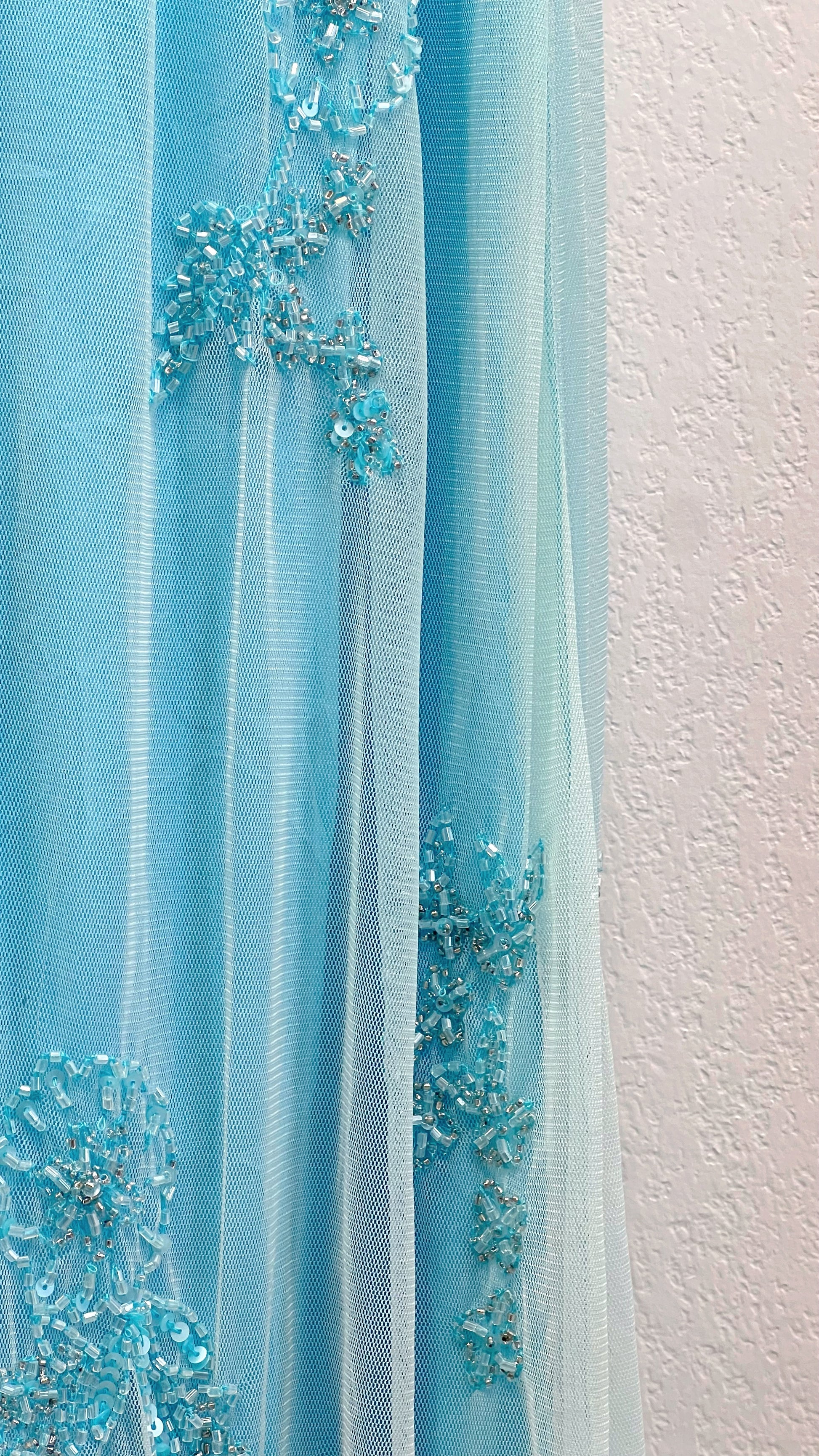 An exceptional gown crafted entirely from natural silk, of rare delicacy. Its luminous azure-blue shade evokes clear skies and crystal waters, while the silk veil is fully adorned with fine, tone-on-tone beaded embroidery that catches the light with subtle elegance.