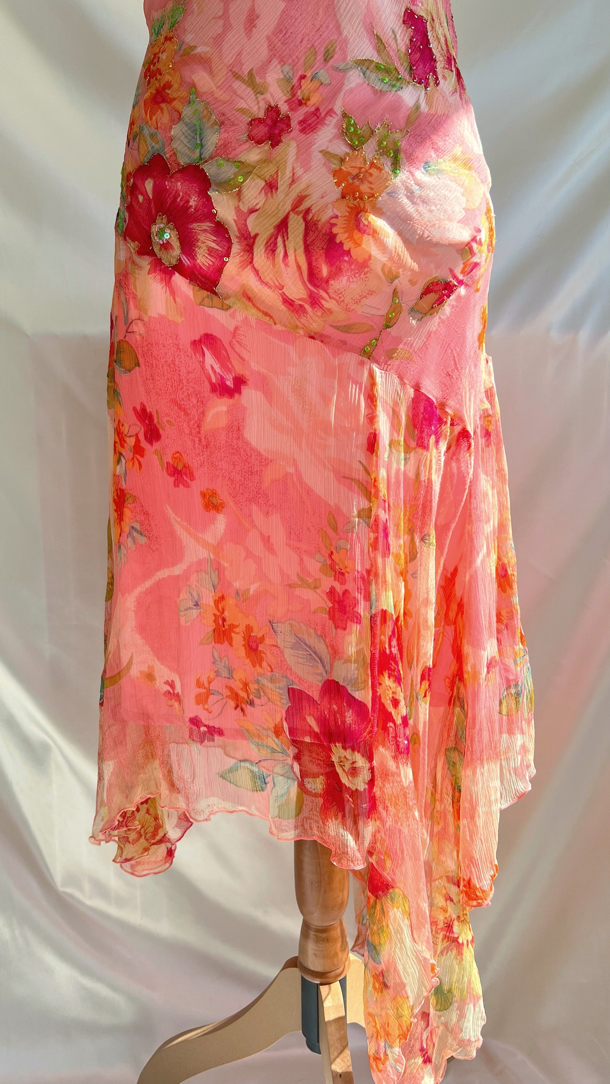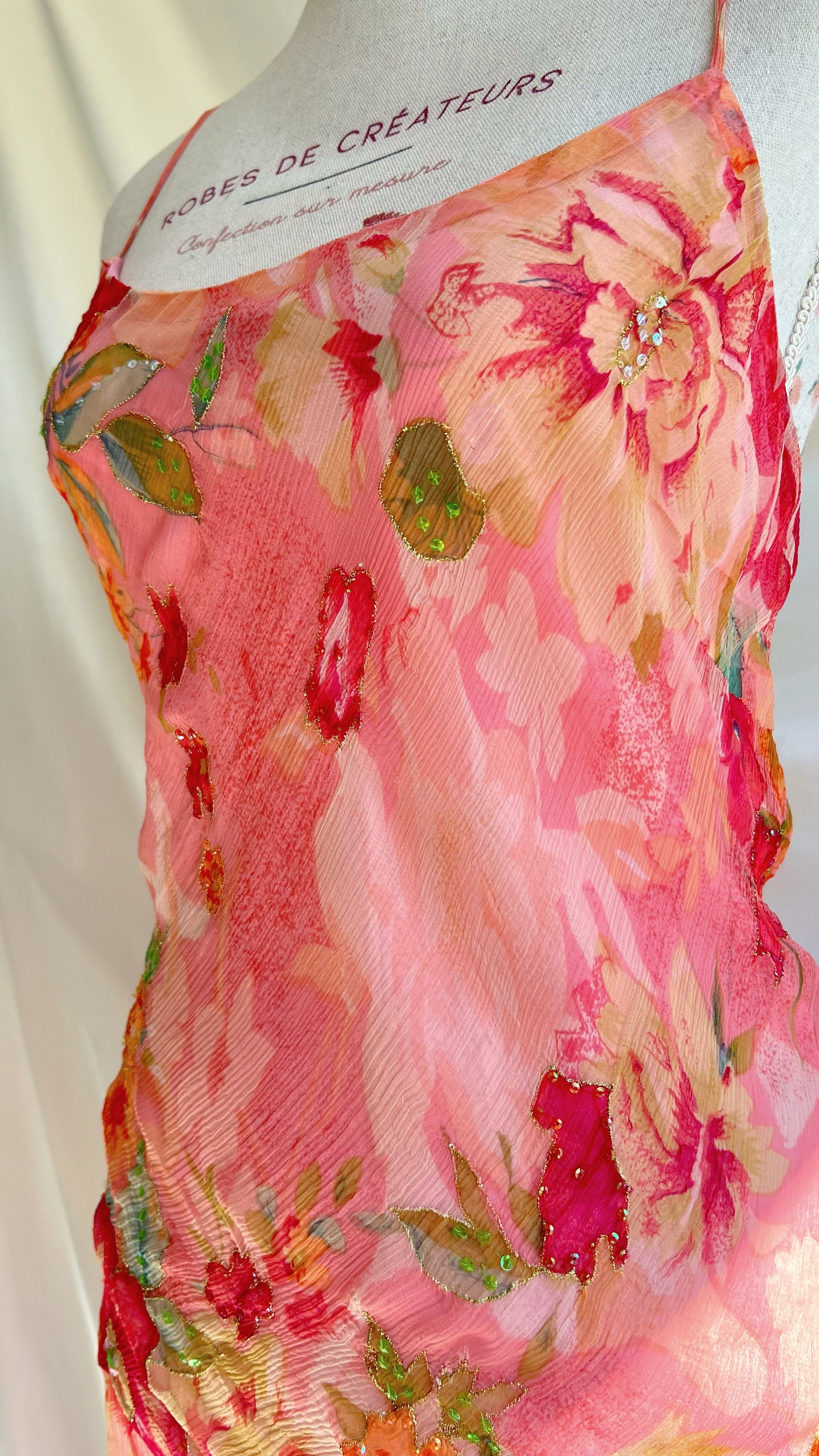 The material gently hugs the body, and each step makes the pearly threads shiver.