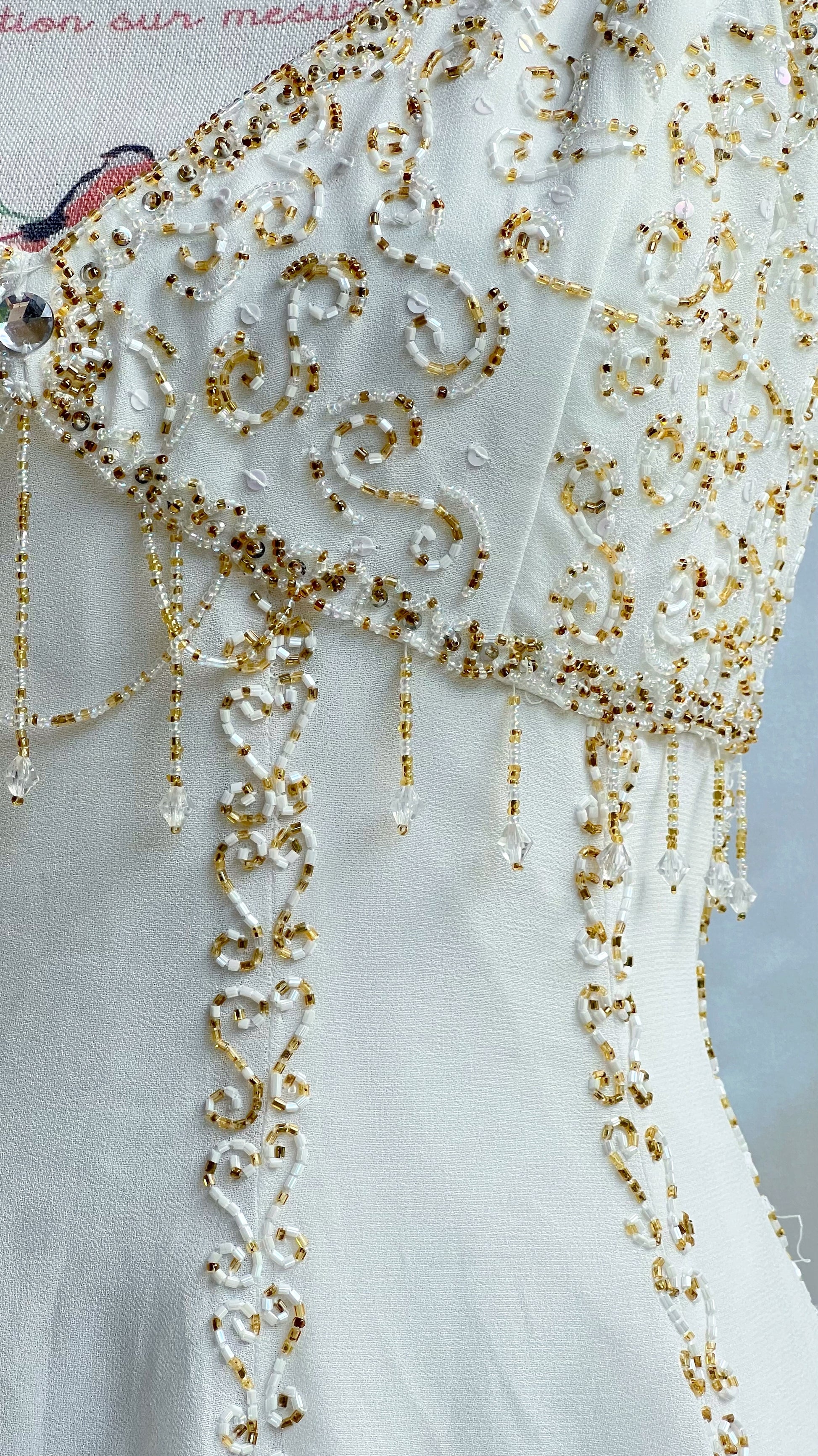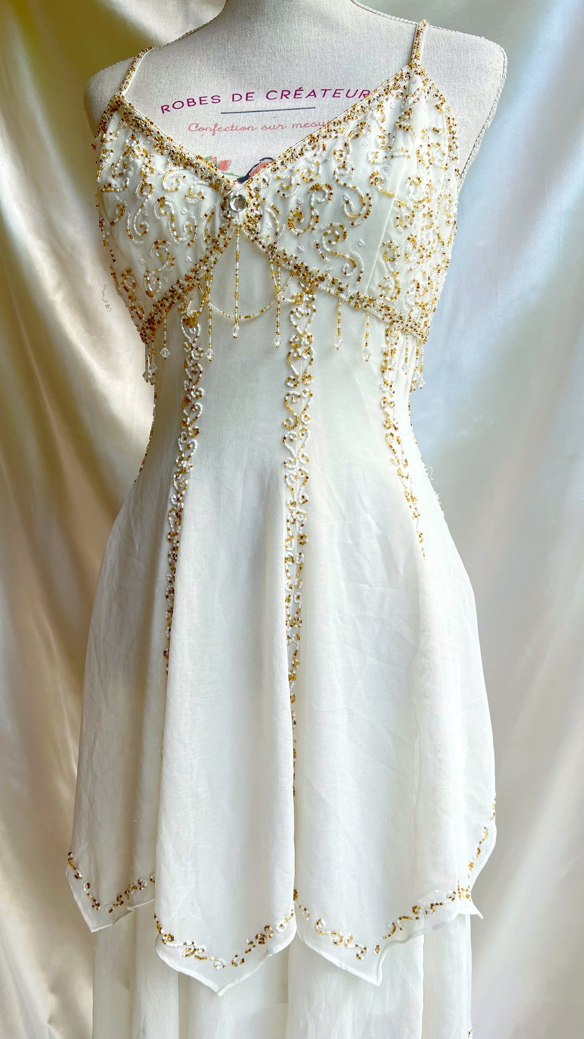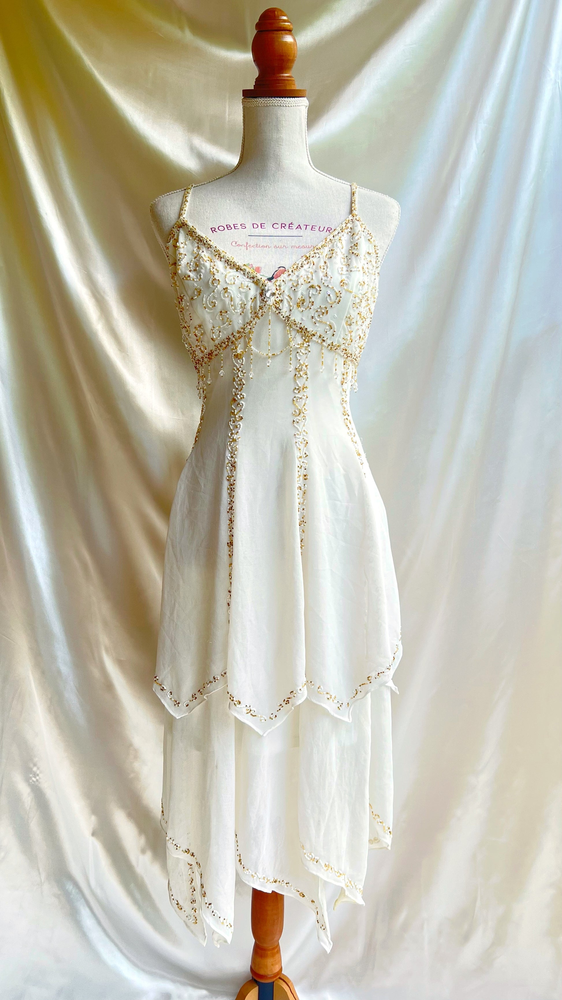 Details: Thin straps, embroidery and gold beads, pointed cut, lined
