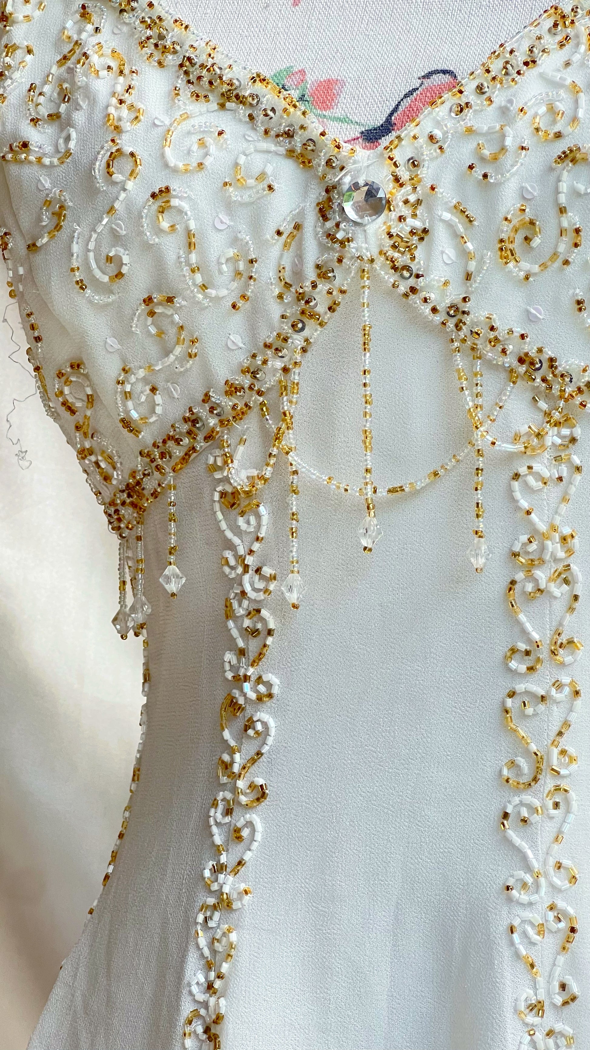 Composition: Not specified (lined flowing veil, hand-sewn beads)