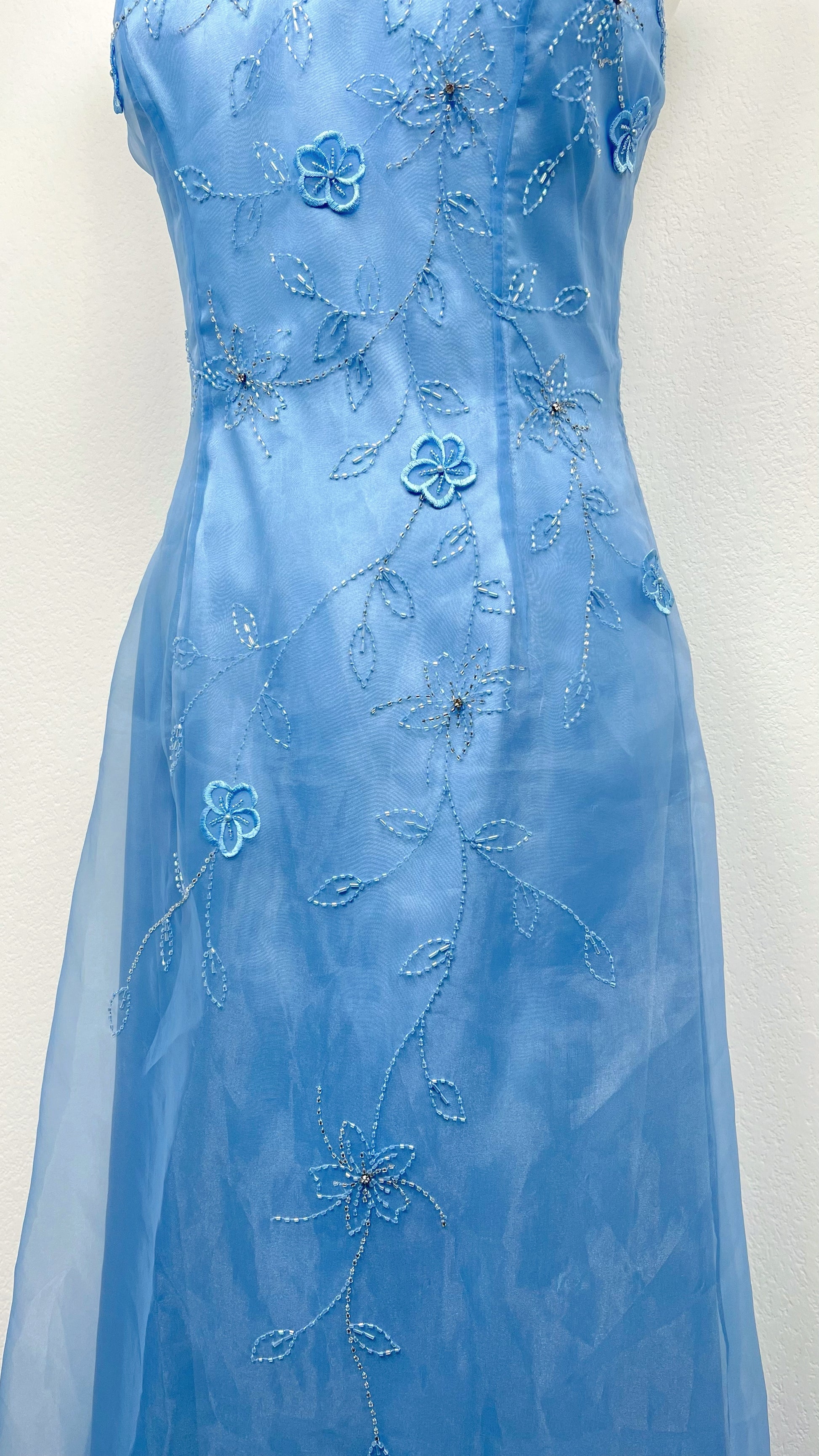 Fairy princess long dress in sky blue, size M/L. Its airy, slightly sheer fabric gives it a celestial allure, while delicate beaded floral embroidery adds a touch of magic and refinement. The flowing, elegant cut elongates the silhouette and evokes the world of fairytales. A rare piece, perfect for a modern ball, a dreamlike evening, or any moment where one wishes to shine with grace.