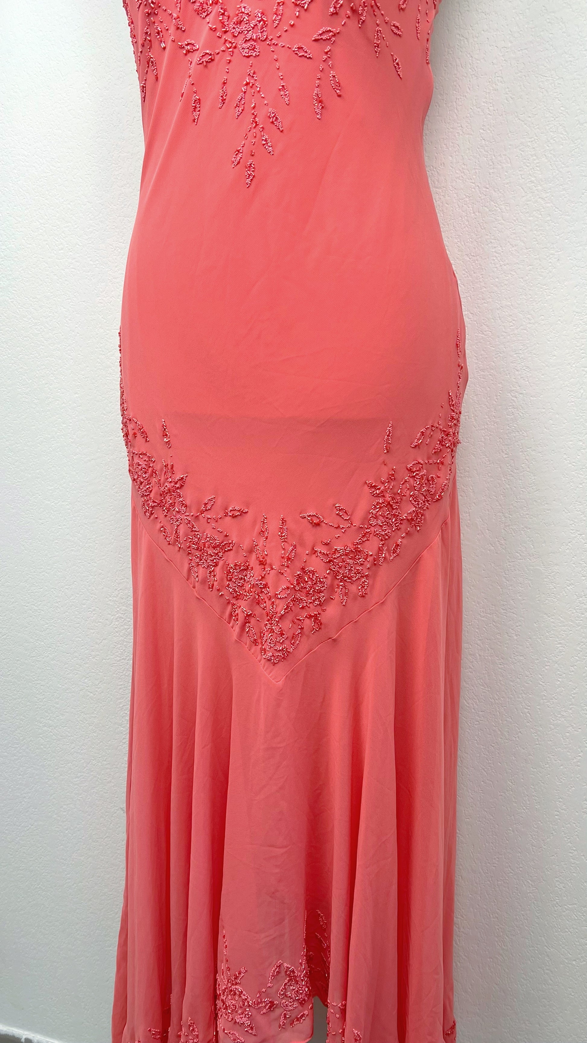 A designer dress by Yve London in 100% silk, in a vibrant coral pink that instantly lights up the silhouette.