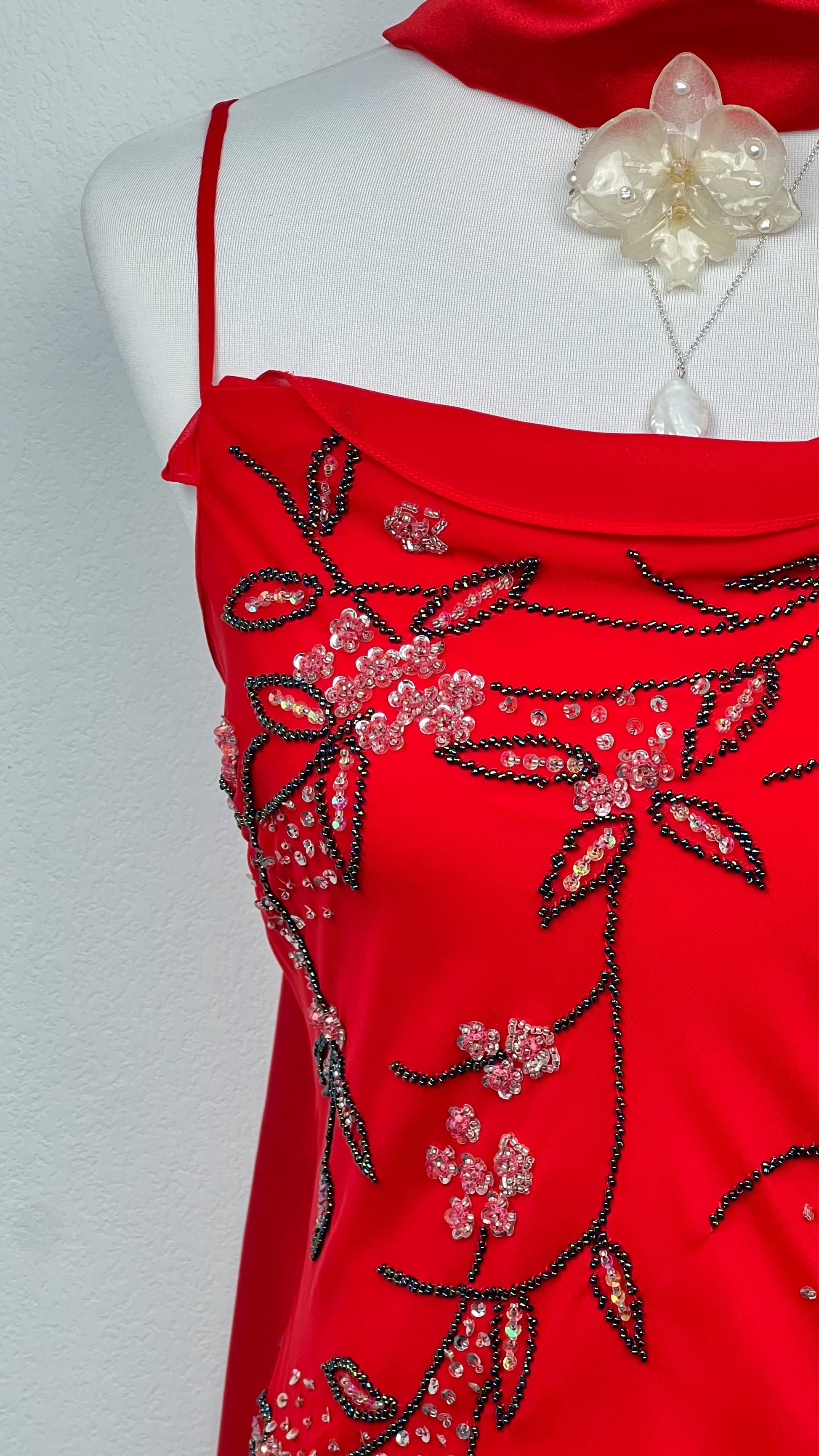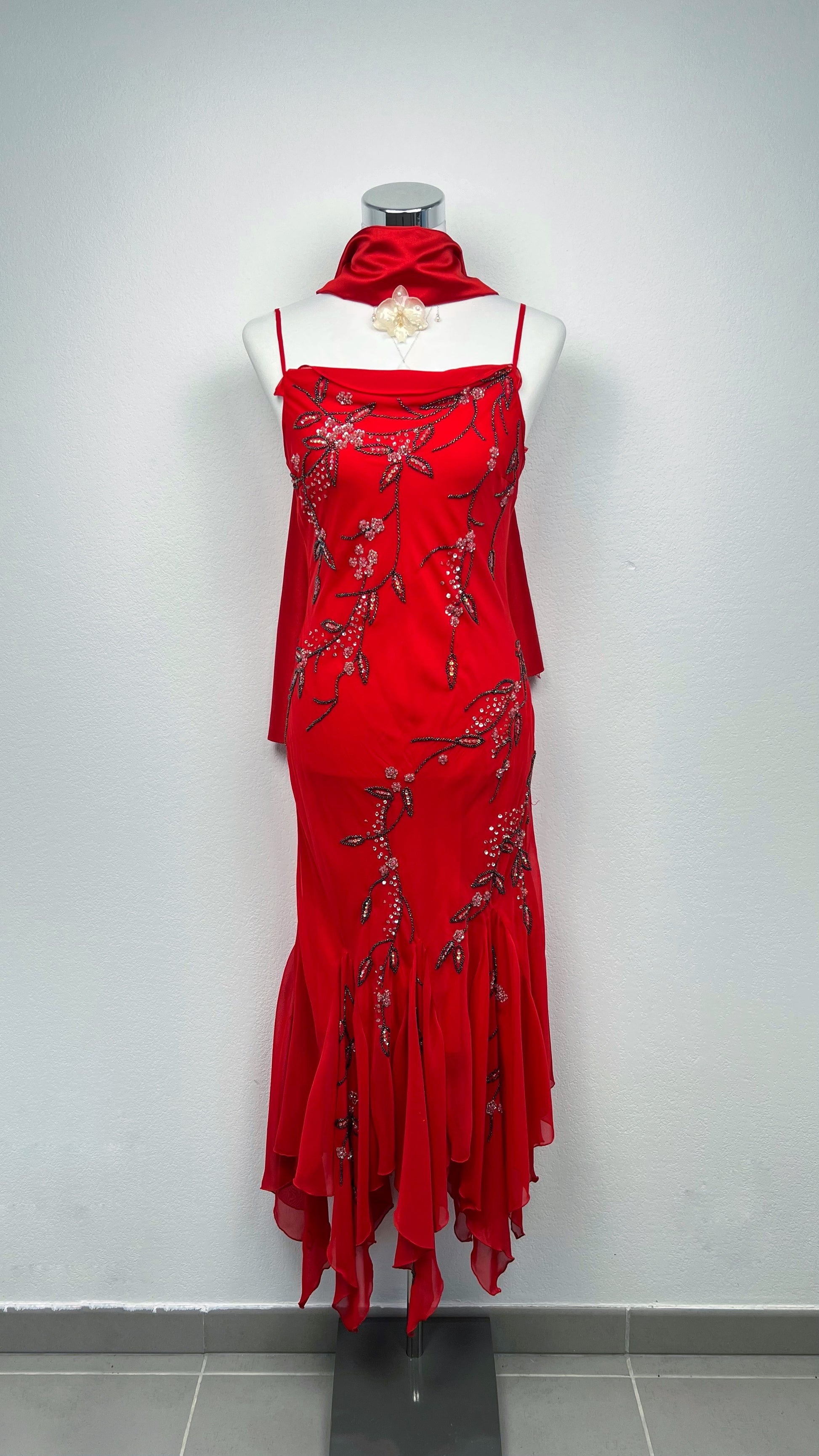 Spectacular designer dress in 100% silk, fully hand-beaded, accompanied by its matching shawl for an even more elegant look.