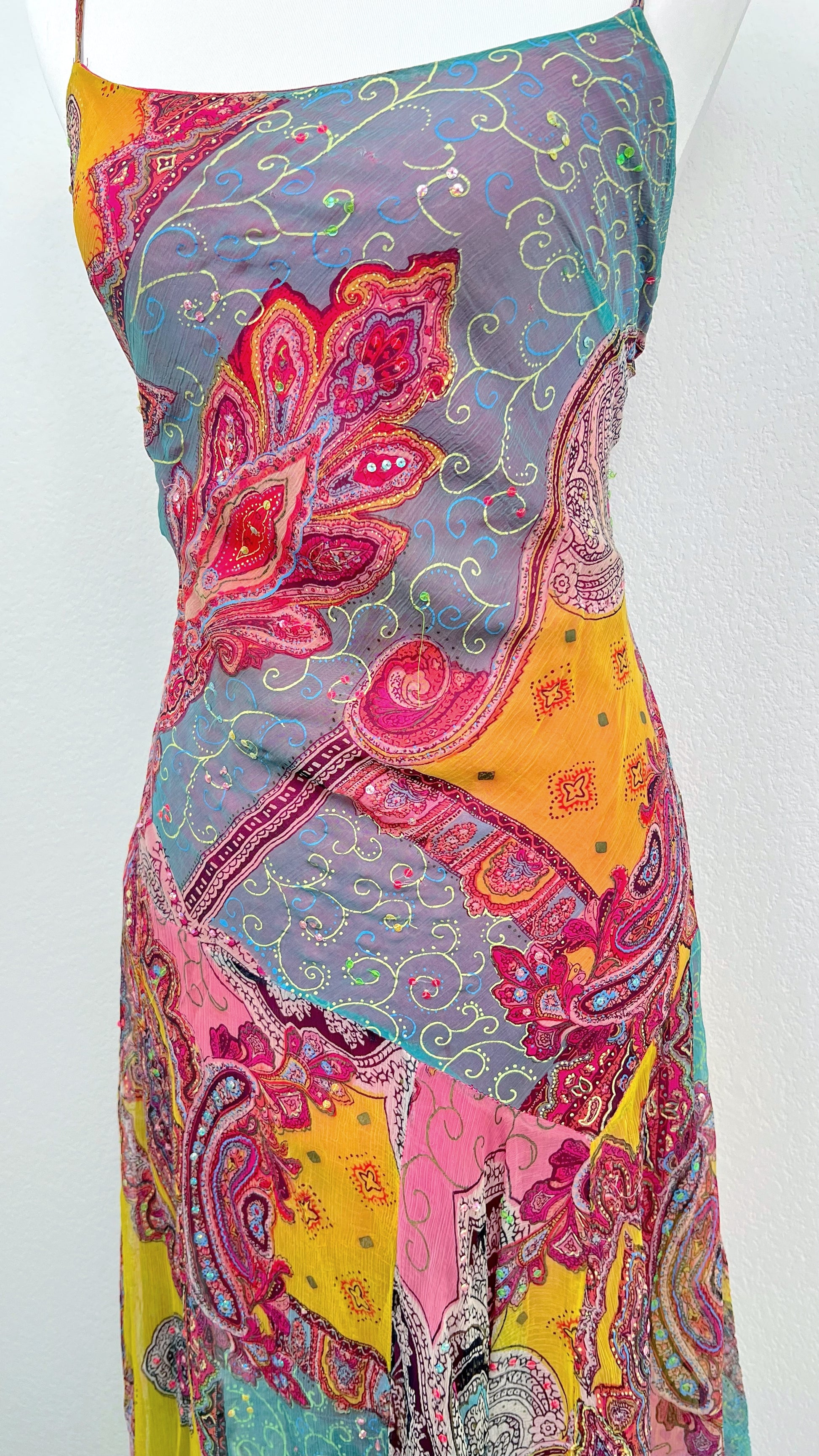 Signed by René Derhy, it blends vibrant paisley prints with sparkling beaded embroidery, as if every detail had been sprinkled with magic. Its fairy-like, flowing, asymmetrical cut creates an airy movement, turning each step into a poetic escape.