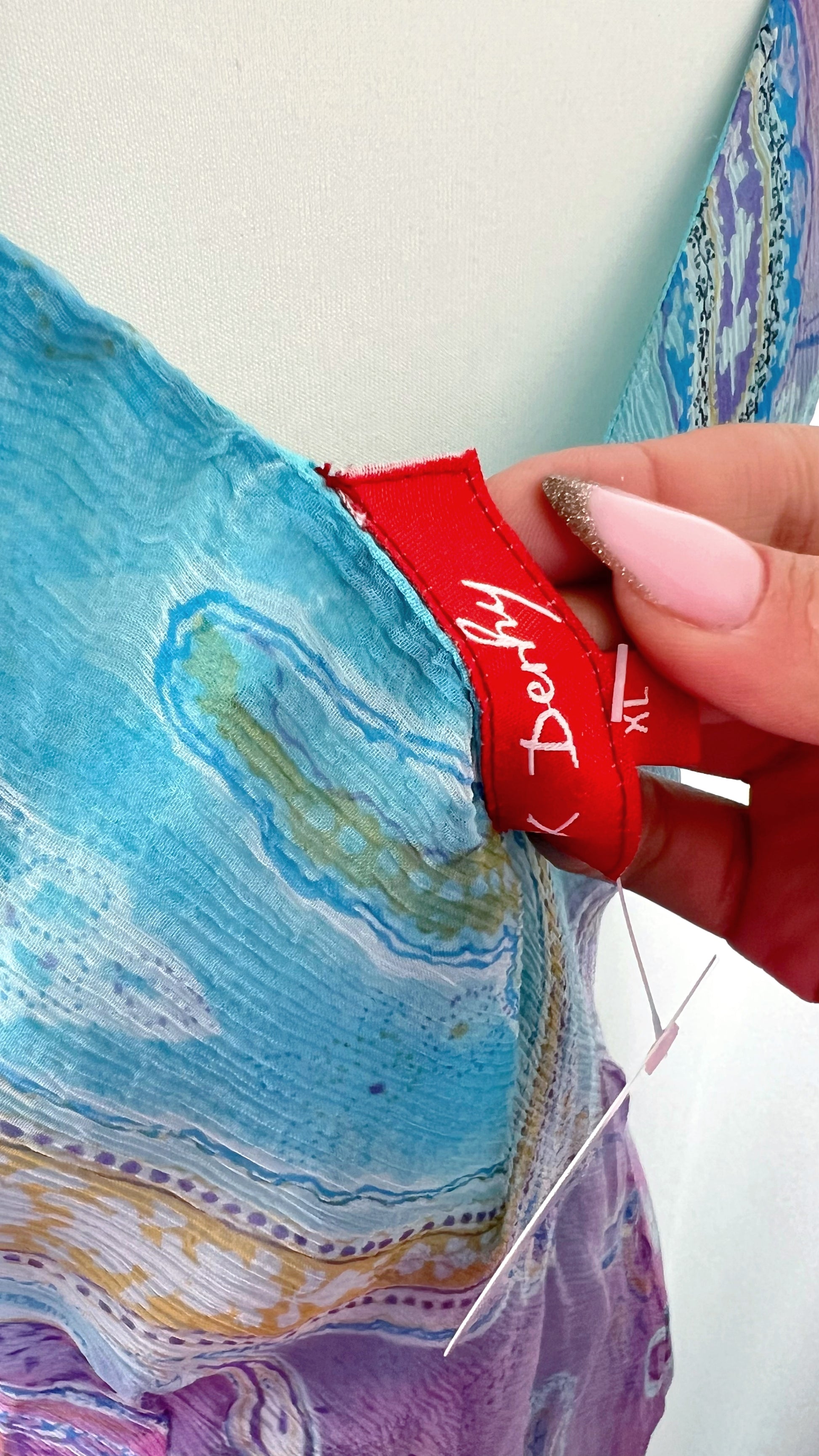 • Details: Gradient print, subtle beaded accents, asymmetrical cut