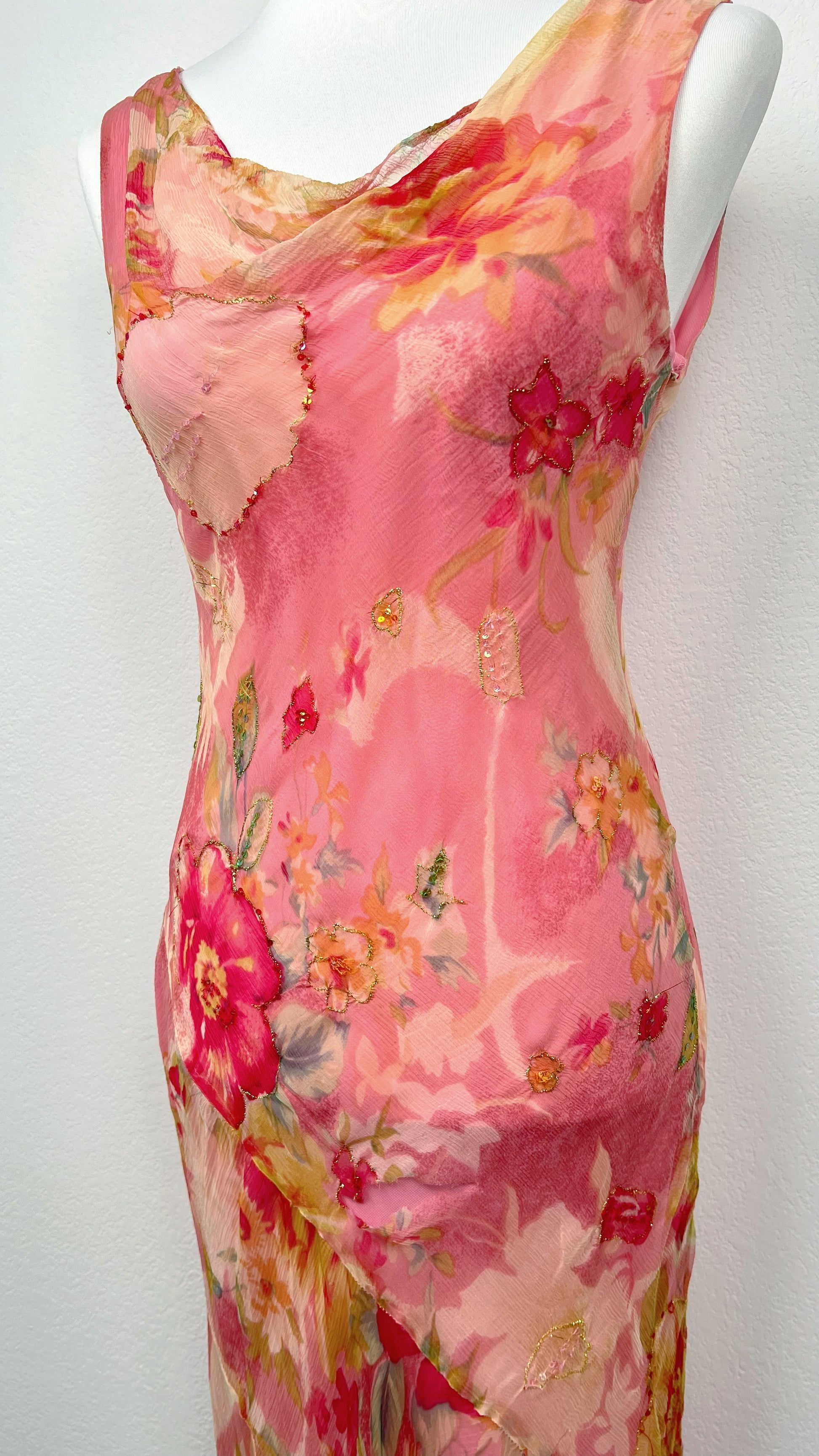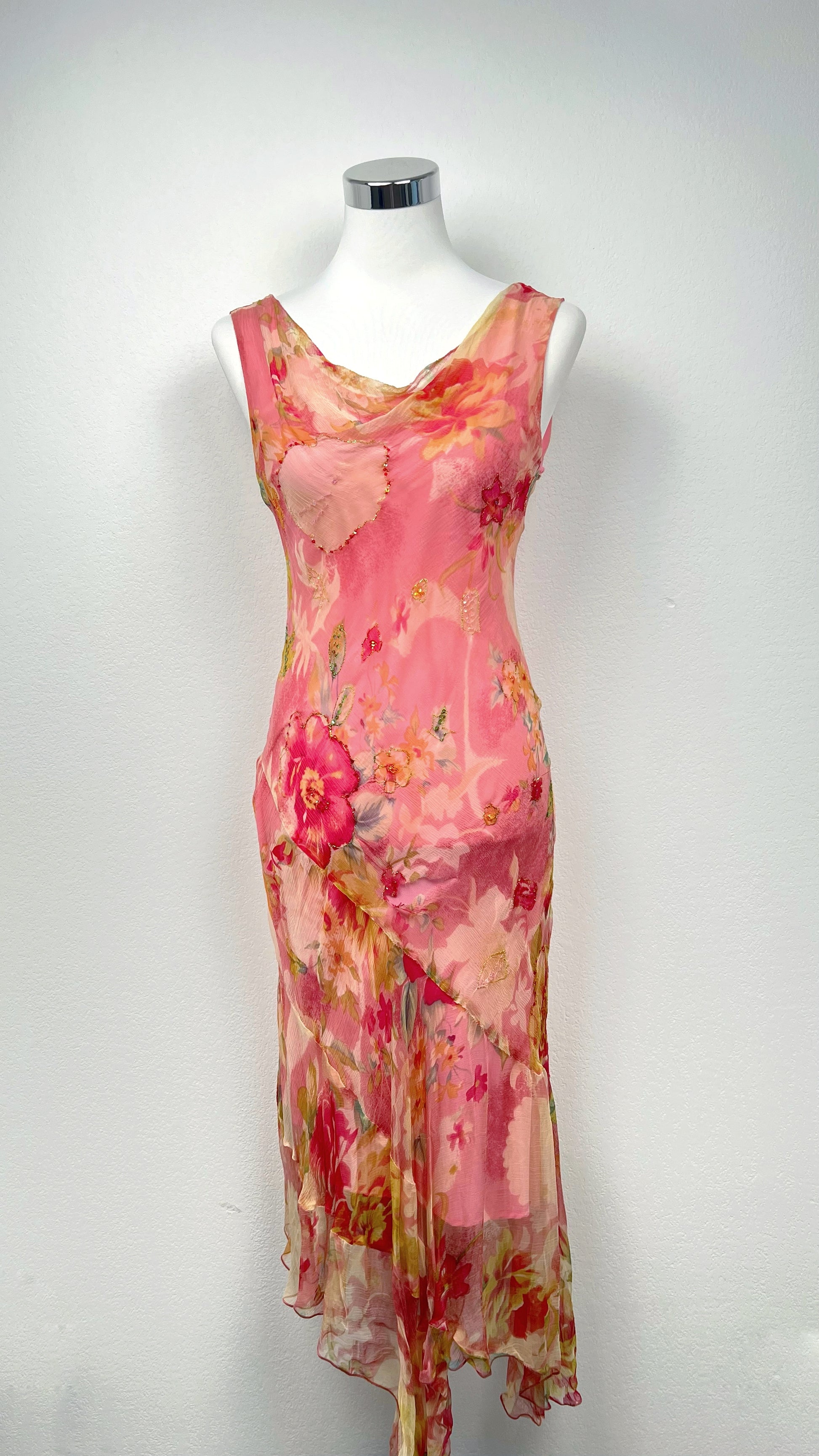 Details: luminous floral print, tie straps, flowing asymmetrical cut