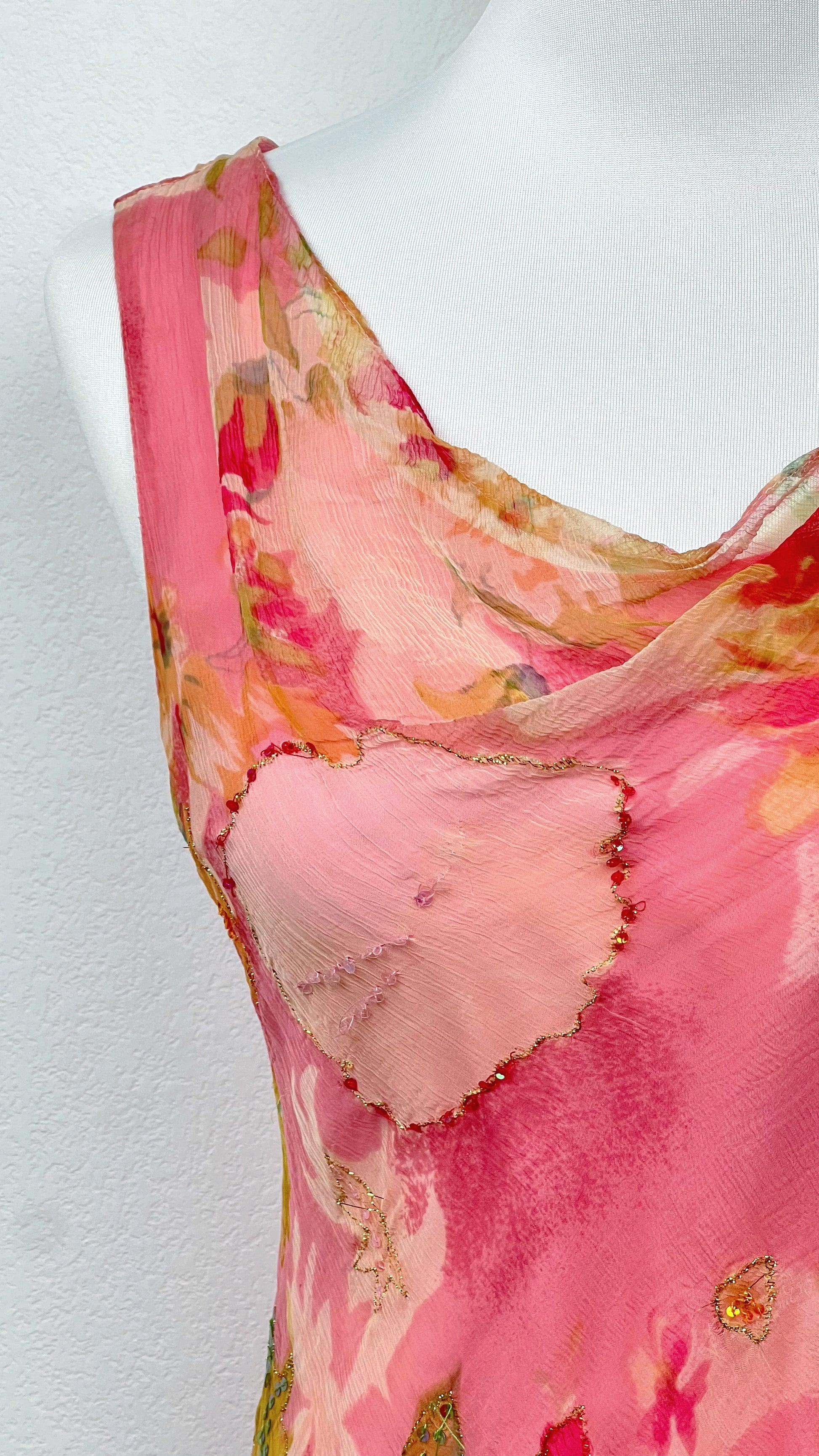 The Rosalie Garden Dress is an extremely rare and one-of-a-kind creation by Derhy, crafted in 100% lightweight viscose. Its shades of powder pink and vibrant floral prints recall a blooming garden bathed in summer light.