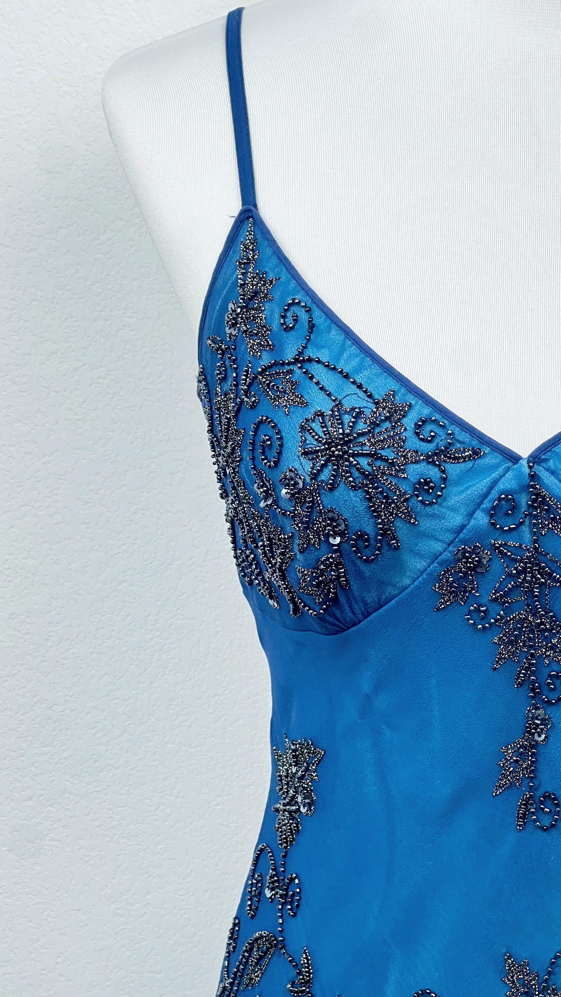Its electric blue hue captures the light with hypnotic intensity, while delicate beadwork and embroidery trace refined arabesques along the bodice and hem, like shimmering lace.