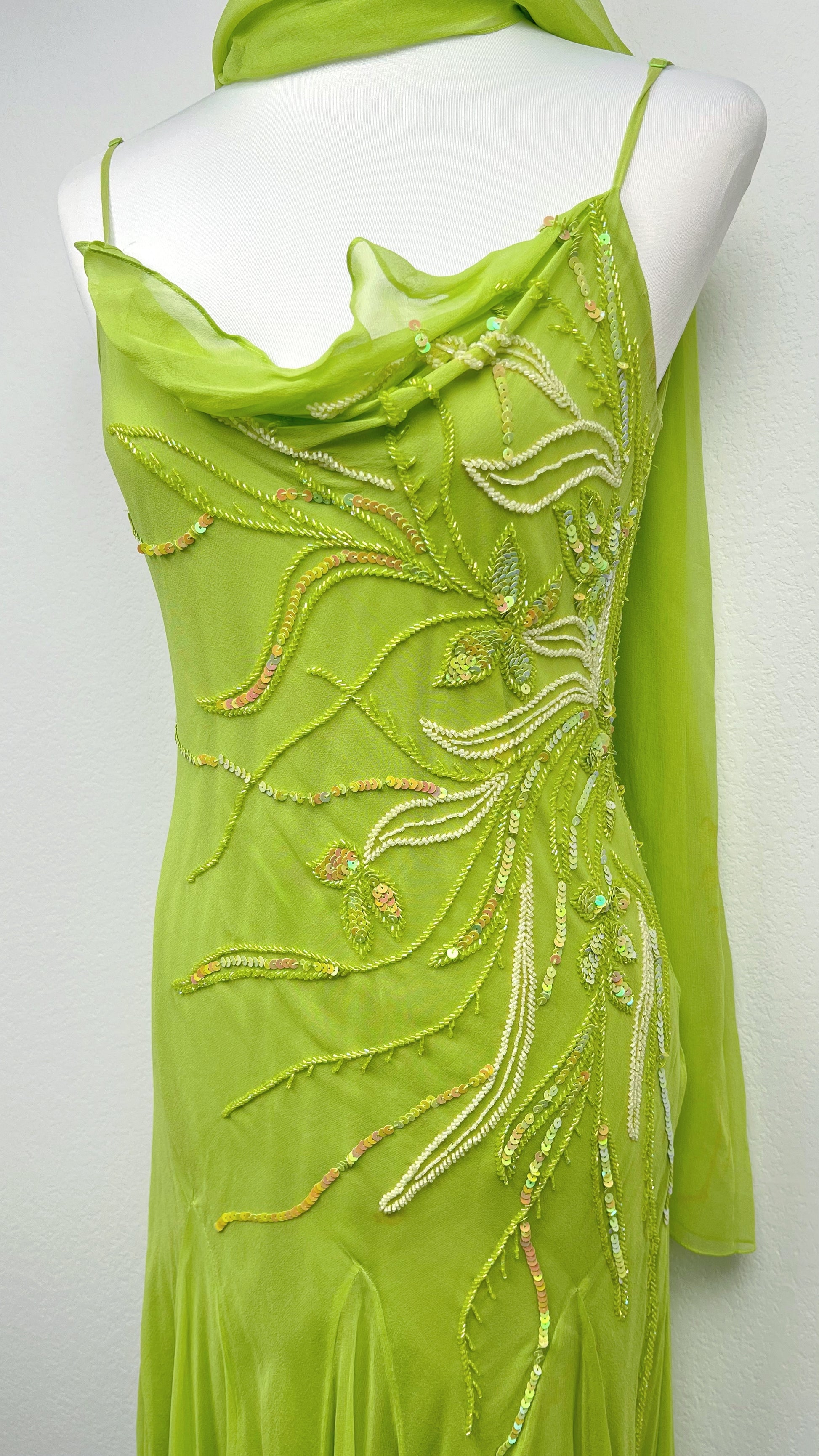 Its vibrant green, as radiant as a sunlit clearing, is adorned with delicate embroidery tracing shimmering arabesques across the silk. The flowing, dancing cut is accompanied by a matching shawl, adding a touch of timeless grace and elegance.