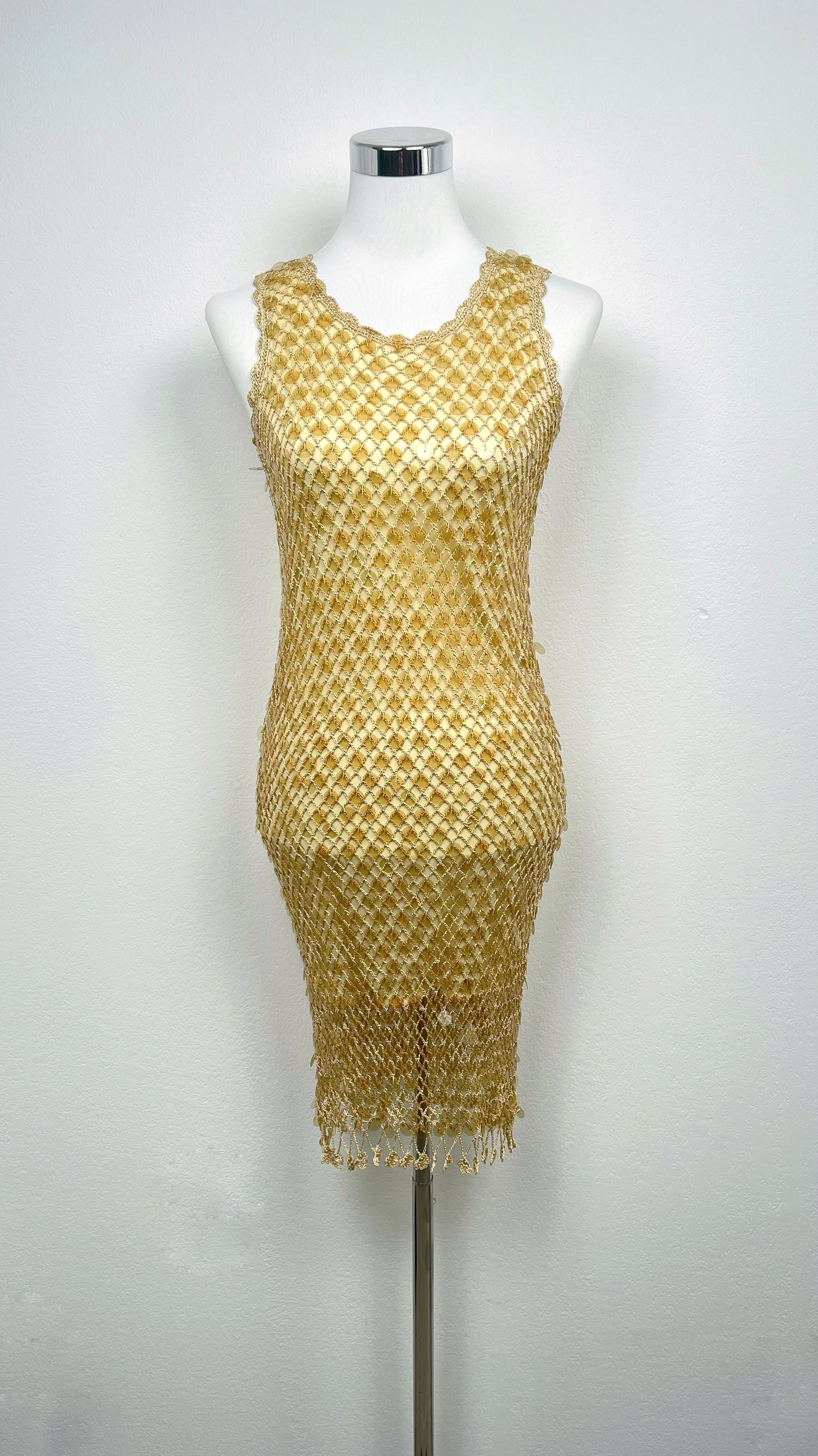 Golden sequin dress, size S/M. Entirely covered in a delicate shimmering weave, it embraces the curves with elegance and catches the light with every movement. Its beaded net effect and fringed hem give it both a glamorous and bohemian spirit—perfect for summer evenings or magical celebrations. A rare piece that turns every step into a starry sparkle.