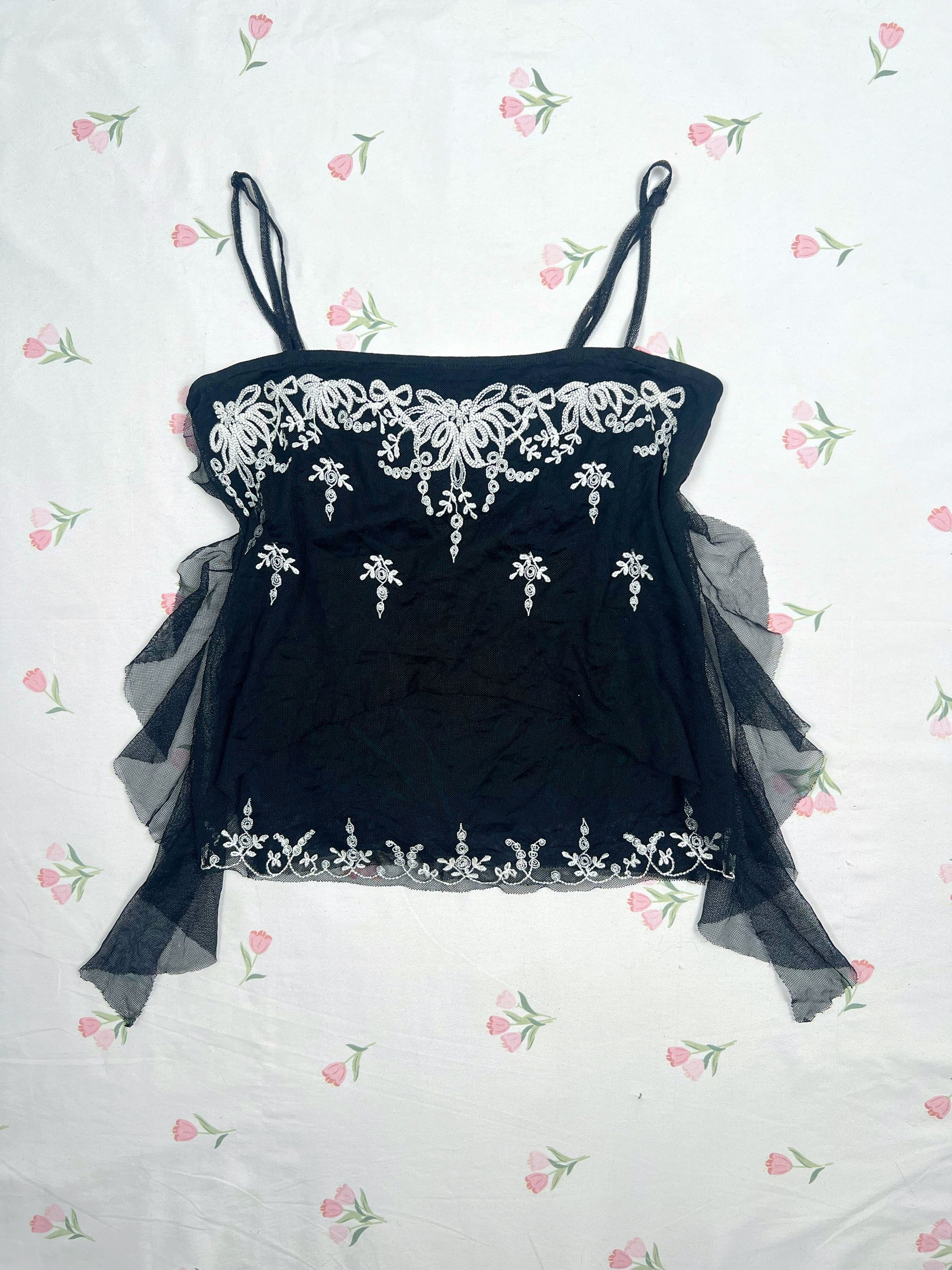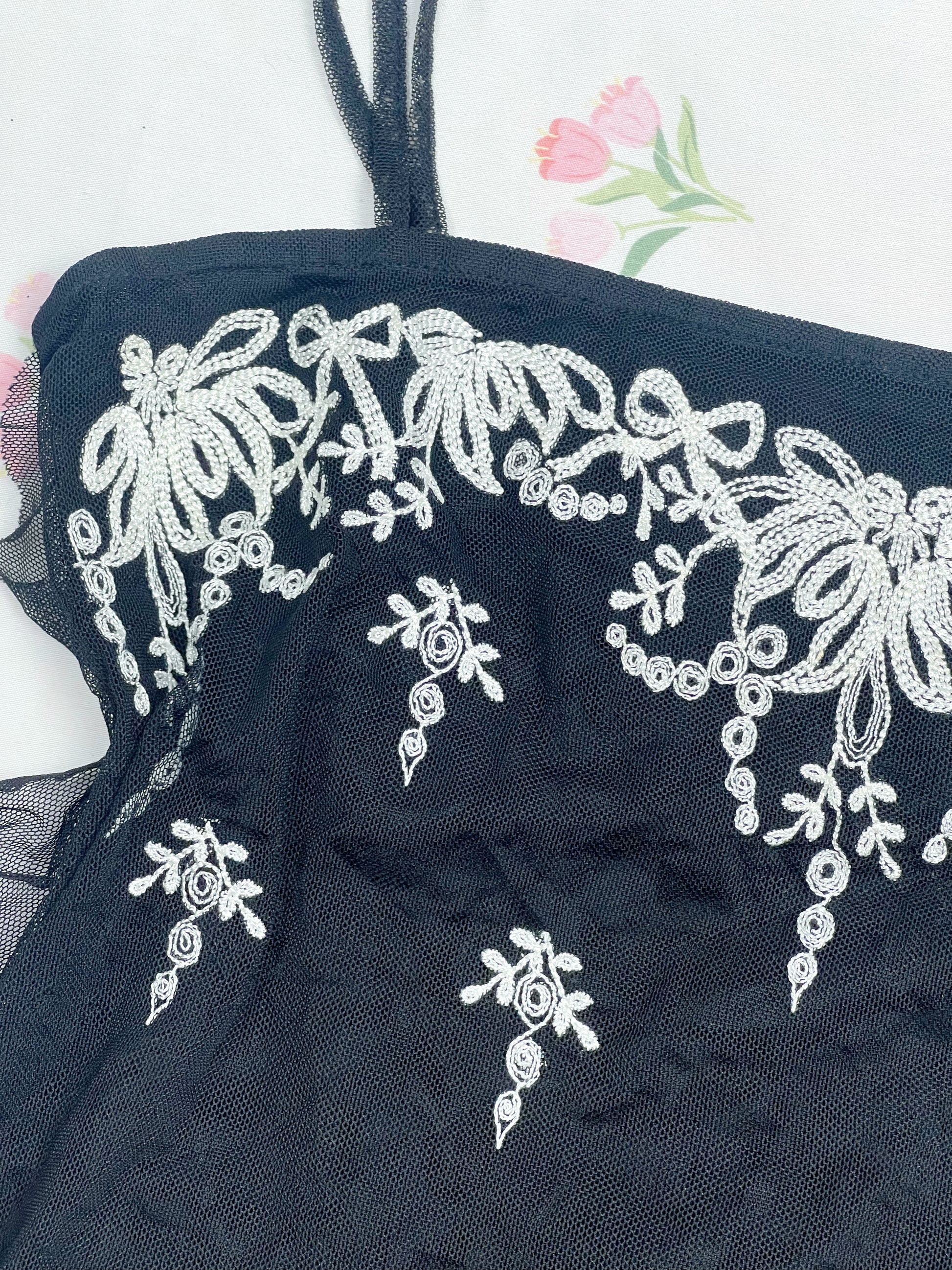 This black top, delicately embroidered with silver motifs, is adorned with tulle ruffles on the sides, creating an airy movement with every gesture. Its bustier cut with thin straps enhances the silhouette with elegance, while the embroidered details evoke the precious lace of a stage costume.