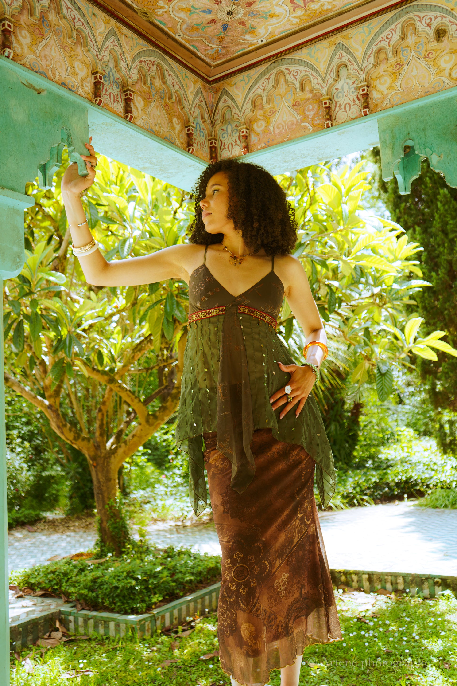 Scarlet Ivy is an asymmetrical burgundy dress with black highlights, adorned with dark red floral embroidery that curls like an enchanted vine.