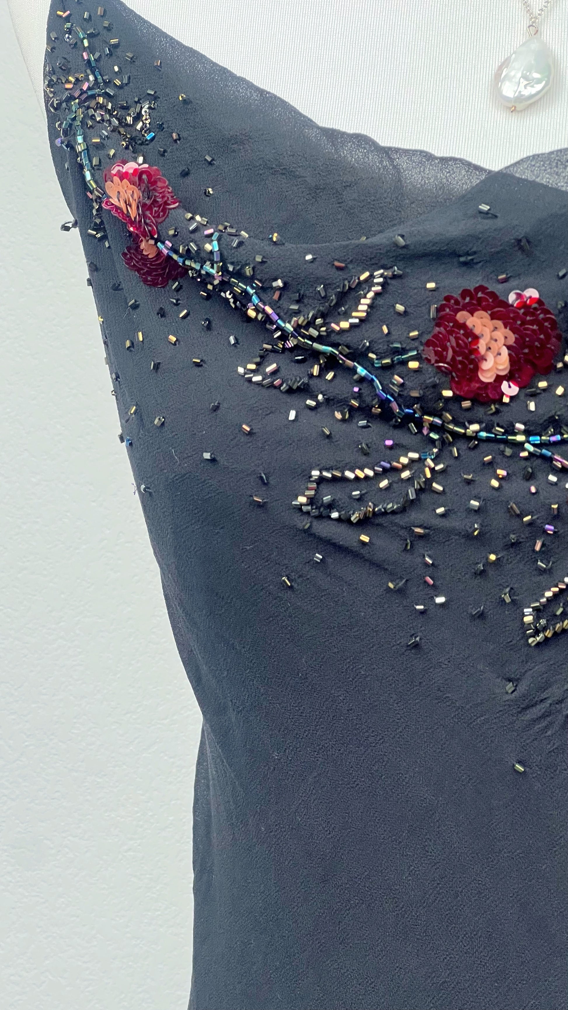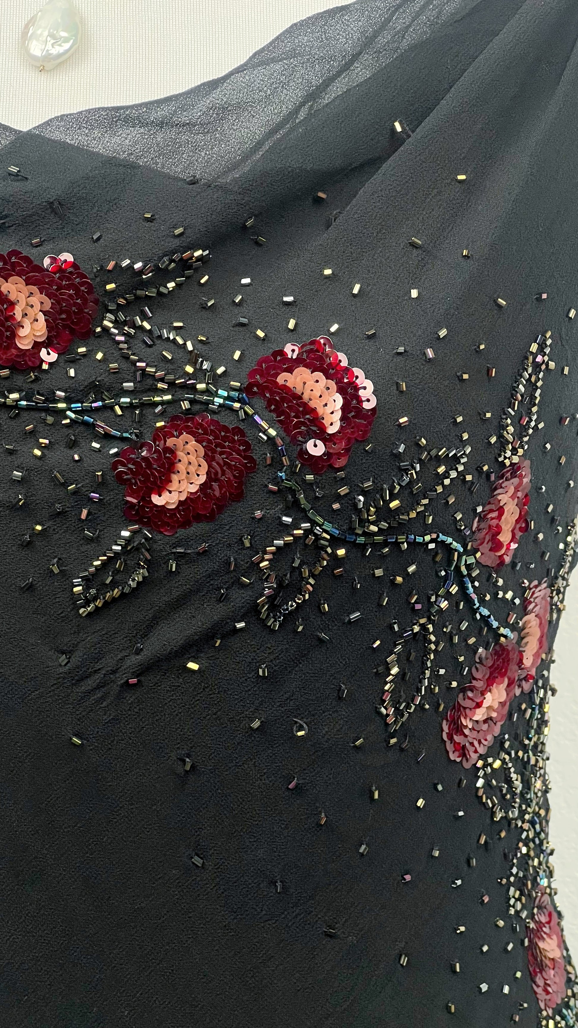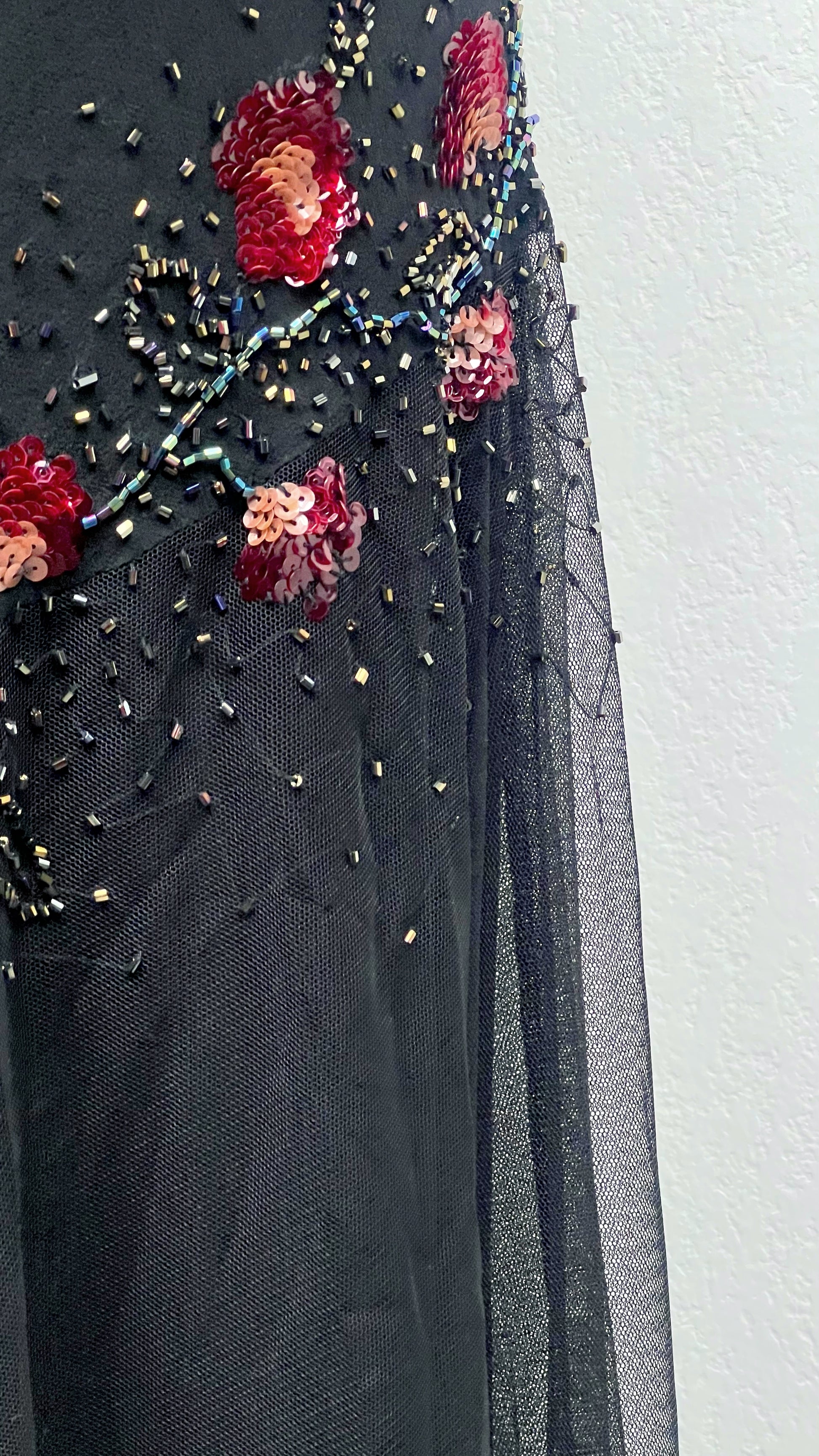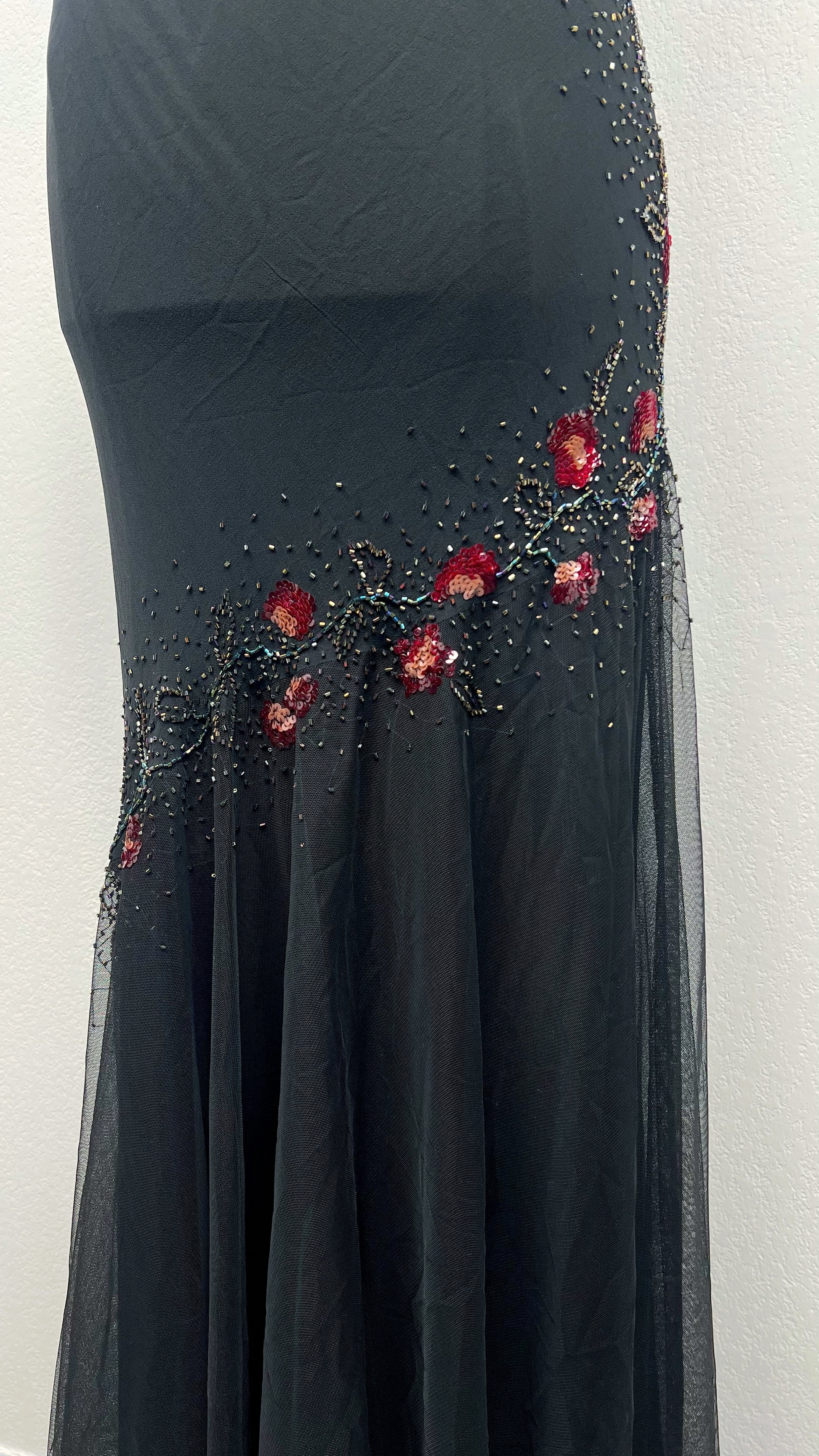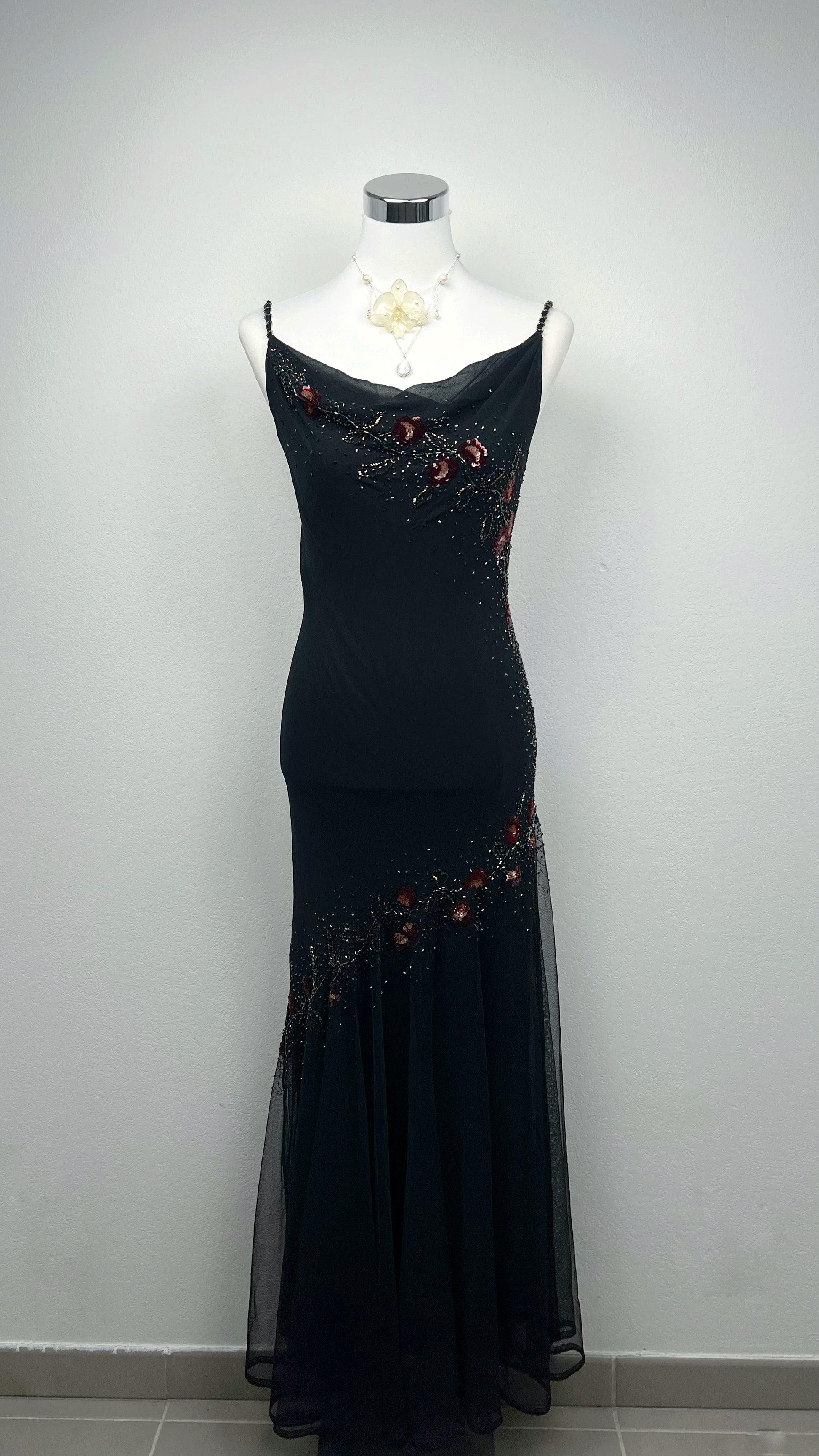 A long couture-inspired gown crafted in deep black and elevated with dark red flowers, hand-embroidered and beaded.