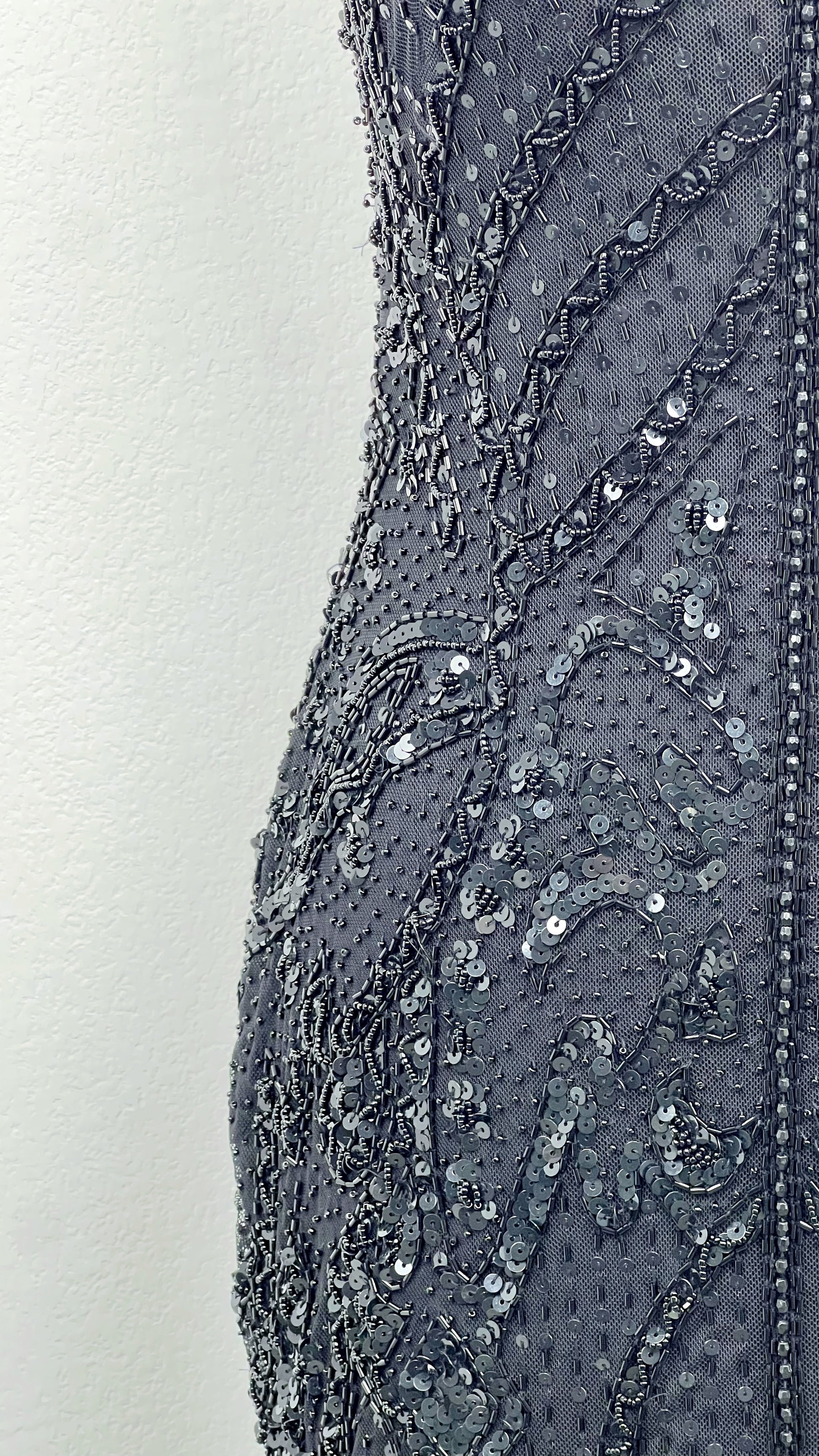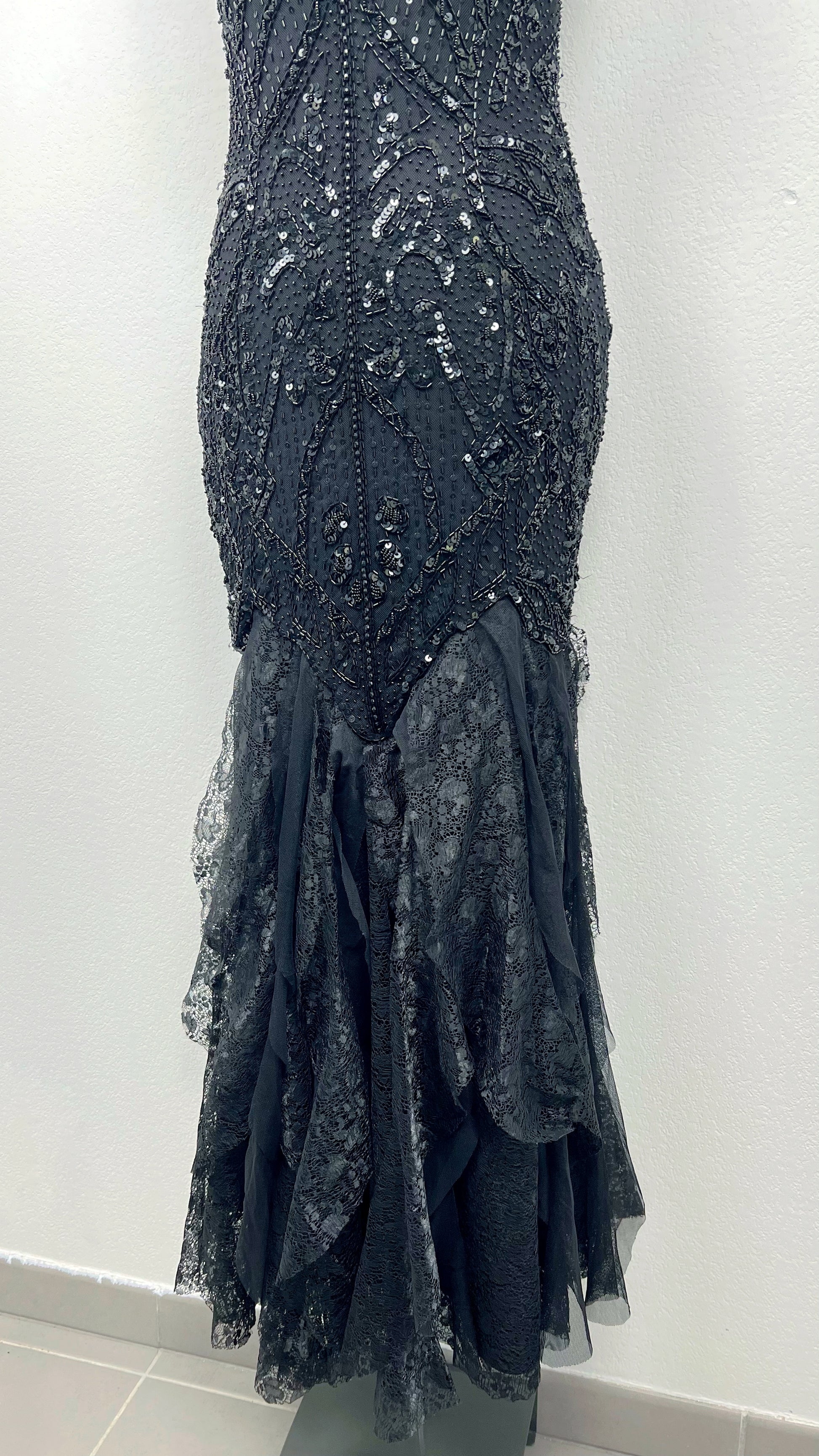 Its mermaid silhouette flatters the figure, while the hand-beaded embroidery shimmers subtly with every movement — like starlight scattered across an inky sky.
