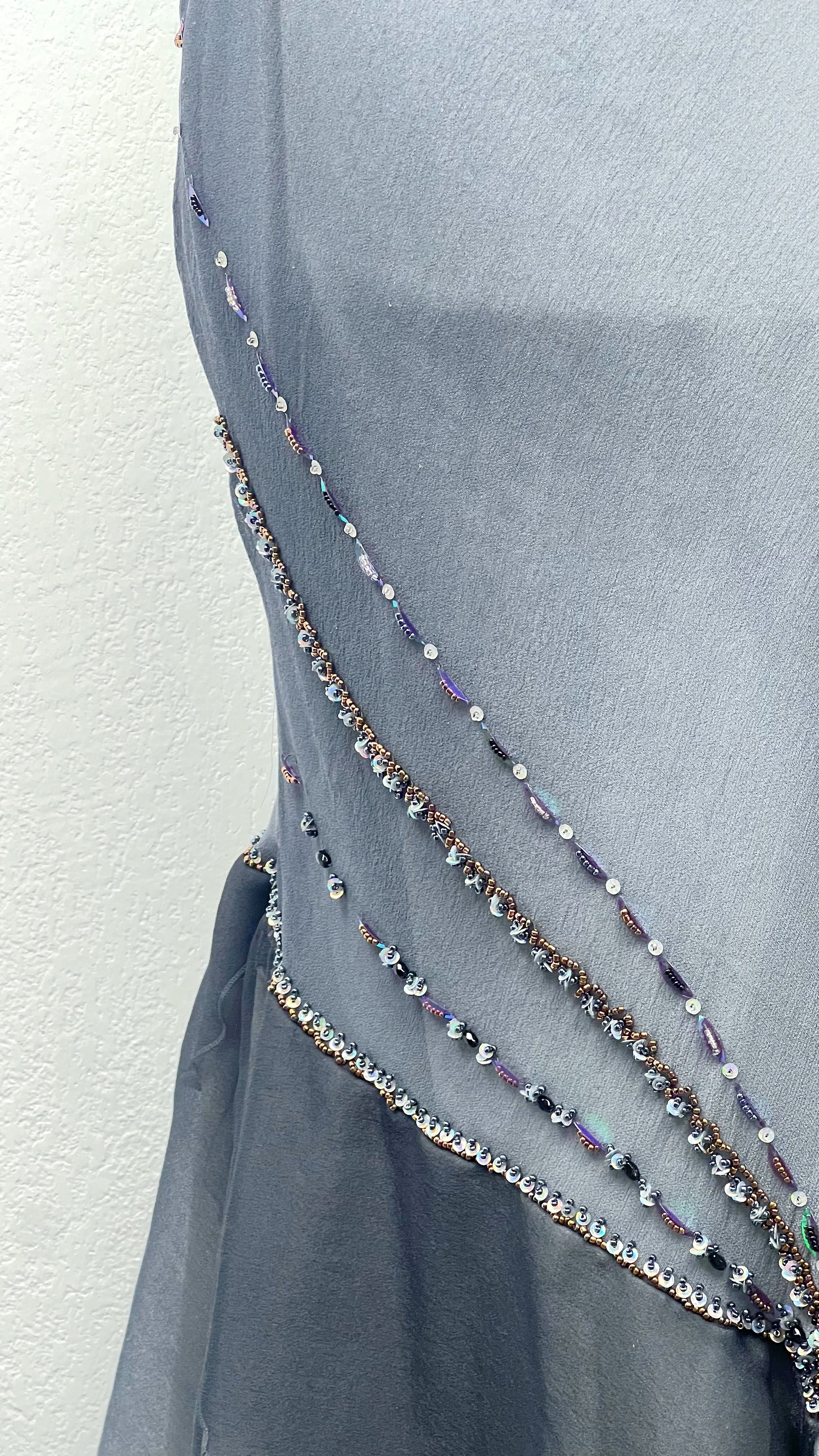 Details: artisanal embroidery and pearl beadwork, gray-blue gradient, flowing layered skirt