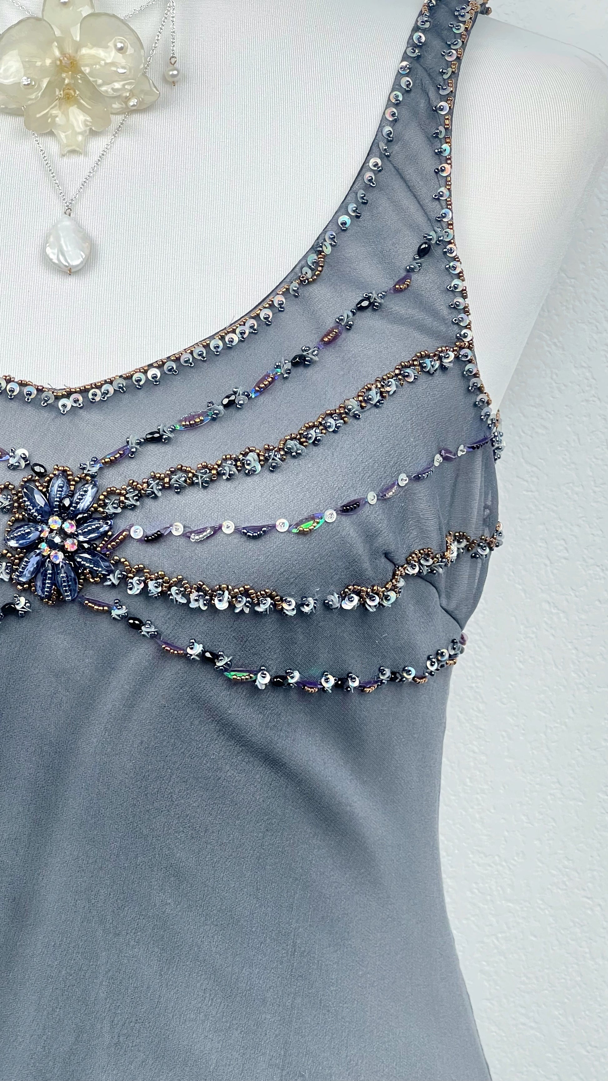 In fine, diaphanous silk, this rare piece weaves together shades of pearl gray and midnight blue, evoking the shifting reflections of the sea beneath a starry sky.