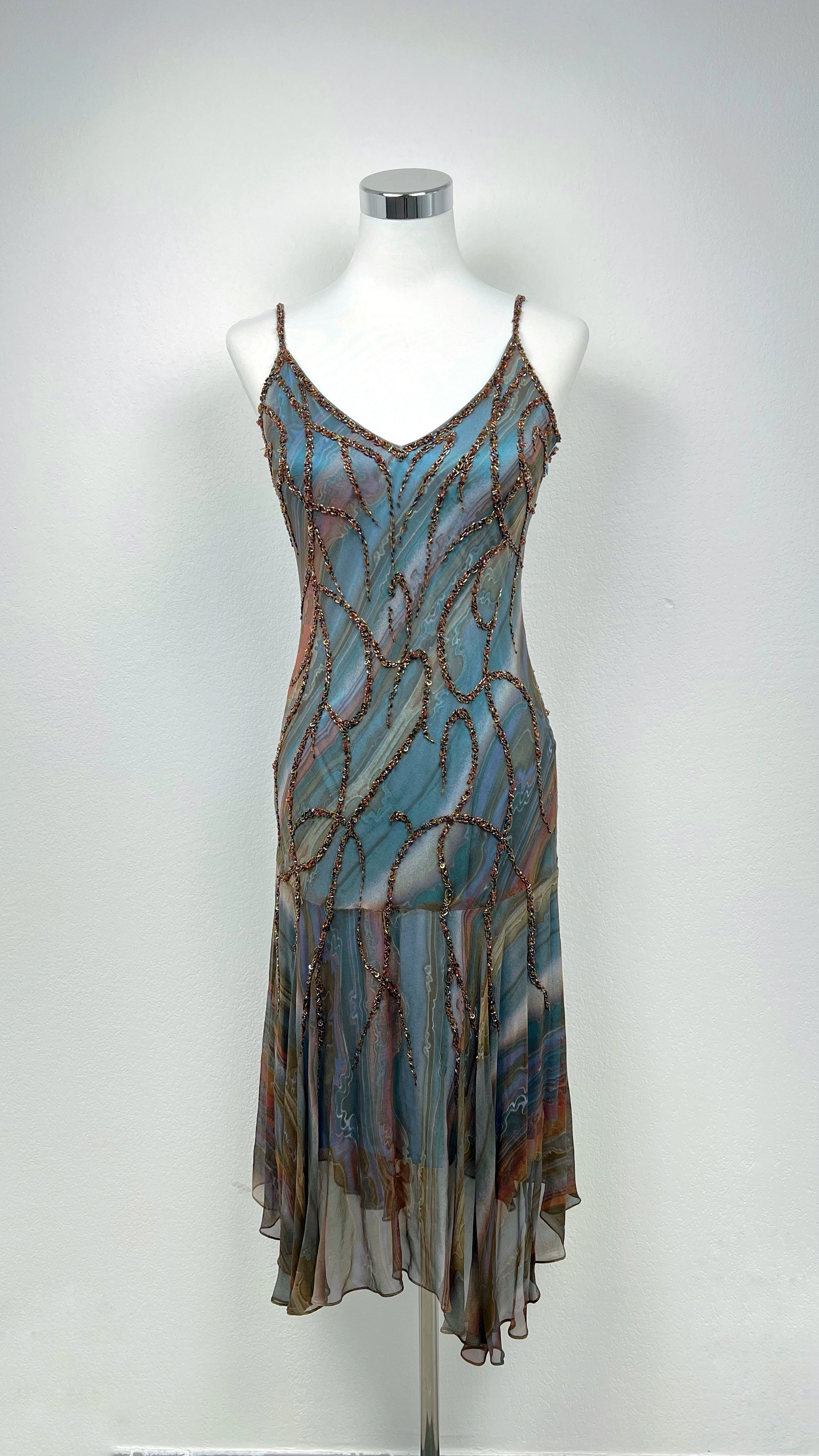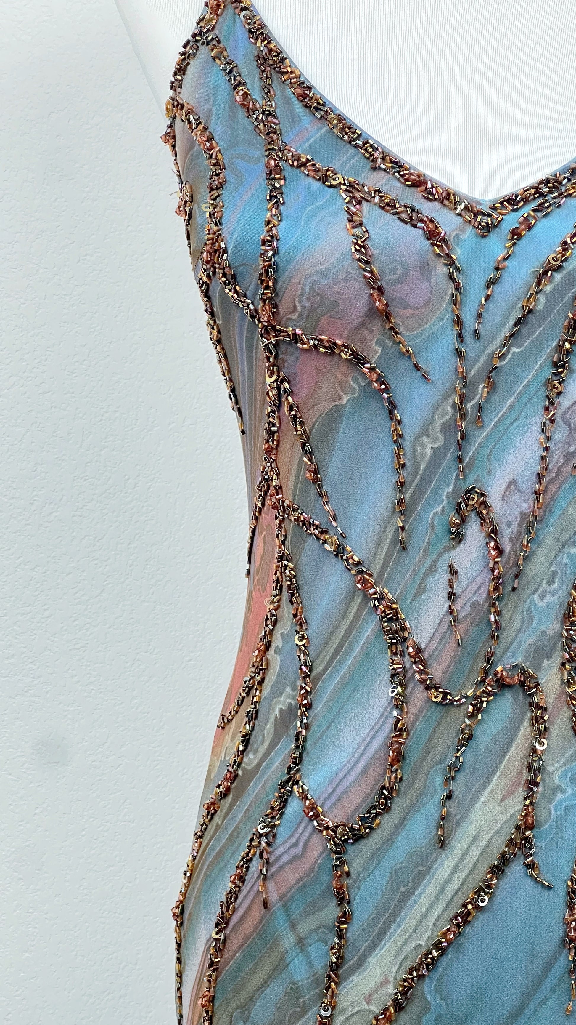 Details: wave-effect beaded embroidery, marbled shades of blue, ochre, and pink