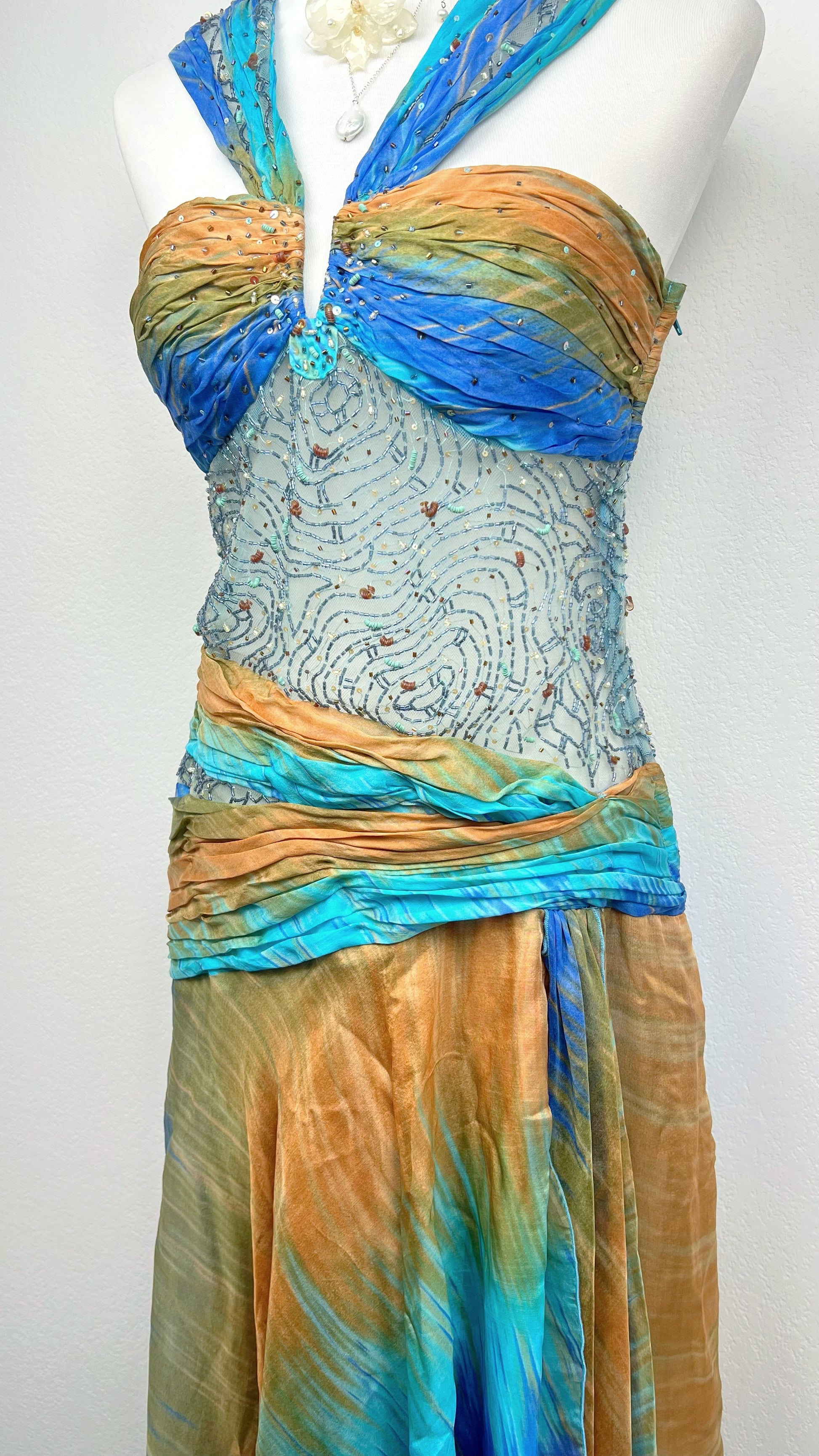 • Features: Hand-sewn beadwork, draped bodice, fluid asymmetrical skirt