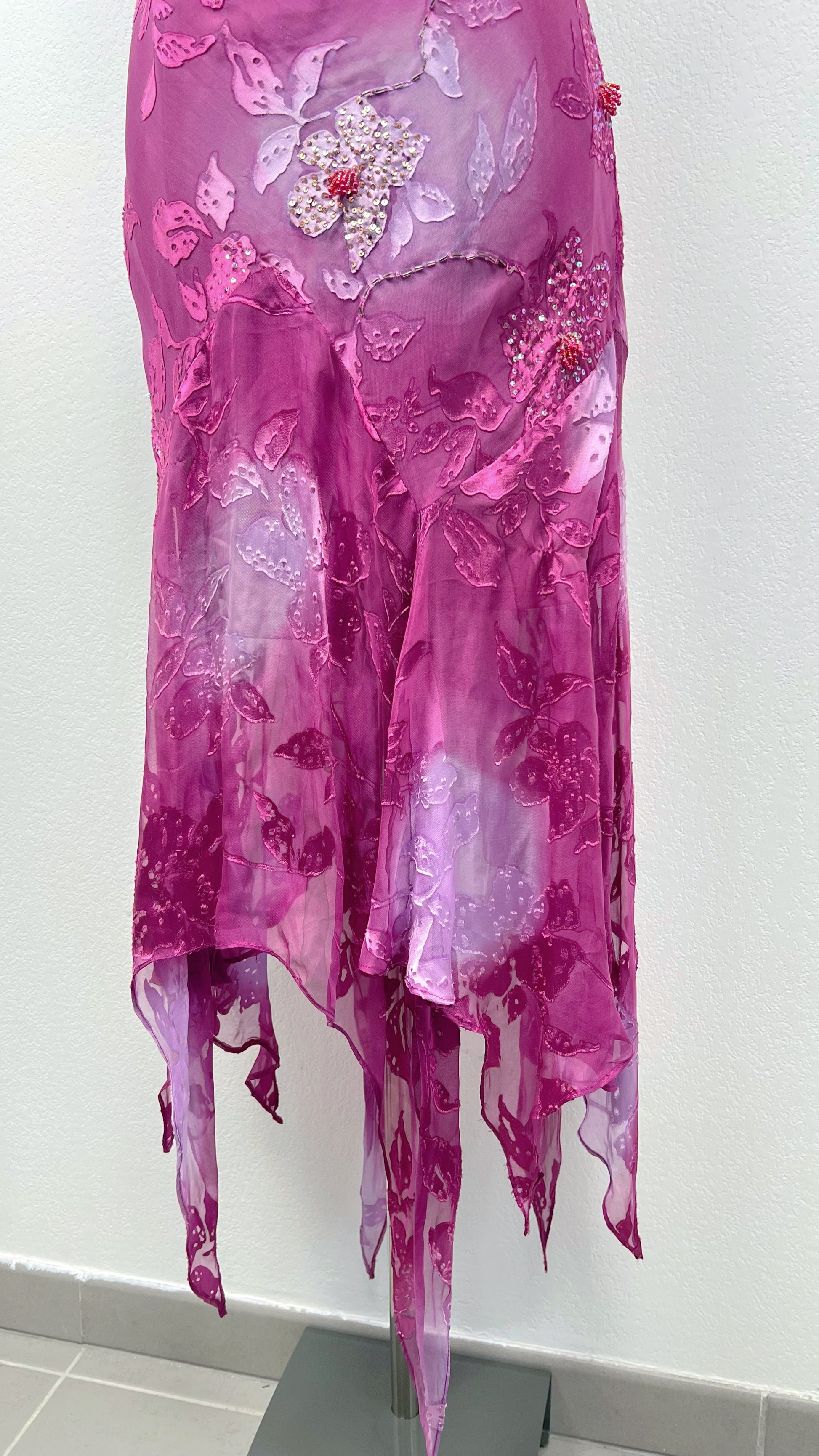 Crafted from 100% pure silk, it stands out for its fluid drape and fairy hem with delicately irregular edges, giving the silhouette an ethereal, dreamlike grace.