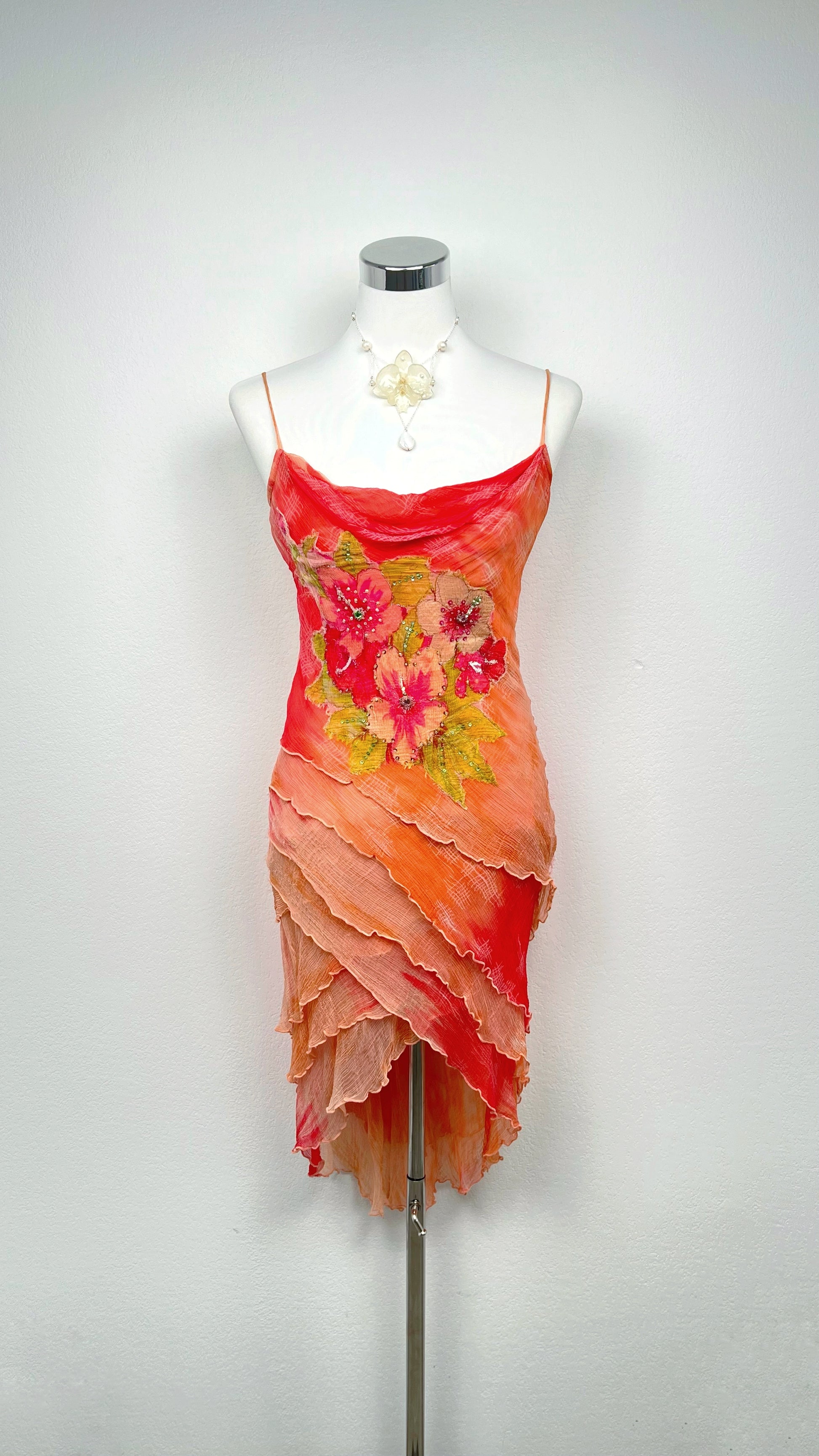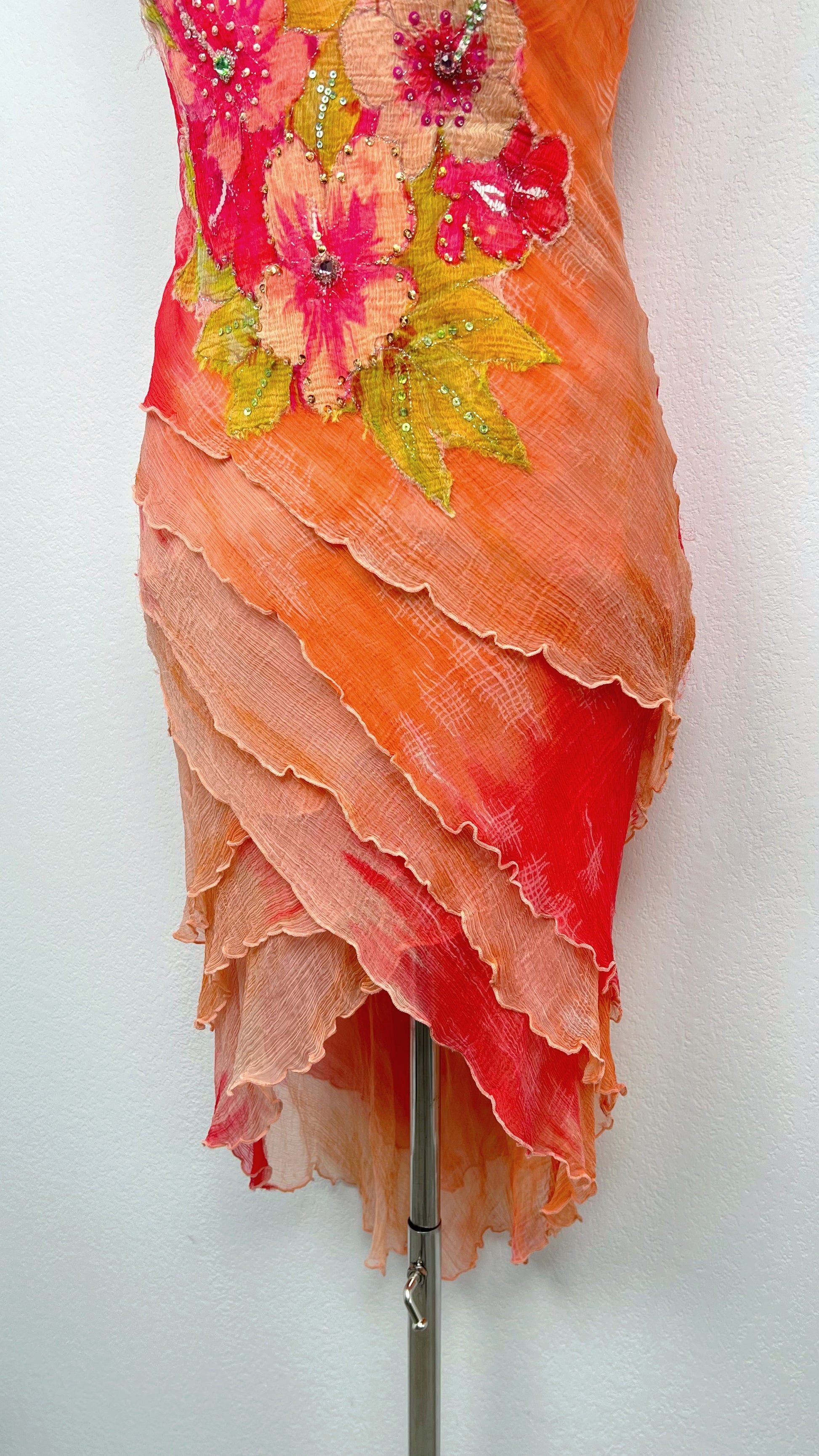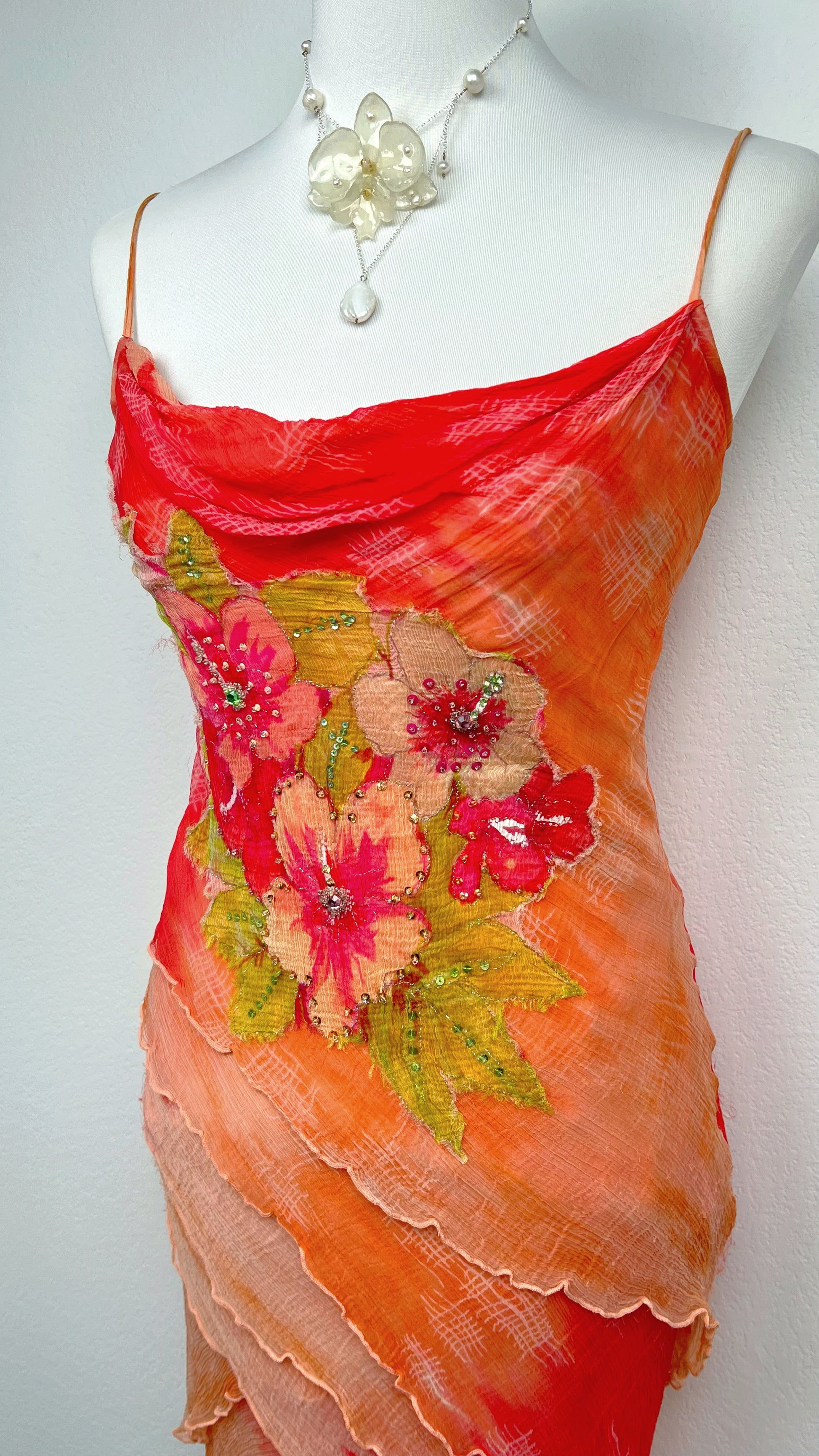 This dress is a textile work of art: a blazing red–orange gradient, layered petal-like panels, and incredibly delicate beaded floral embroidery.
