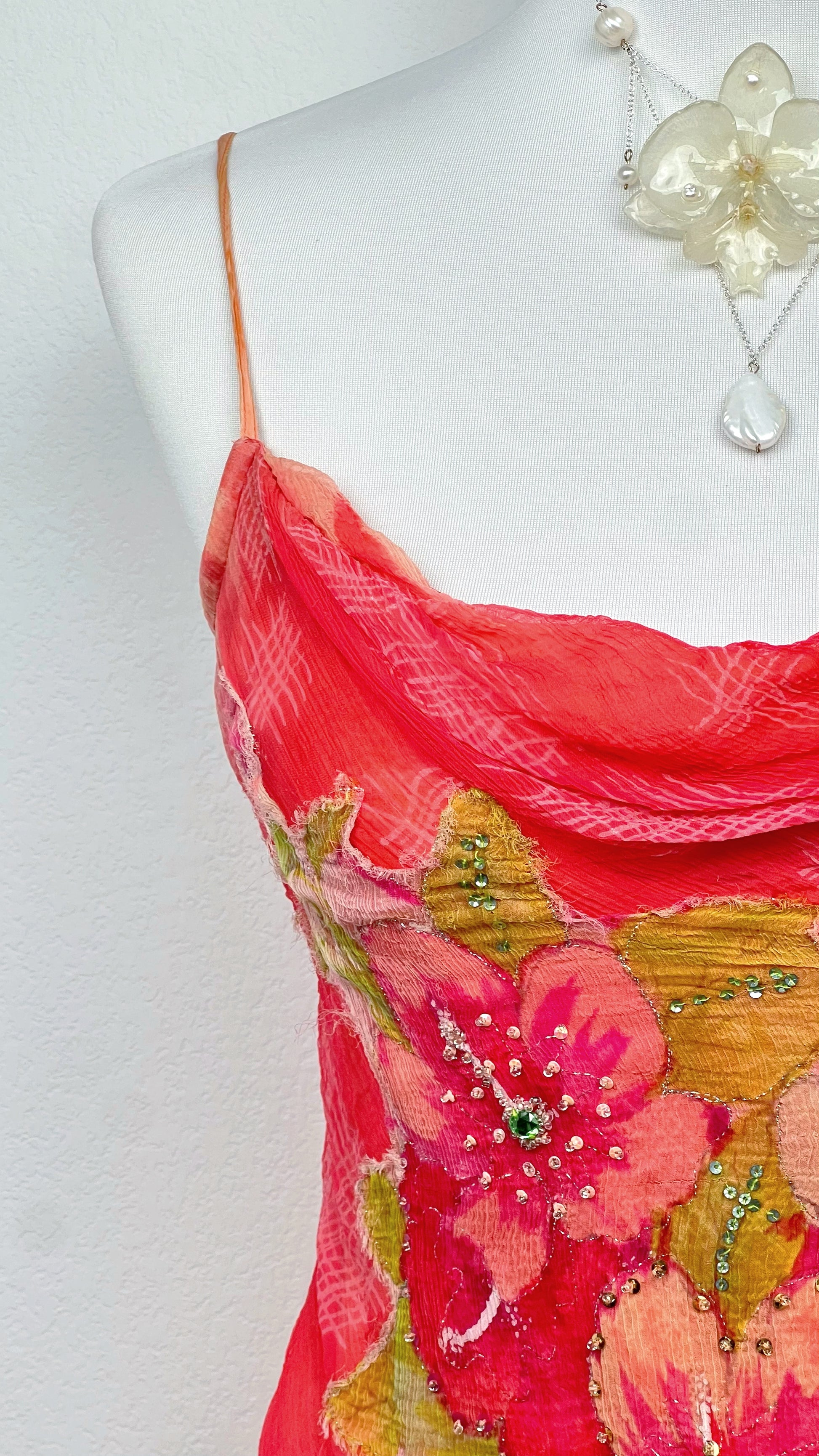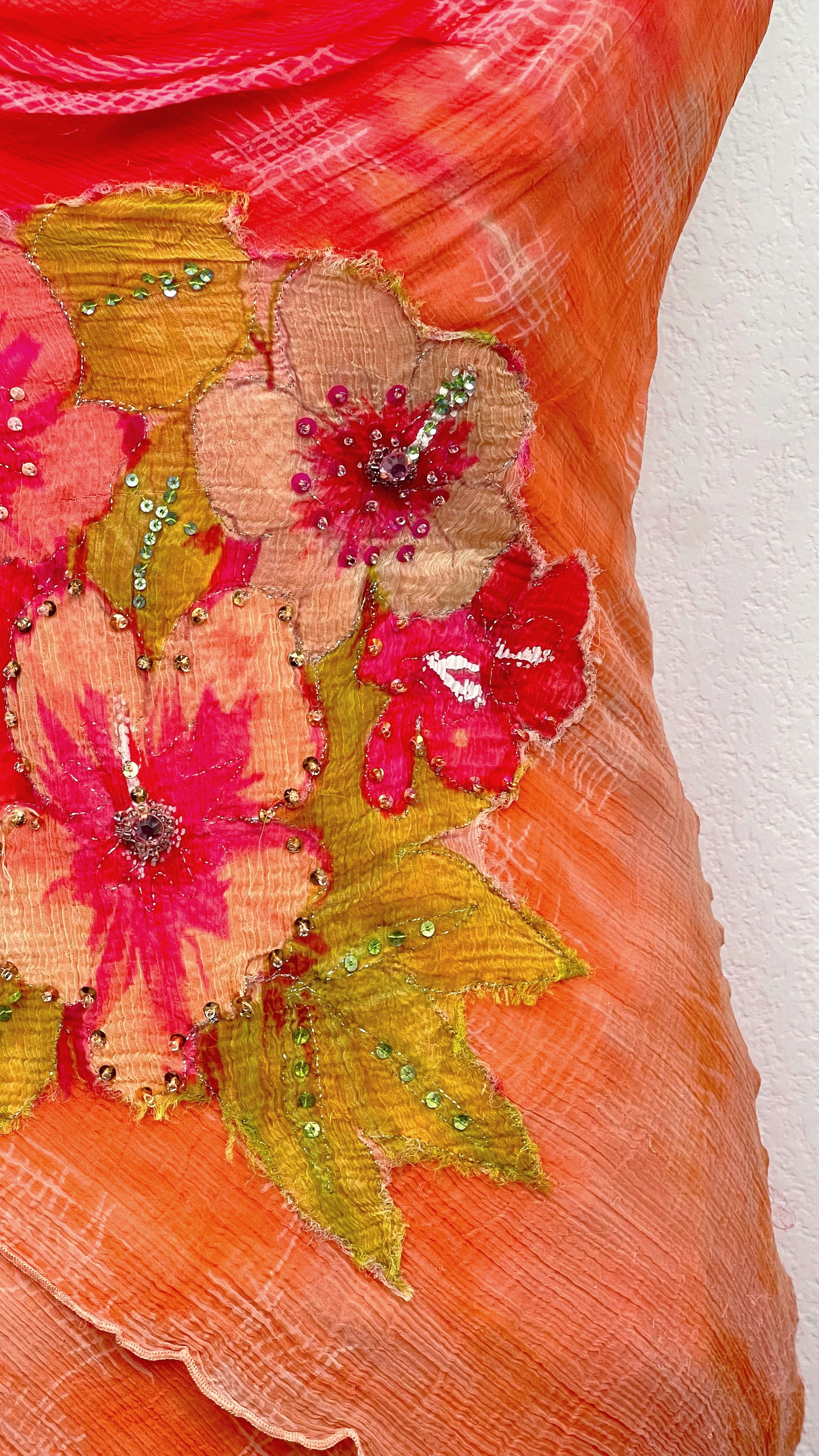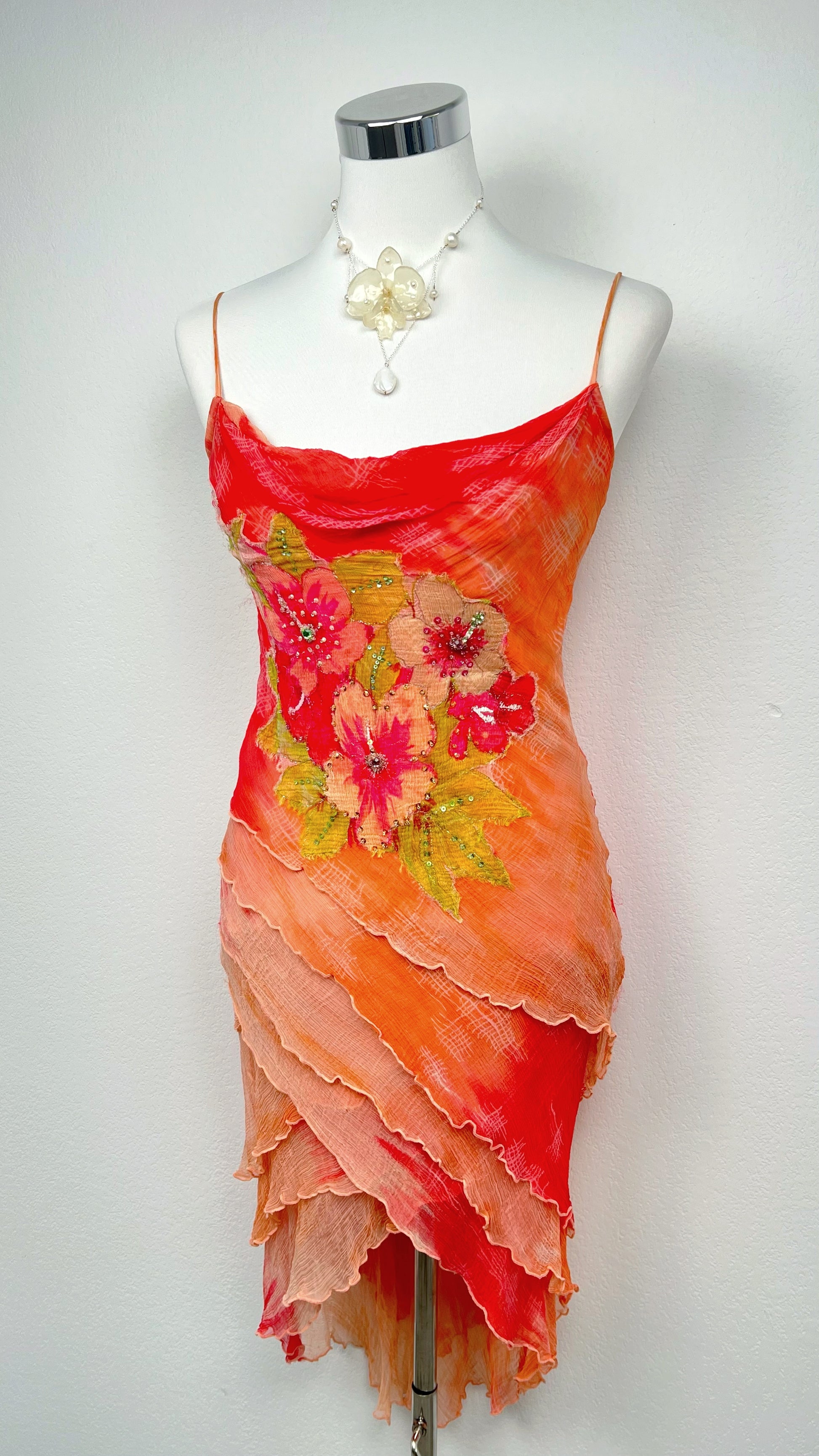 This dress is a textile work of art: a blazing red–orange gradient, layered petal-like panels, and incredibly delicate beaded floral embroidery.