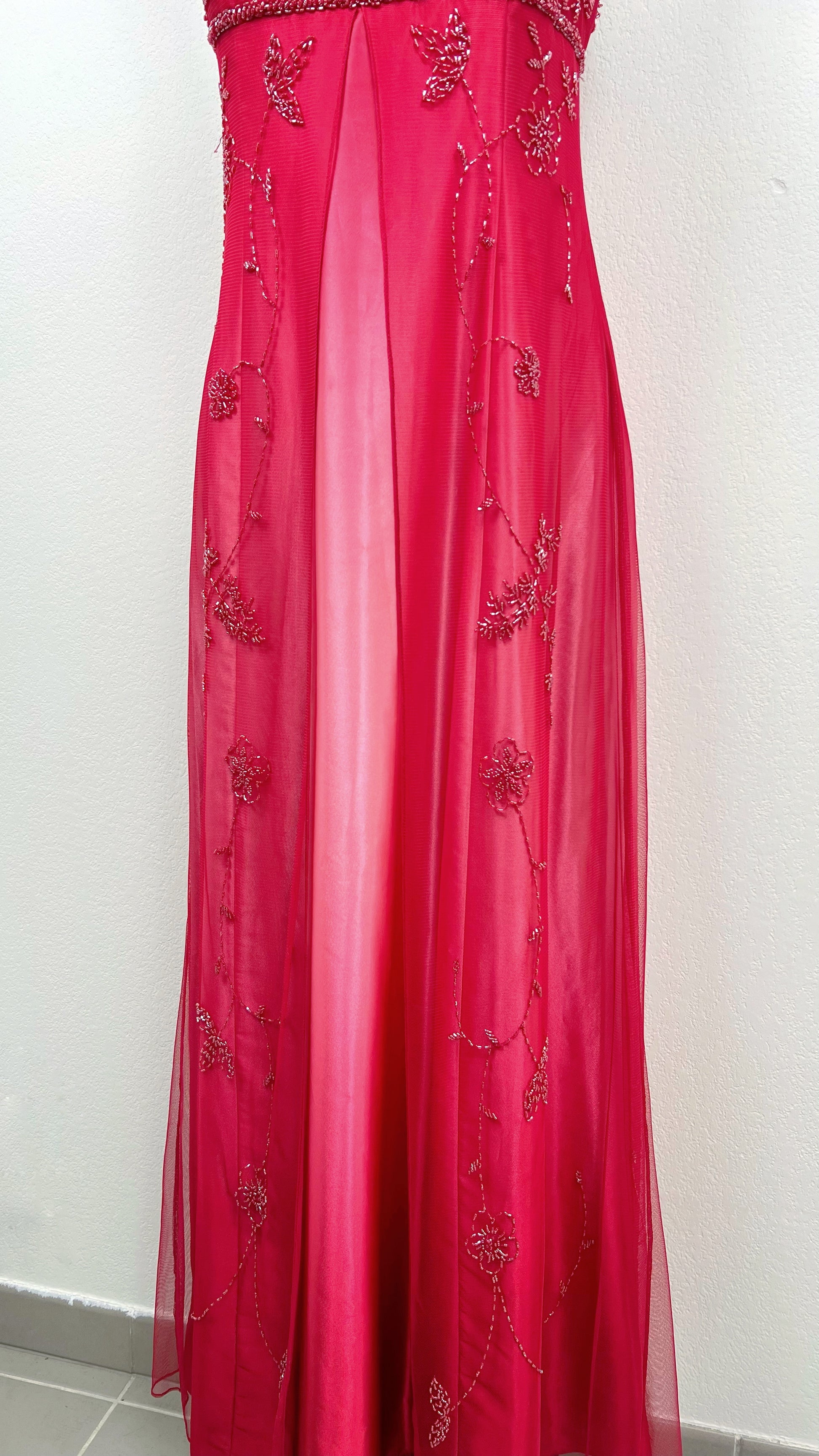 Its vibrant pink shade – slightly softer and less bright in reality – is adorned with delicate beaded embroidery that sparkles like a shower of stars over a blooming garden. Its flowing, graceful cut reveals an elegant and timeless silhouette, worthy of the most enchanting evenings.
