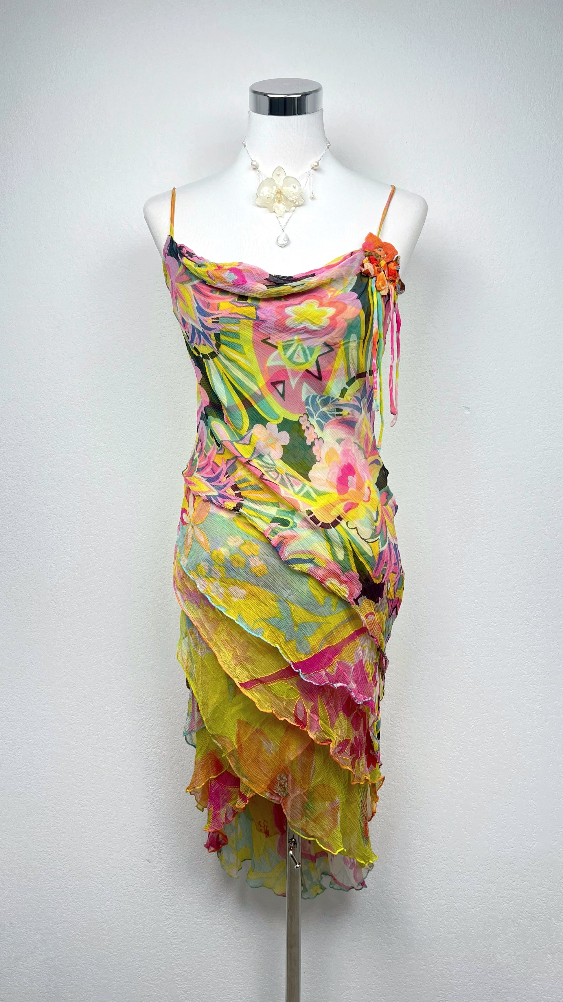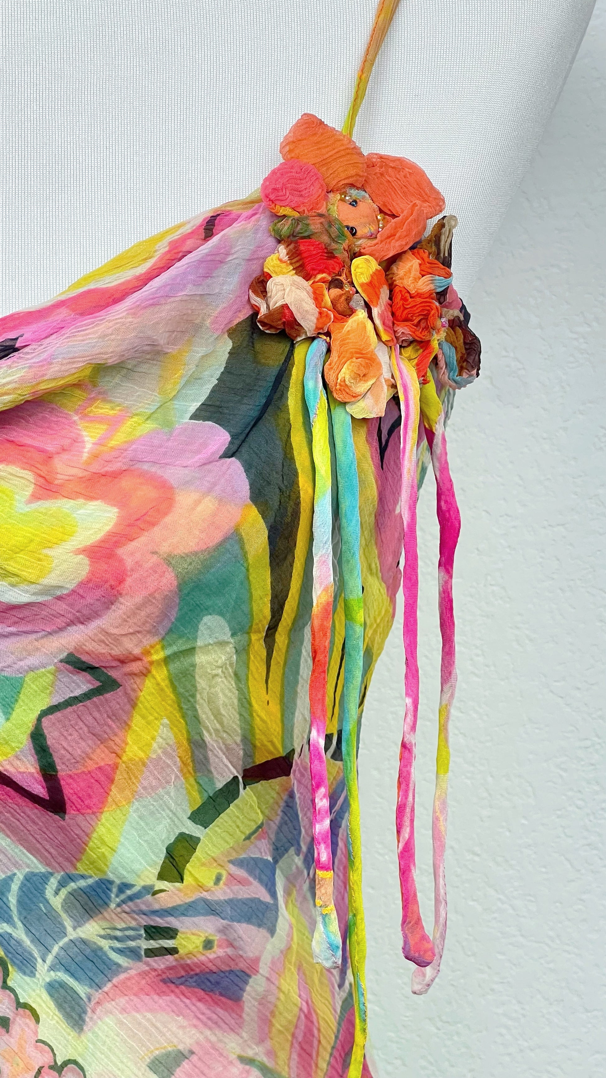 The draped bust and layered asymmetrical ruffles shape a light, dancing silhouette, while the small fabric flower on the strap adds a unique handcrafted touch.
