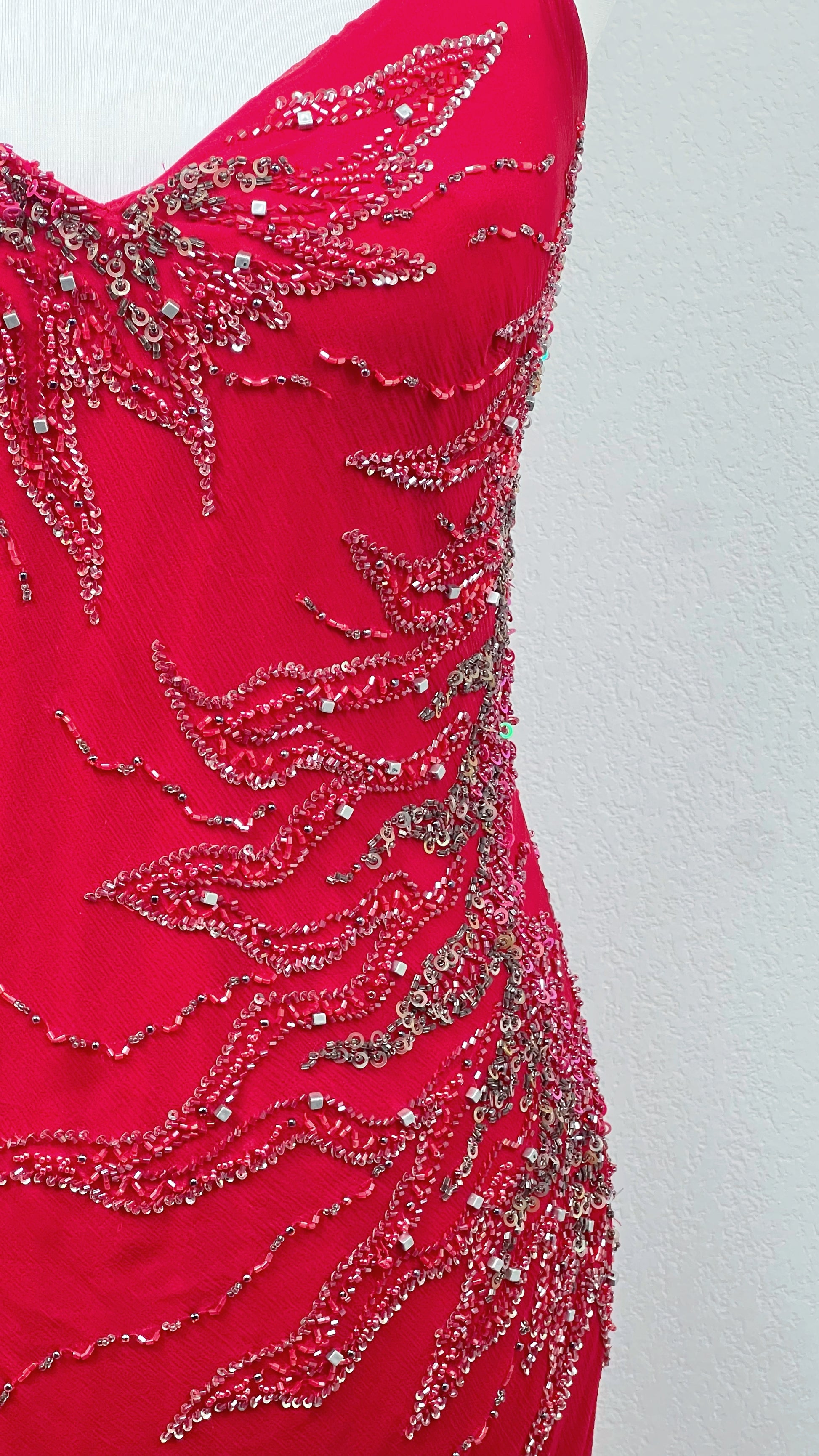 Details: flame-effect beaded embroidery, radiant red