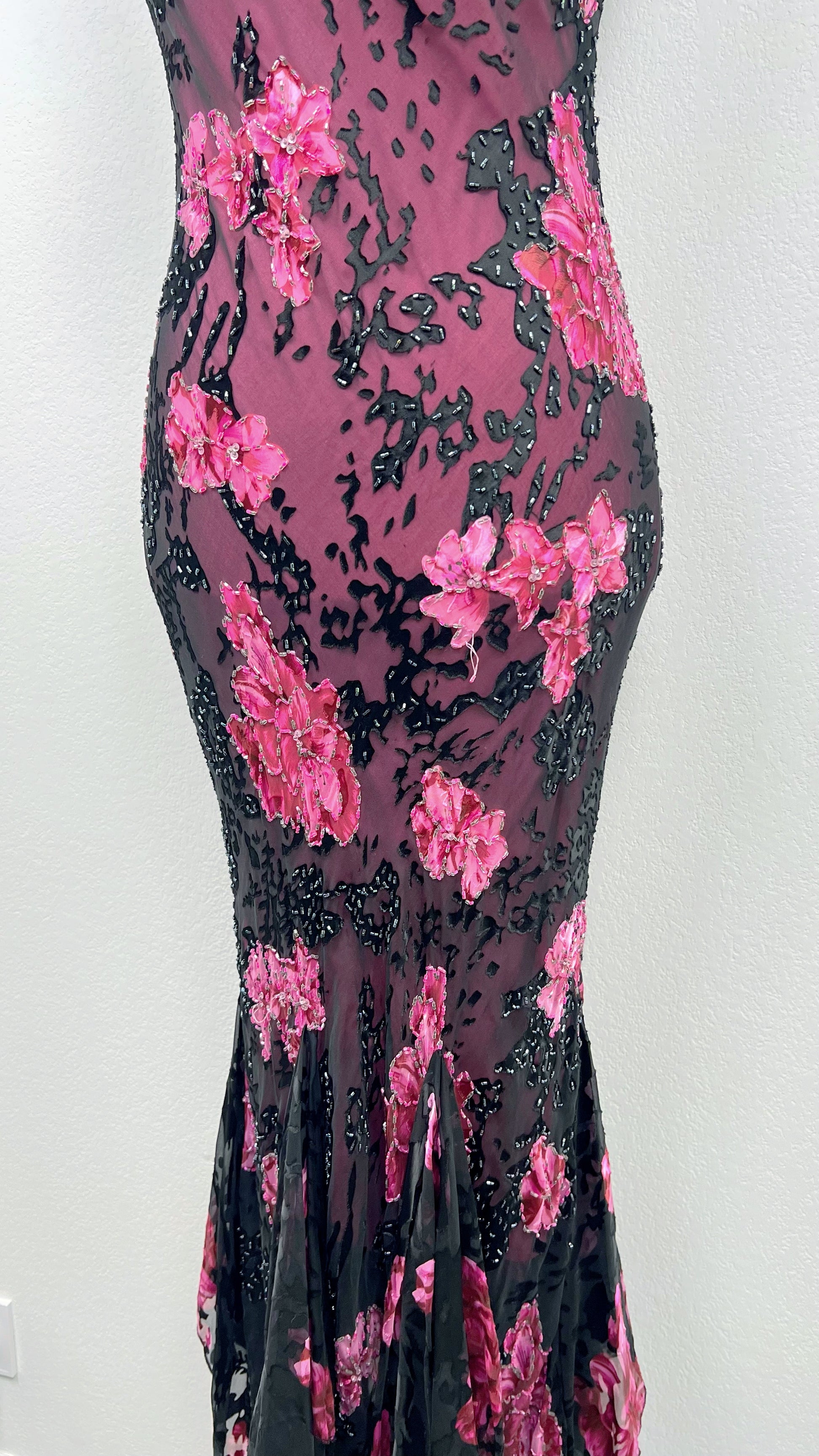 The Midnight Blossom Gown is an exceptional piece, crafted in 100% silk. Its deep black background is illuminated by vibrant fuchsia flowers, like a secret garden blooming at nightfall. Every detail, enhanced by delicate embroidery and sequins, captures the light and highlights the silhouette with sculptural elegance.