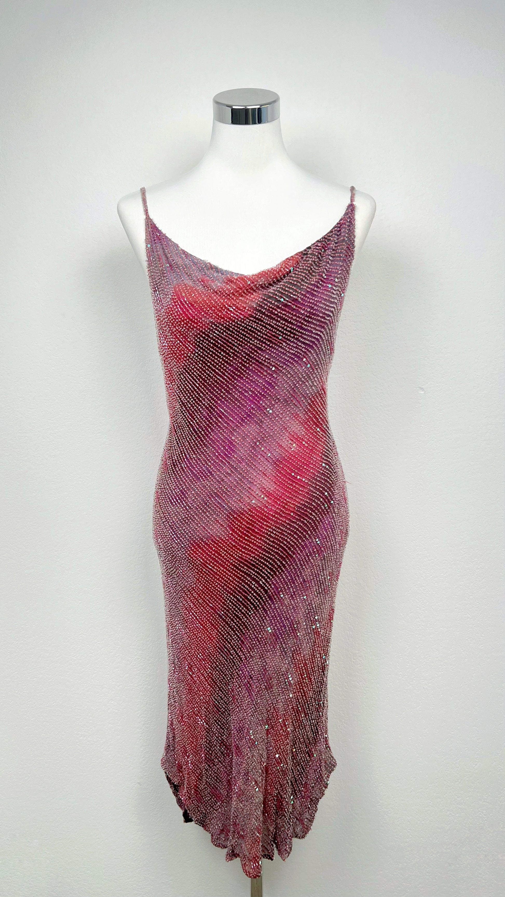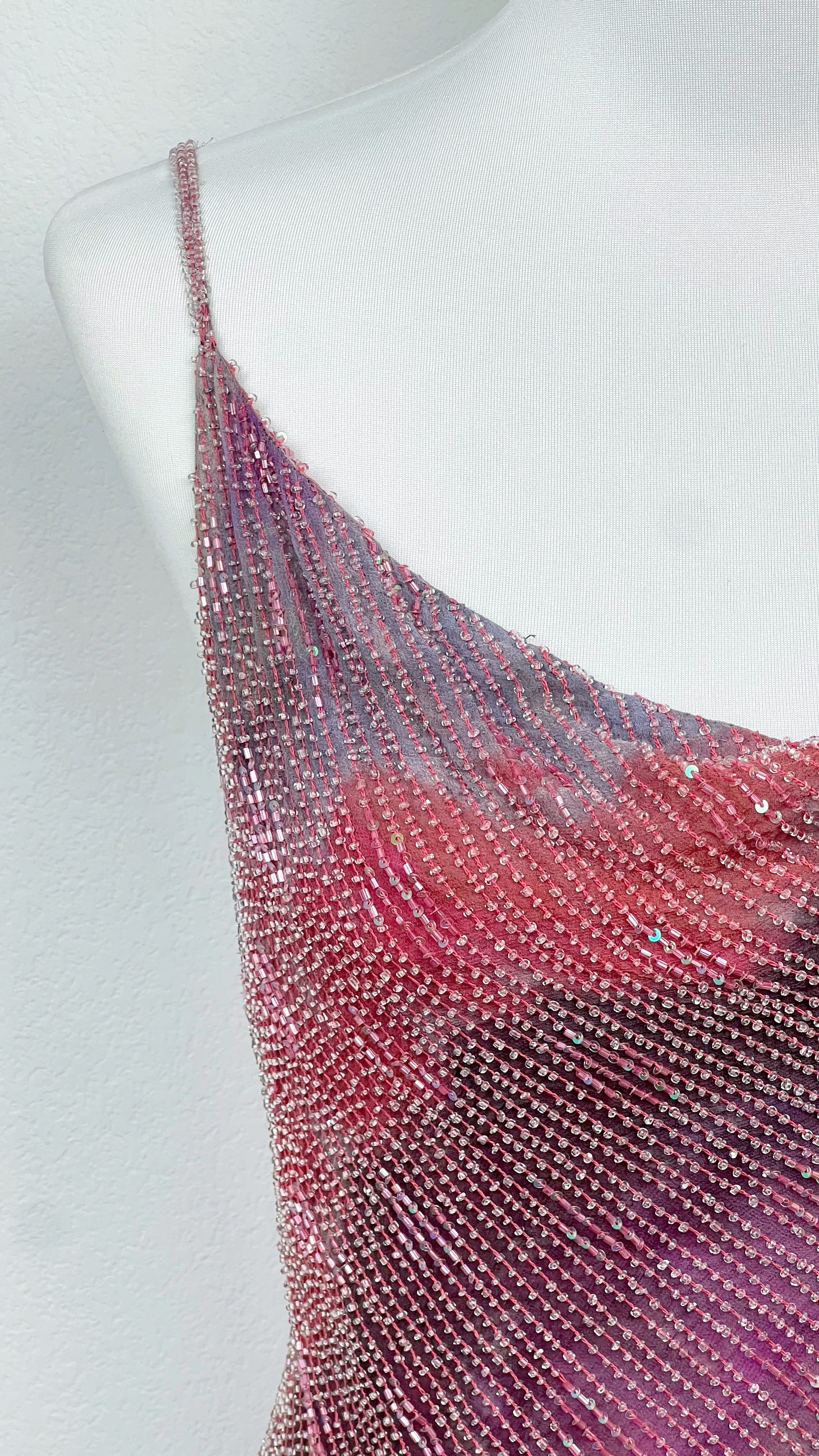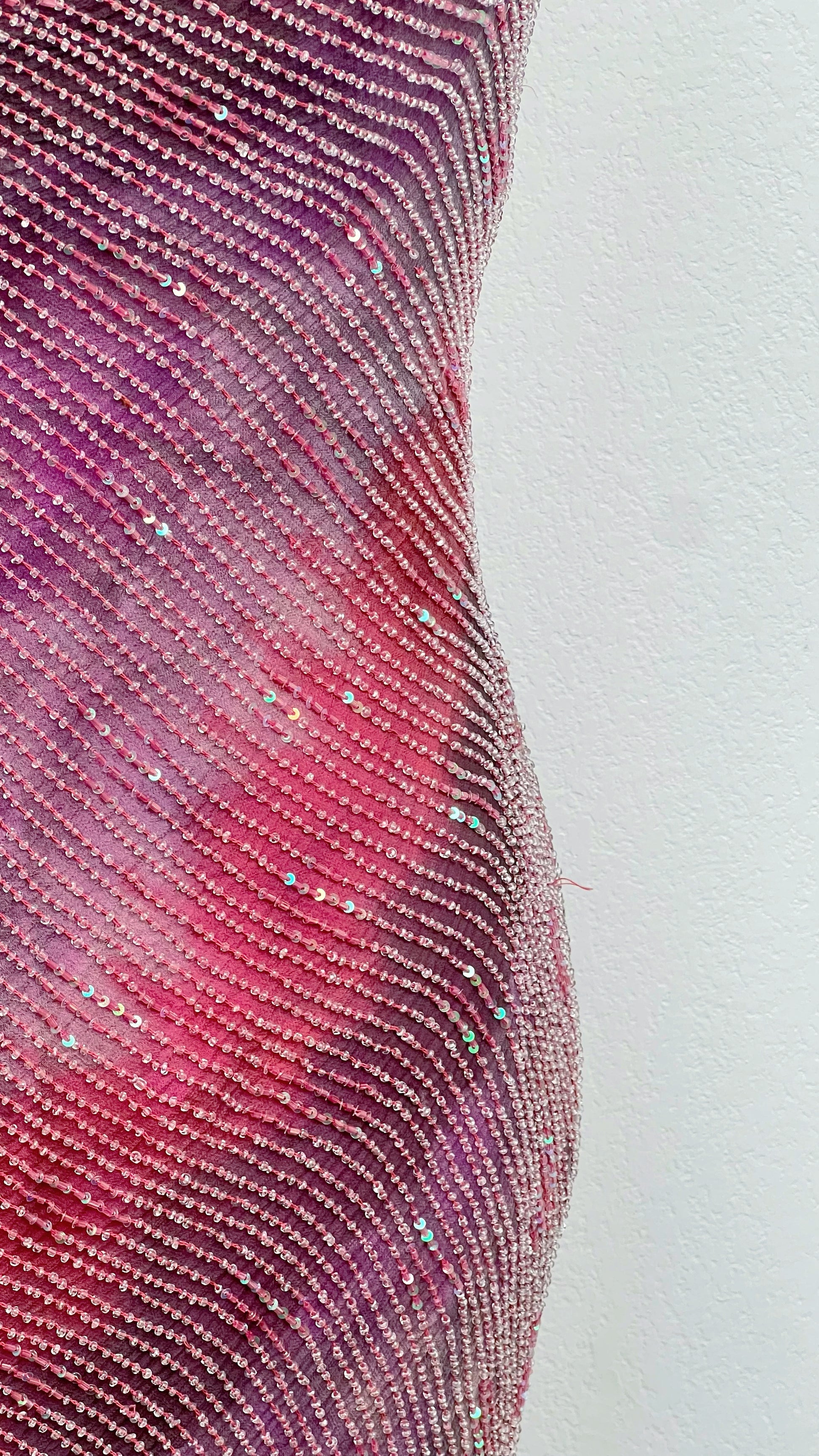 Son tissu satiné, parsemé de fines perles scintillantes, évoque une pluie d’étoiles sur un ciel de crépuscule rouge et améthyste.