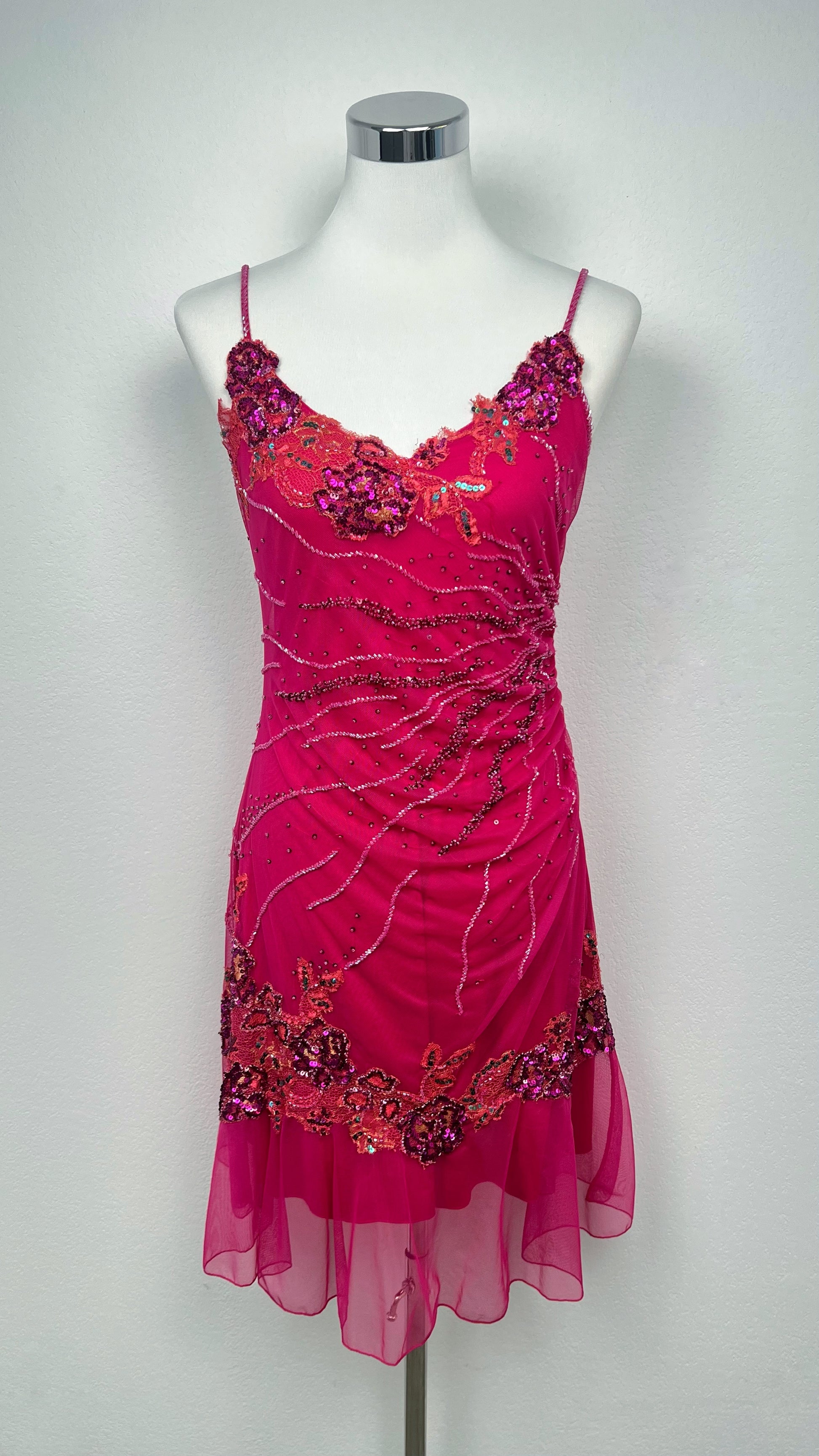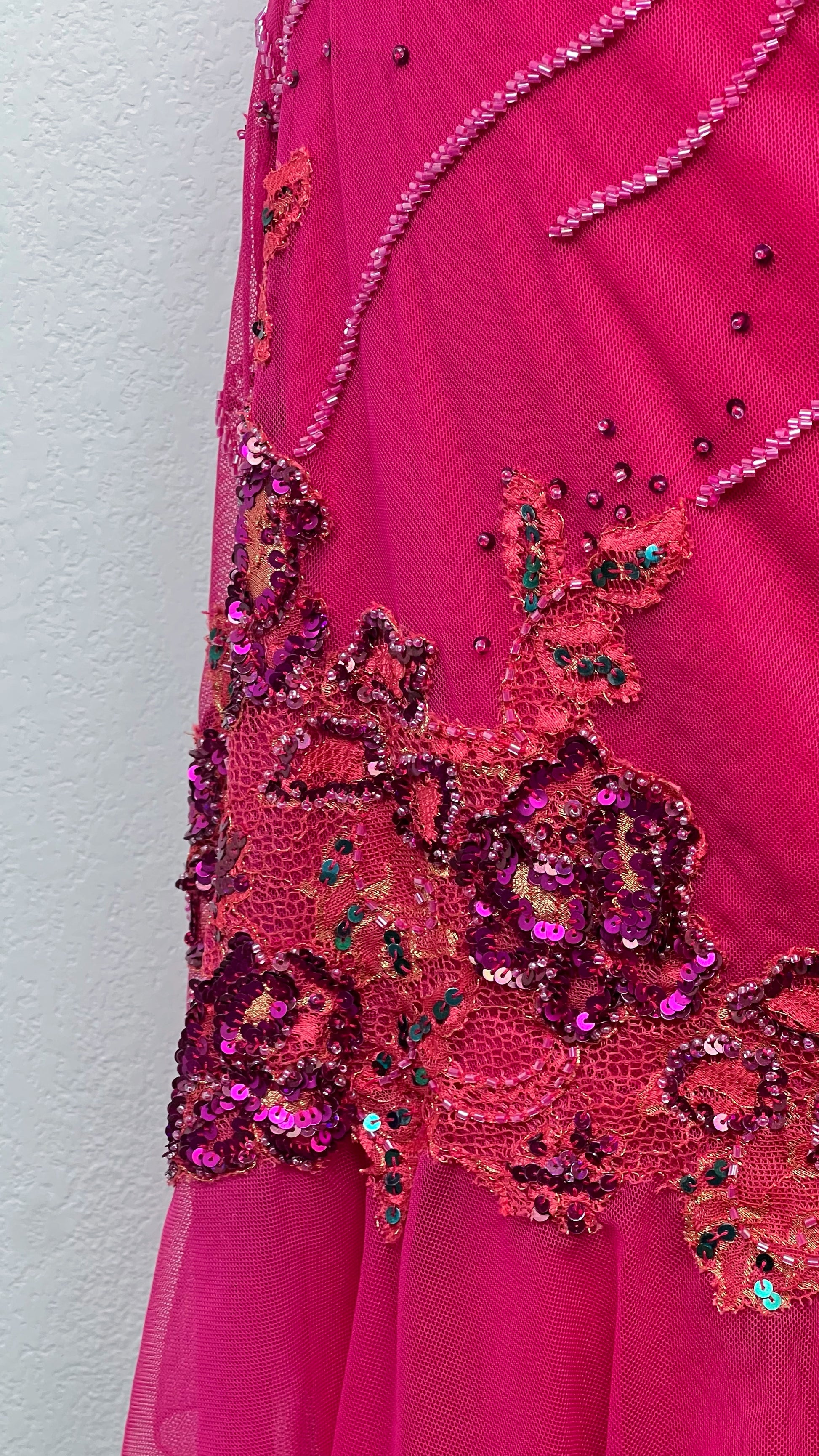 Sa teinte fuchsia éclatante embrase le regard, tandis que les broderies florales et sequins scintillants dessinent des arabesques de lumière sur le tissu fluide.