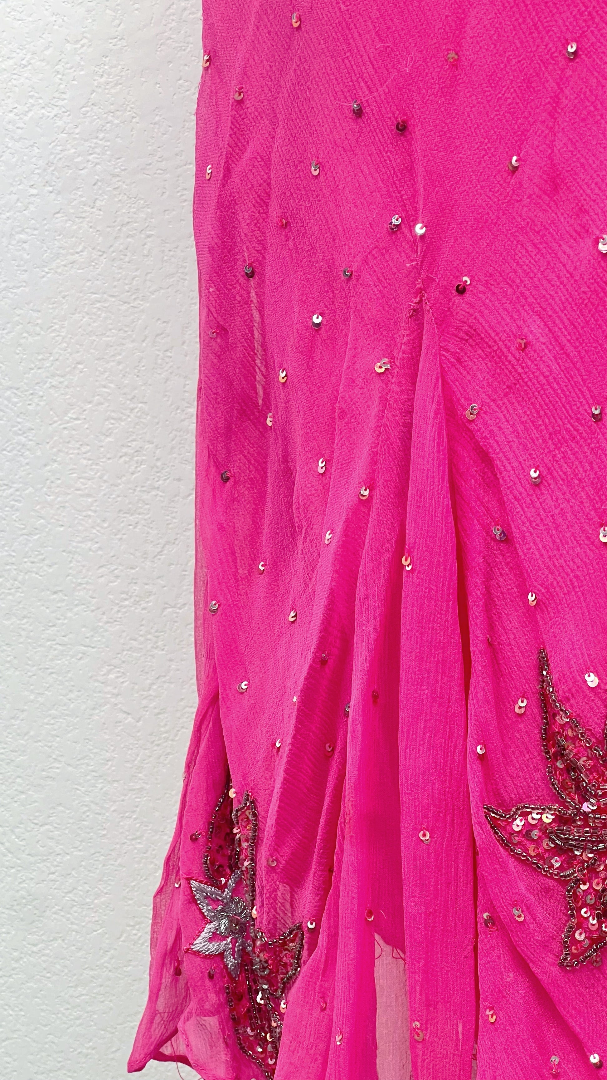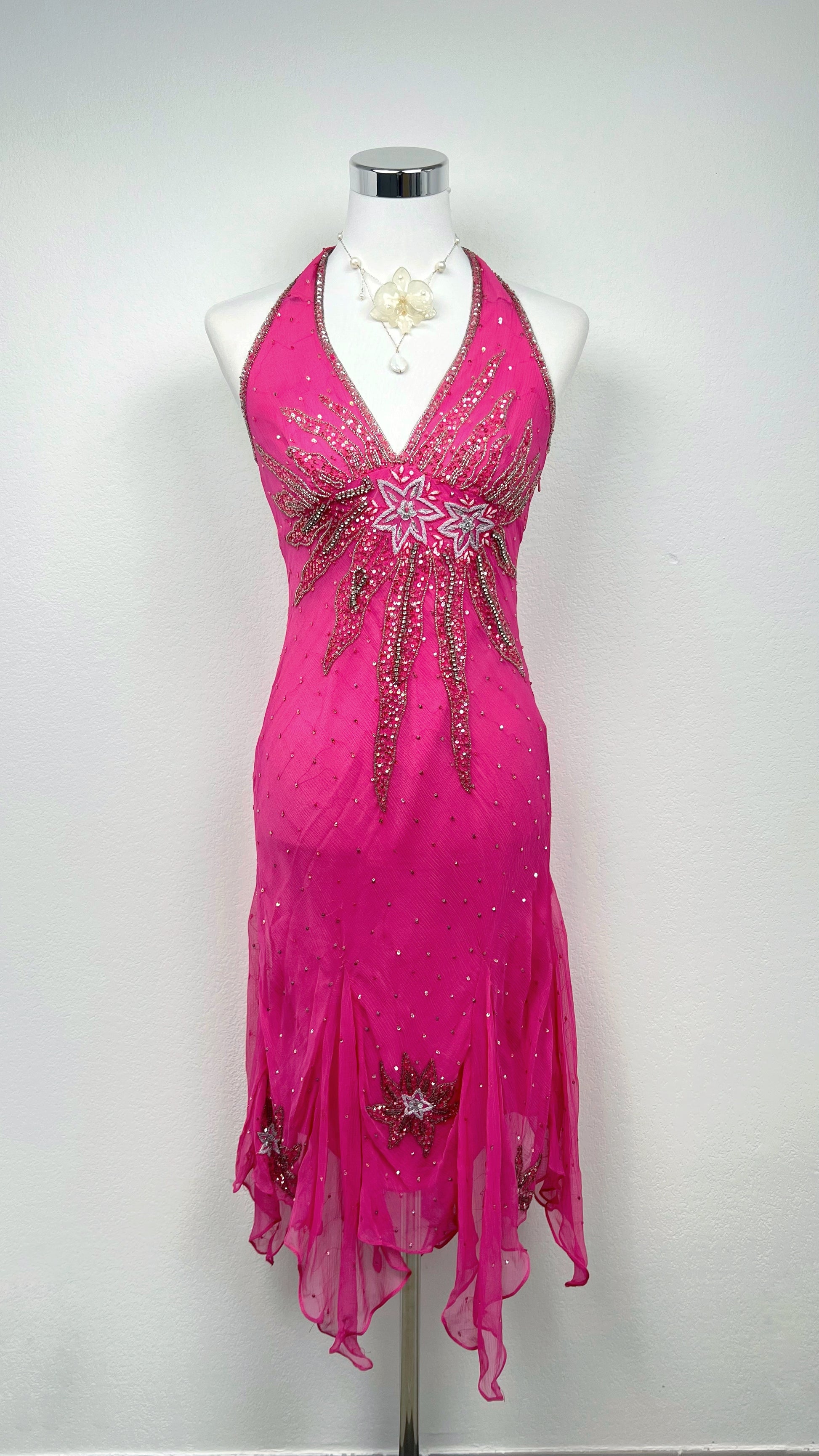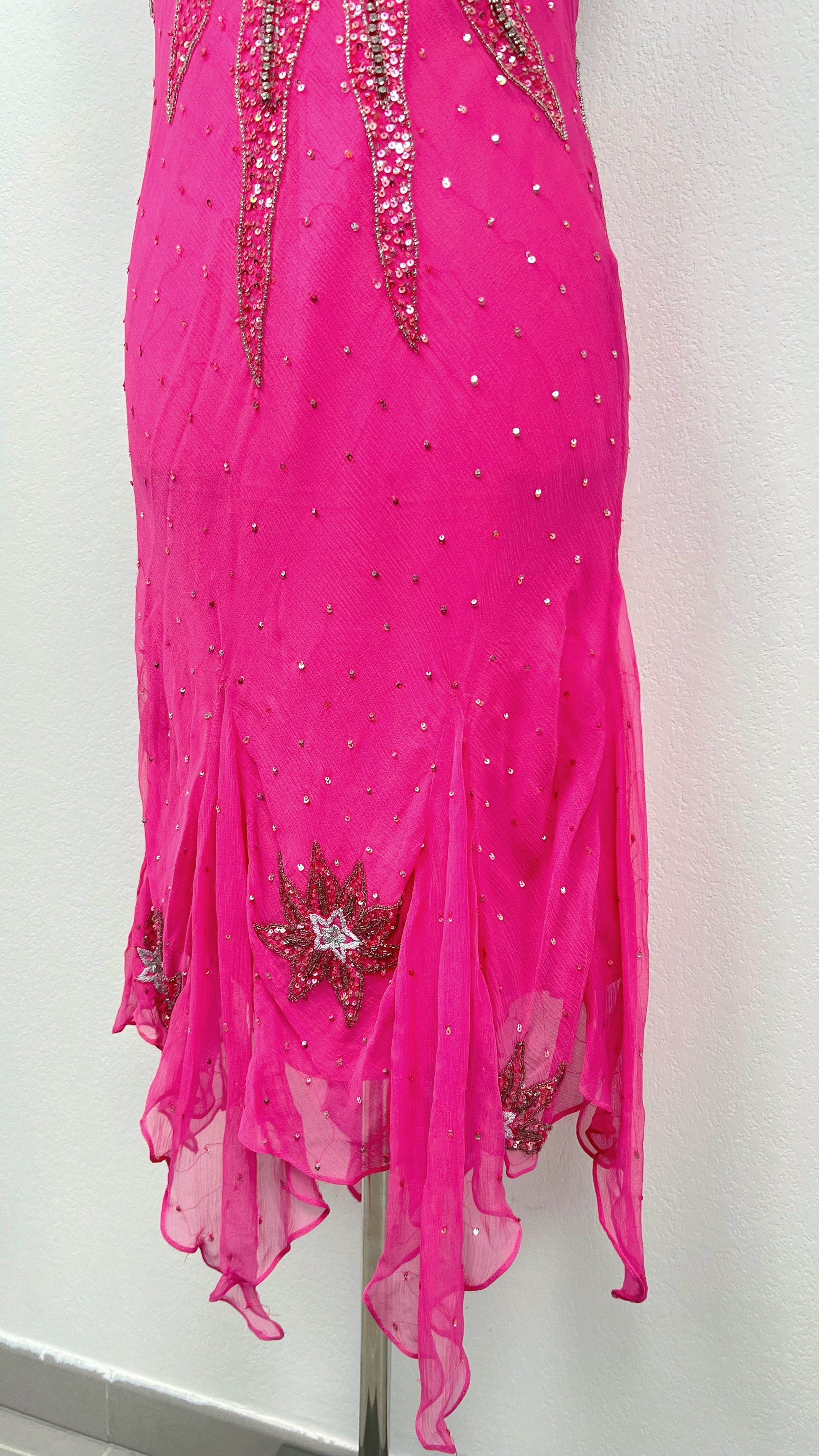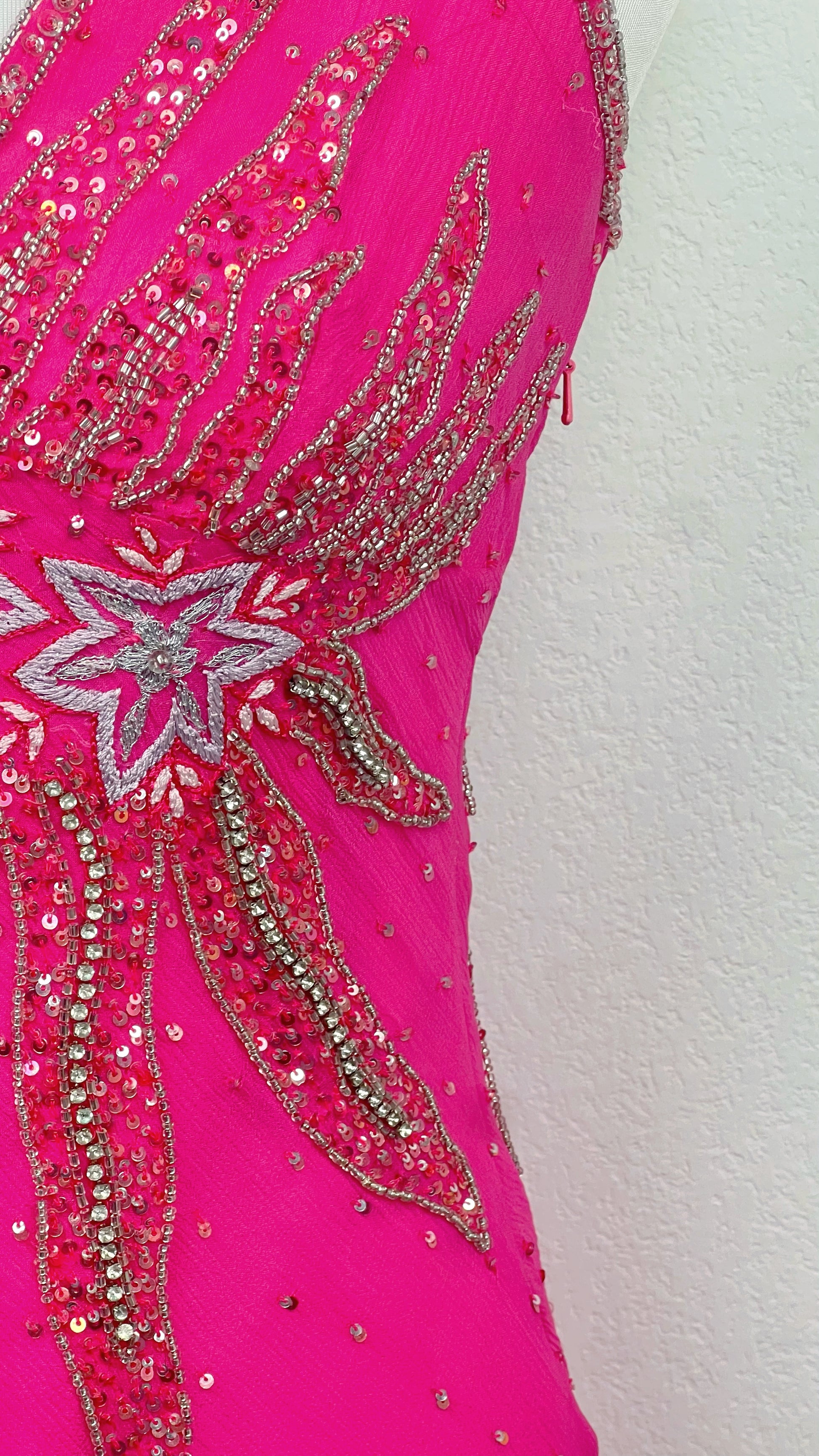 This extremely rare Aftershock dress glows in electric hot pink, illuminated by dazzling star-shaped beadwork that bursts across the bodice like a celestial explosion. The silk floats weightlessly over the body, dusted with tiny crystals that sparkle with every movement, while the asymmetrical hem drifts like stardust in motion.
