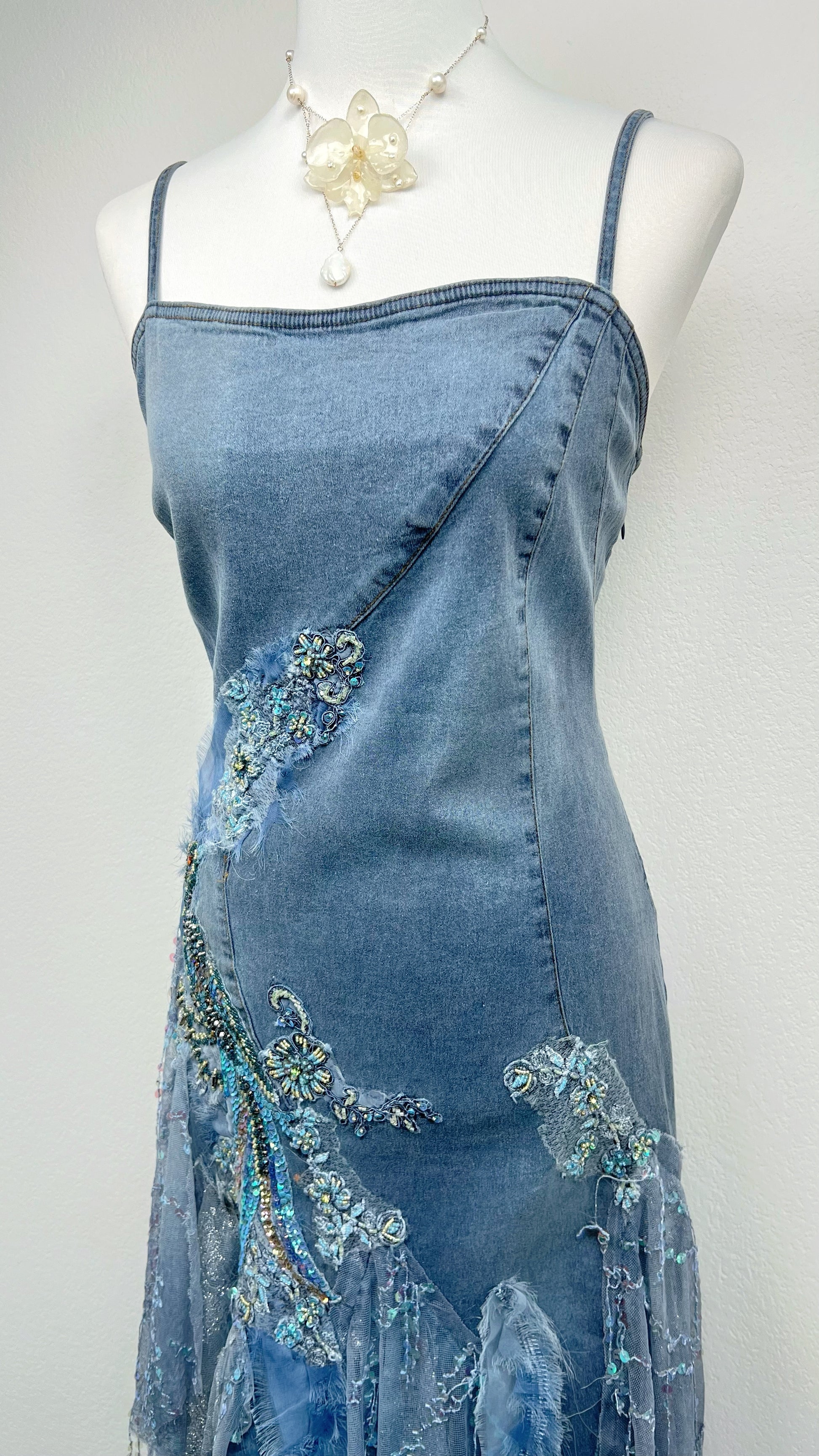 The diagonal seam across the bodice adds a subtle architectural element, guiding the eye toward the ornate hand-applied embellishments cascading down the skirt. Layers of sheer mesh and delicate textures create depth and dimension, transforming classic denim into something almost mythical.
