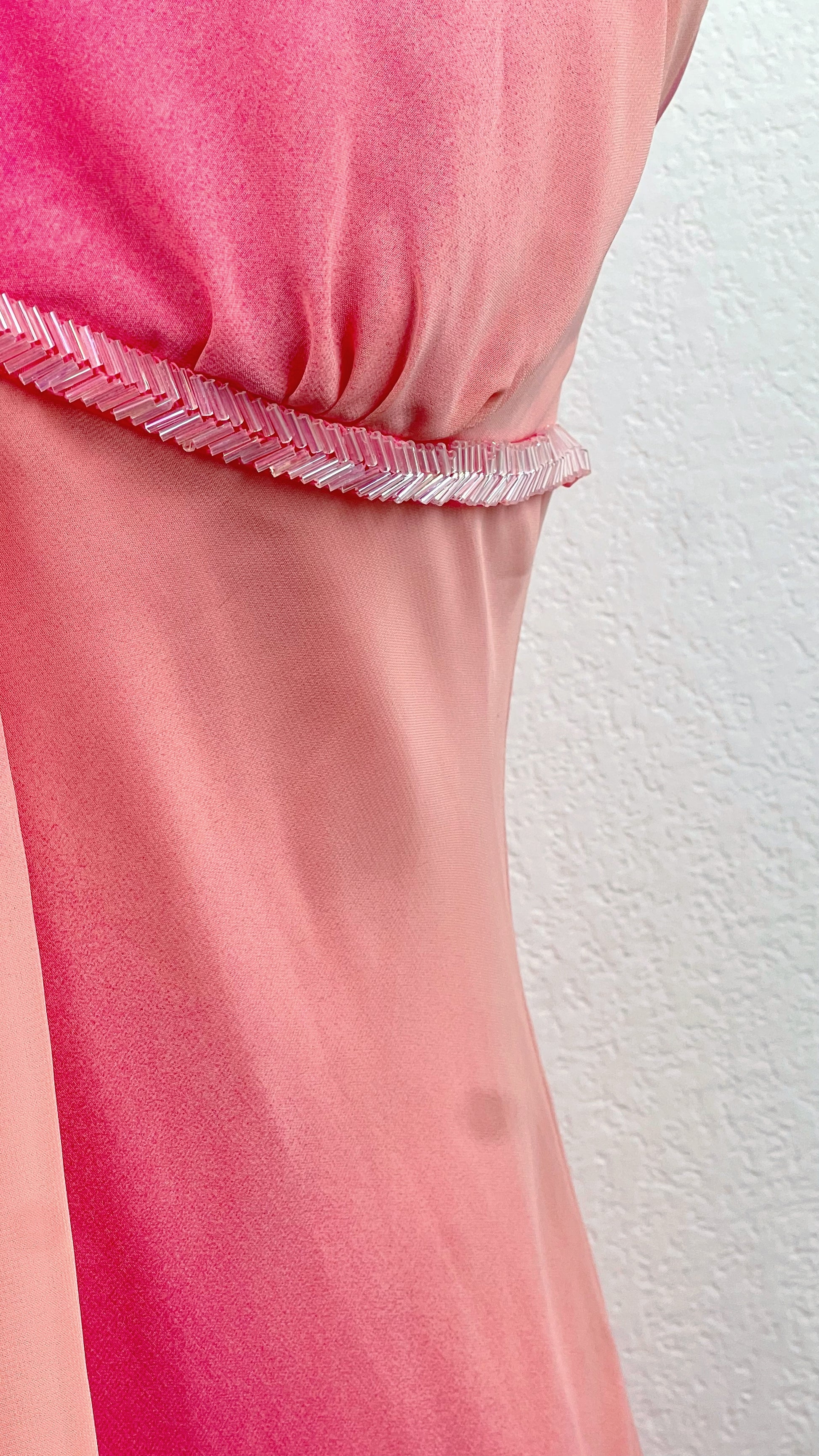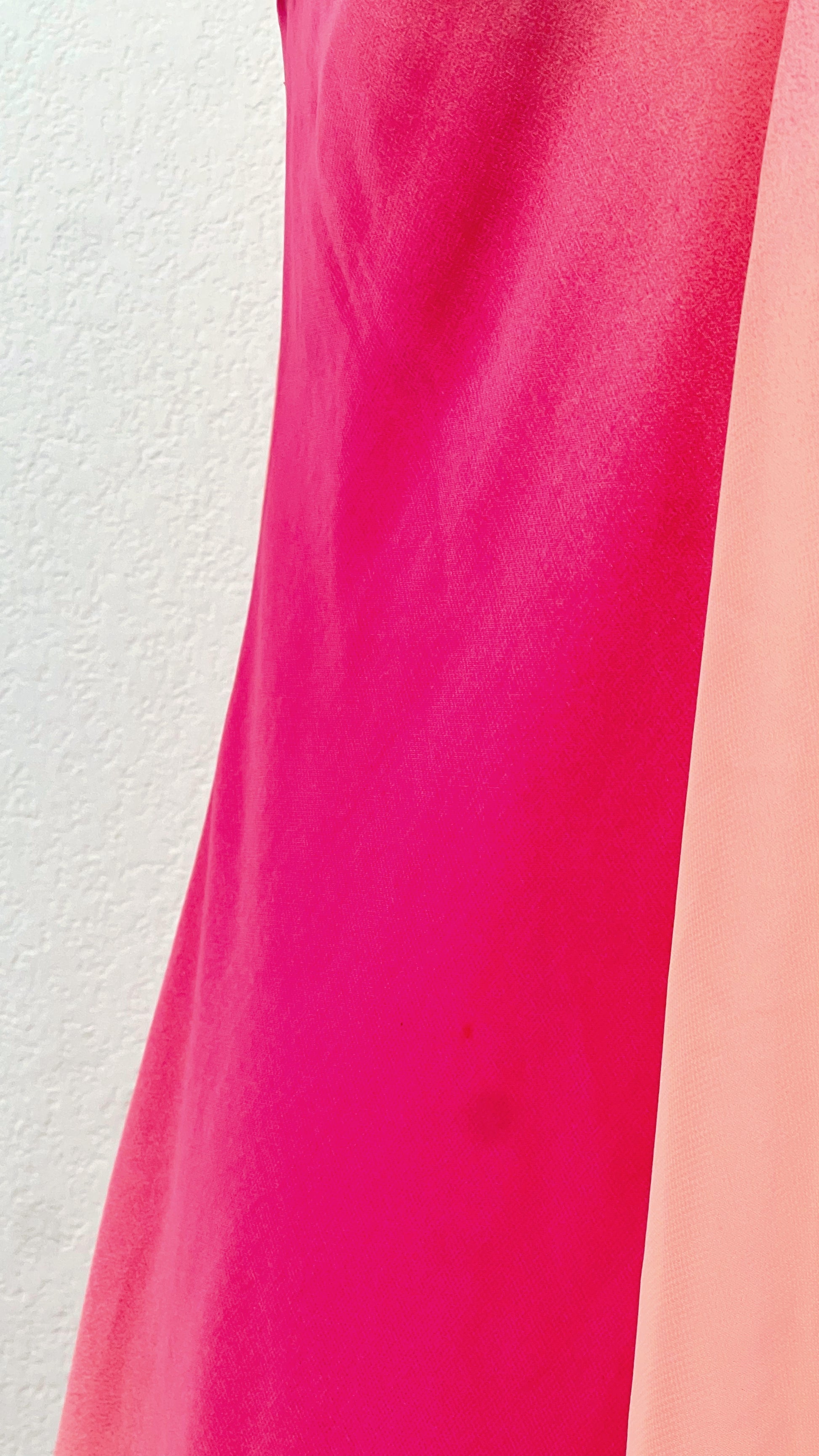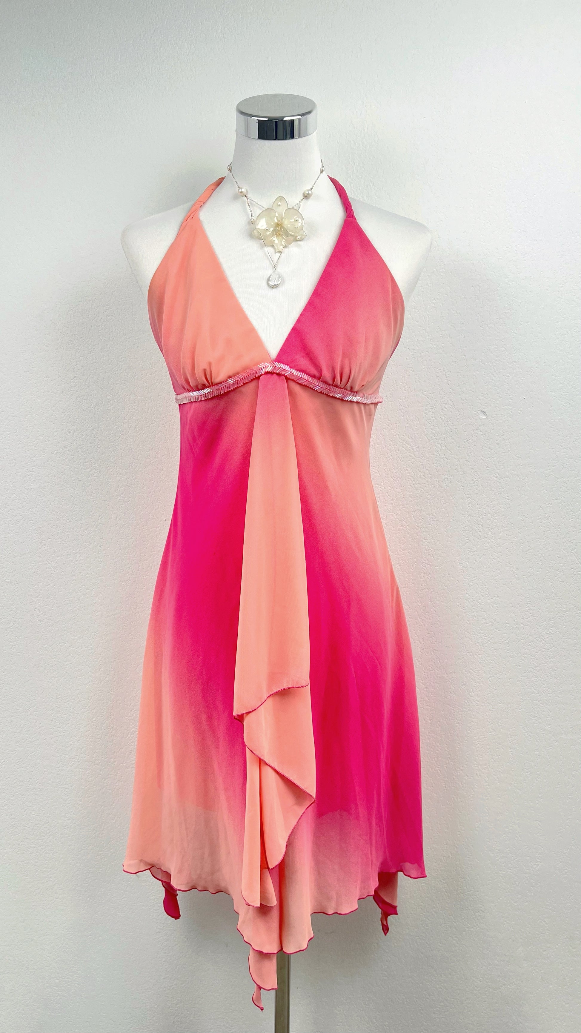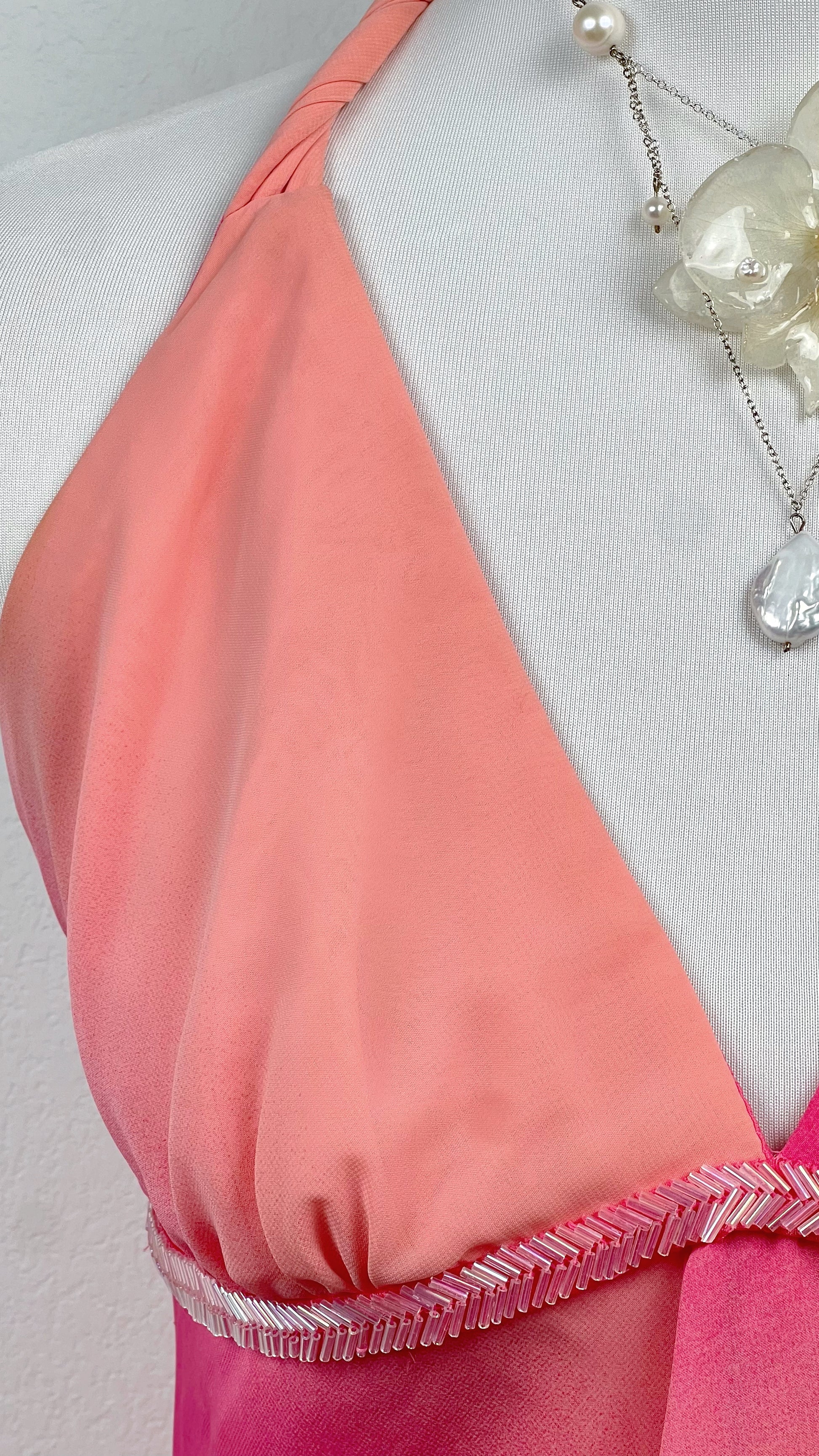 Melting from soft peach into vibrant fuchsia pink, the fabric creates a glowing sunset gradient effect that moves beautifully with the light. The plunging halter neckline flatters the shoulders and décolletage, while the delicate empire seam enhances the silhouette in the most effortless way.