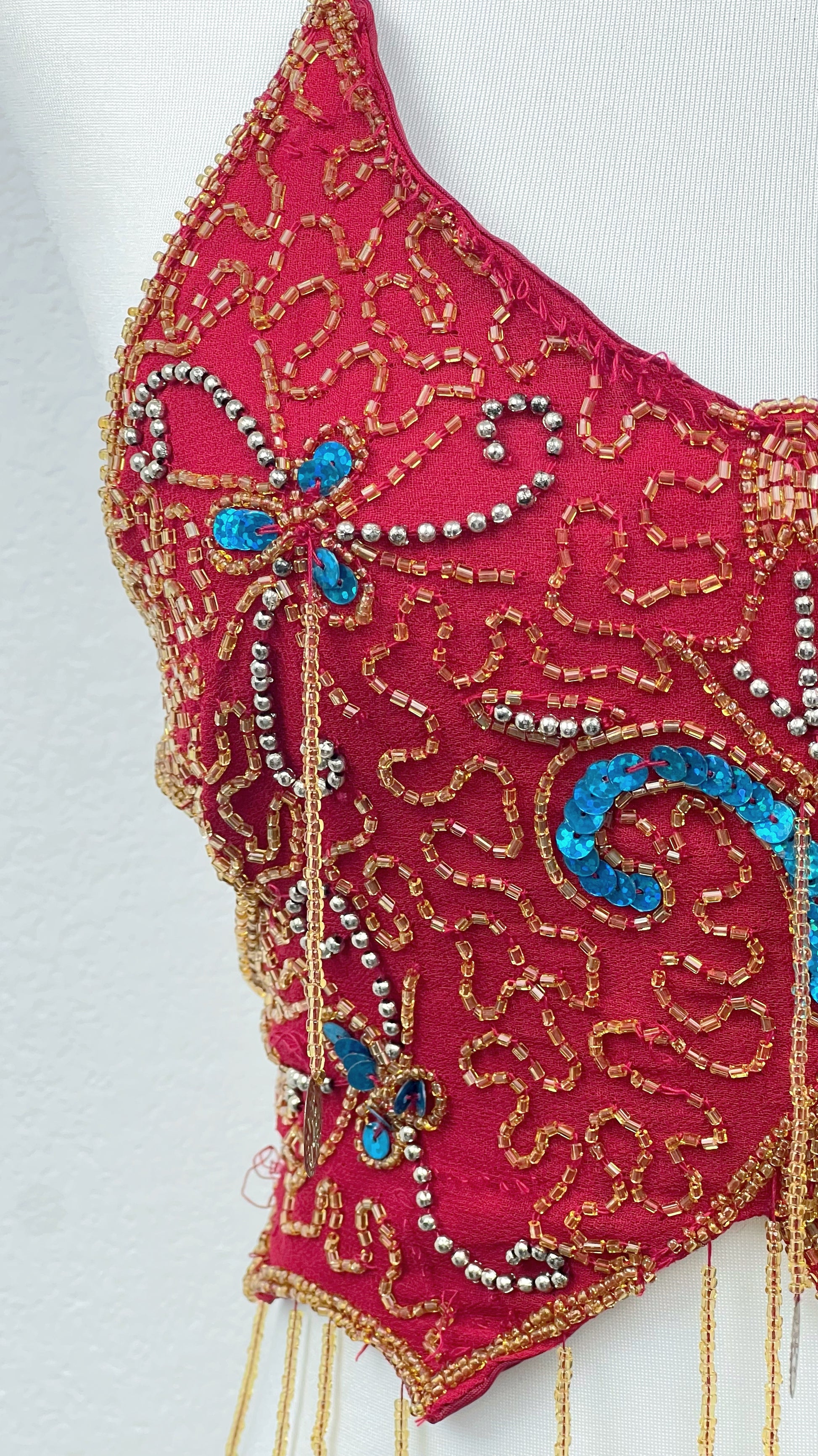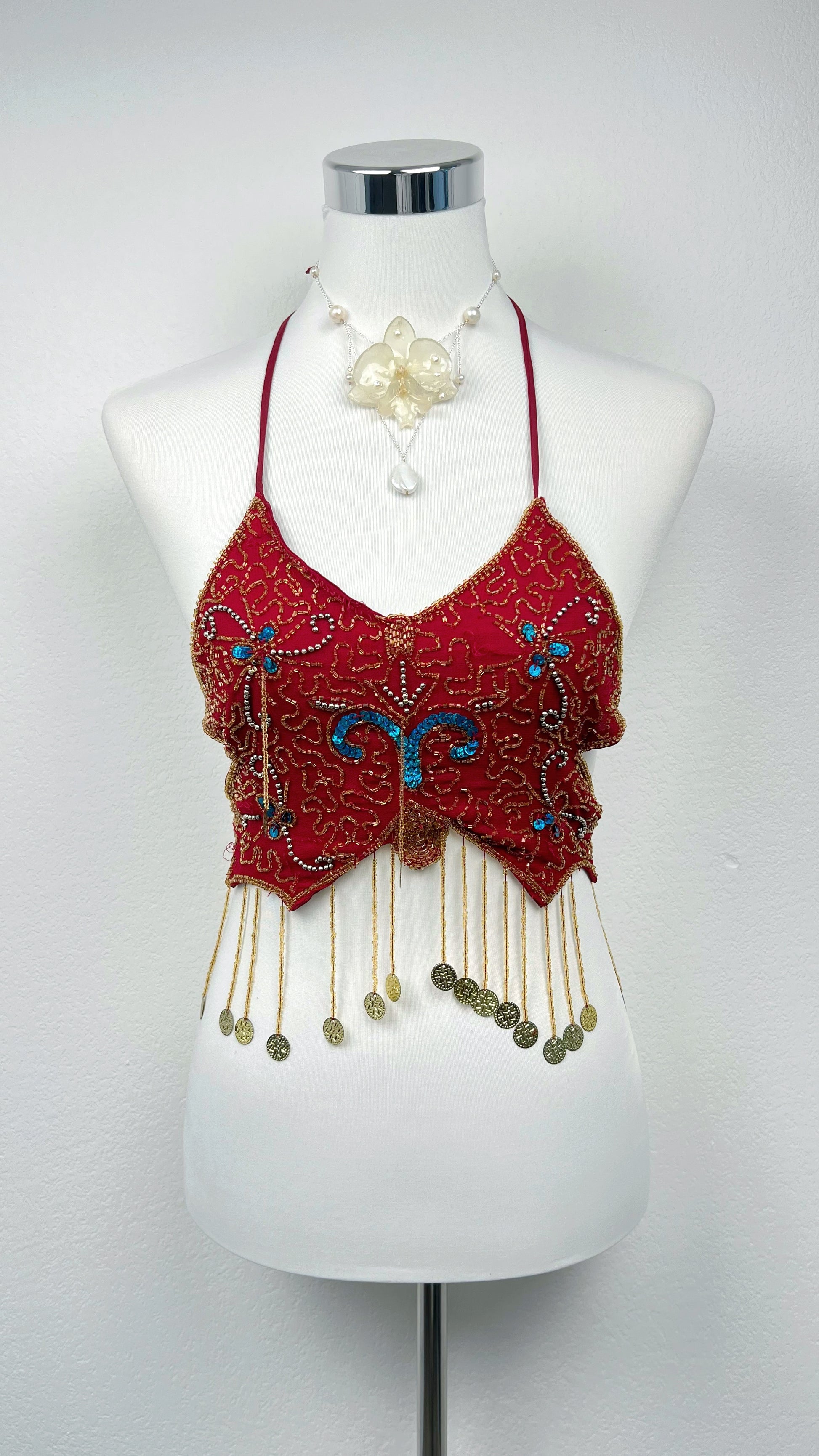 Ce haut papillon brodé à la main brille d’un rouge profond vibrant, orné de perles dorées et de touches turquoise qui dansent à la lumière.
