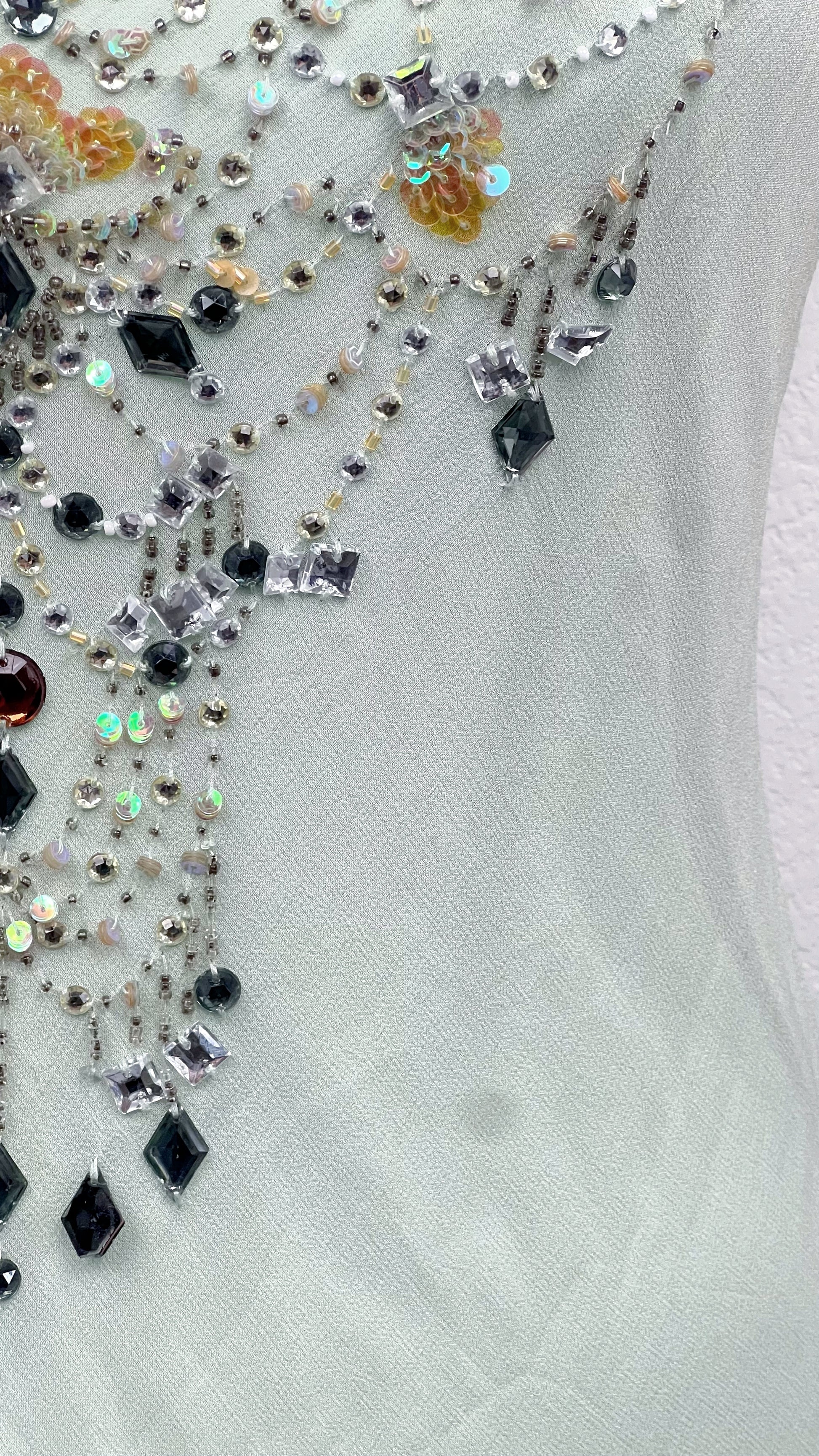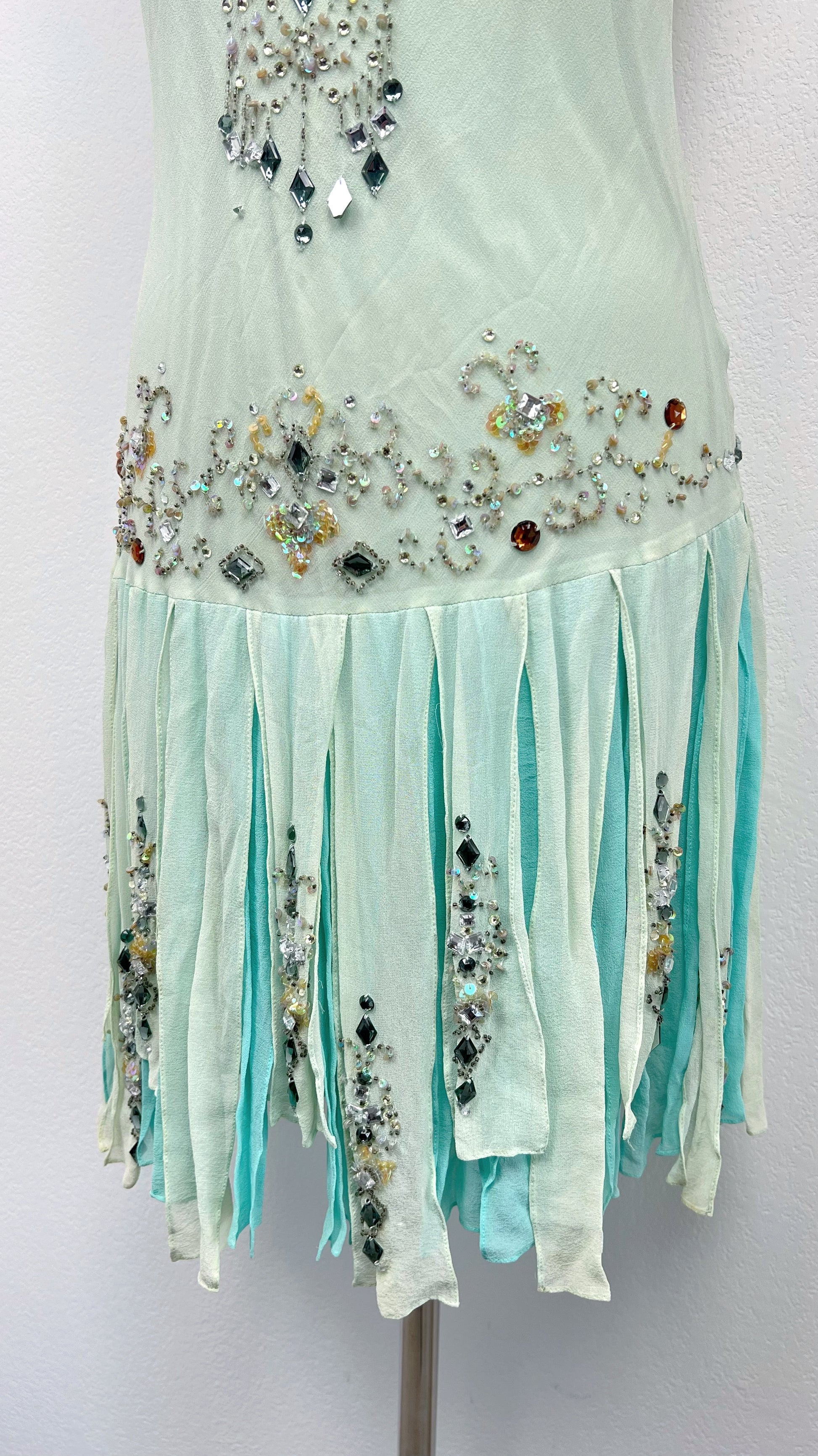 Rendered in a luminous shade of pale mint with hints of aqua beneath the layered silk panels, the bodice is richly decorated with ornate hand-applied crystals, sequins, and faceted stones arranged in symmetrical, almost celestial motifs. Each detail catches the light with quiet brilliance, creating a refined yet captivating glow.