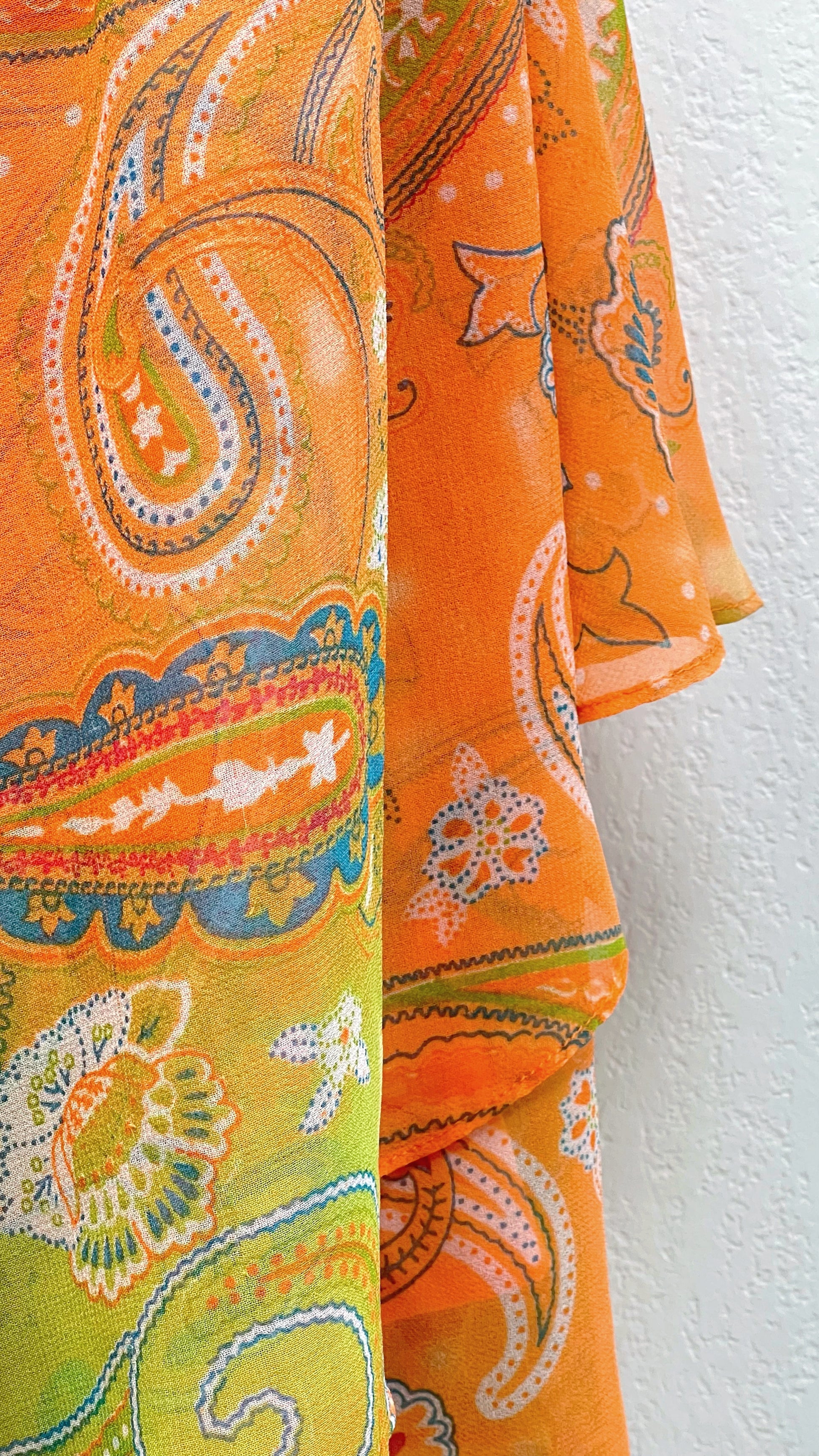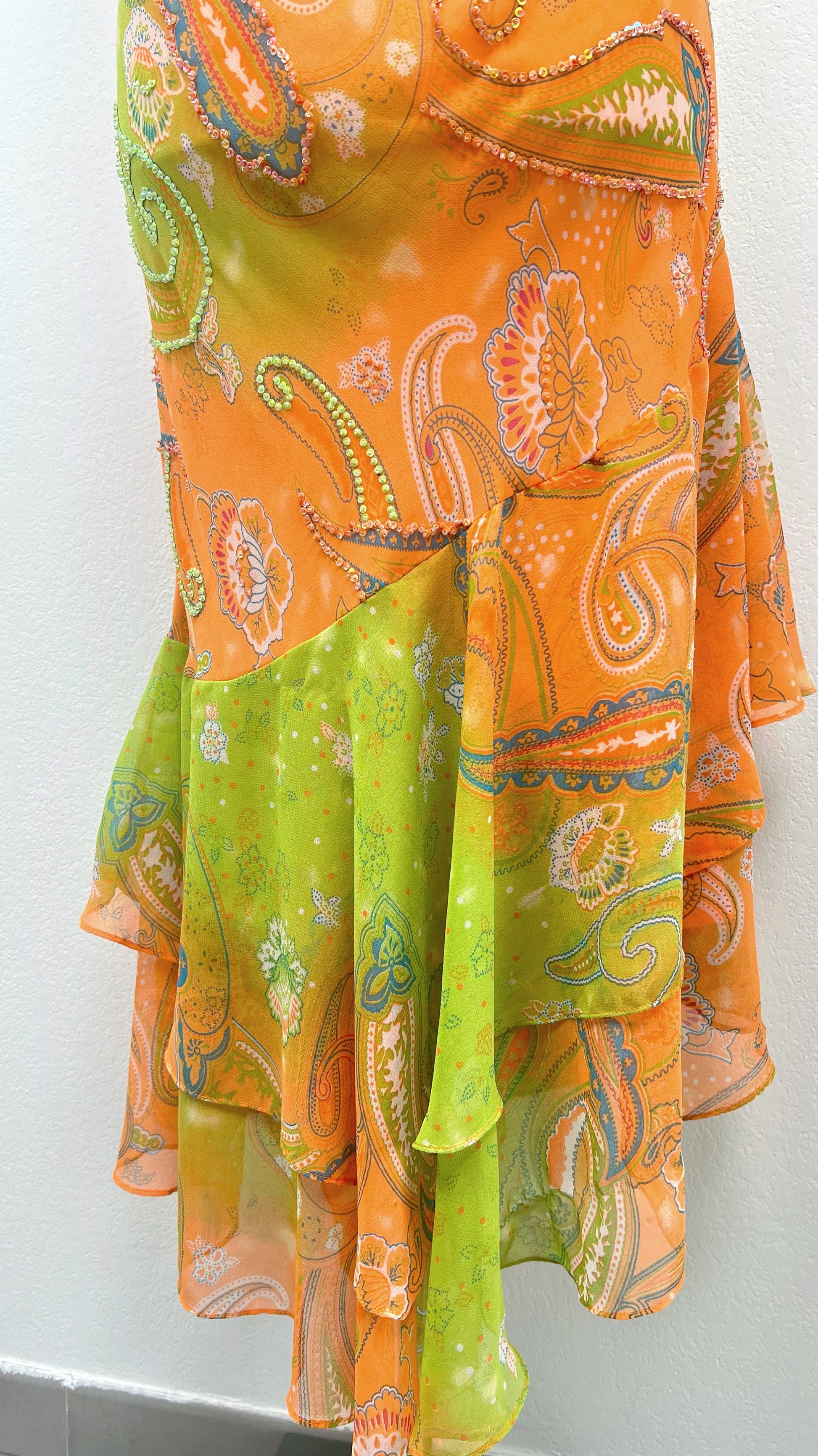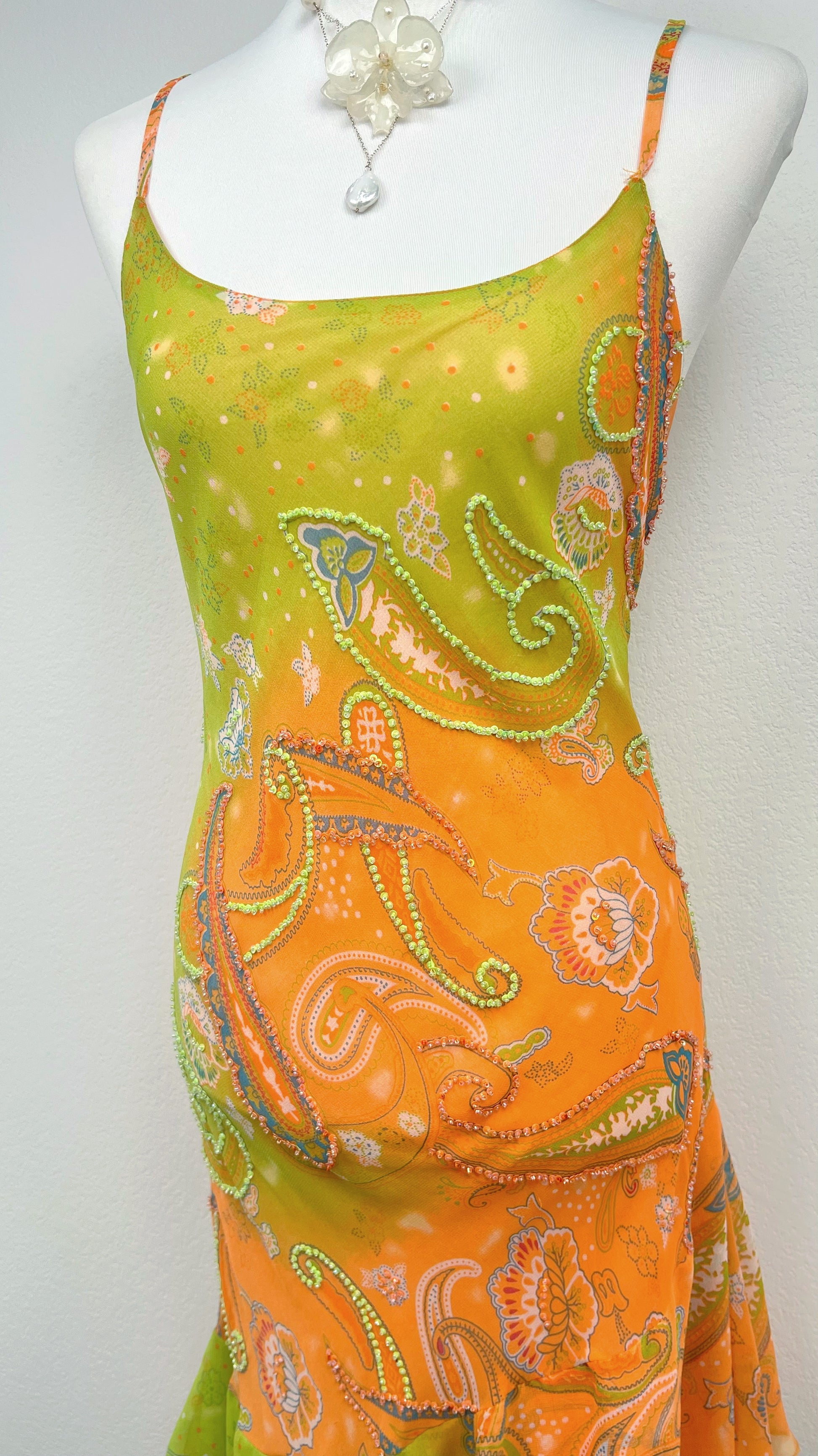 Its luminous blend of lime green and juicy orange melts together in a bold, swirling paisley motif, delicately enhanced with hand-applied beadwork that catches the light with every movement. The fabric flows effortlessly over the body, creating a sleek silhouette before cascading into layered asymmetrical ruffles that move like warm summer air.