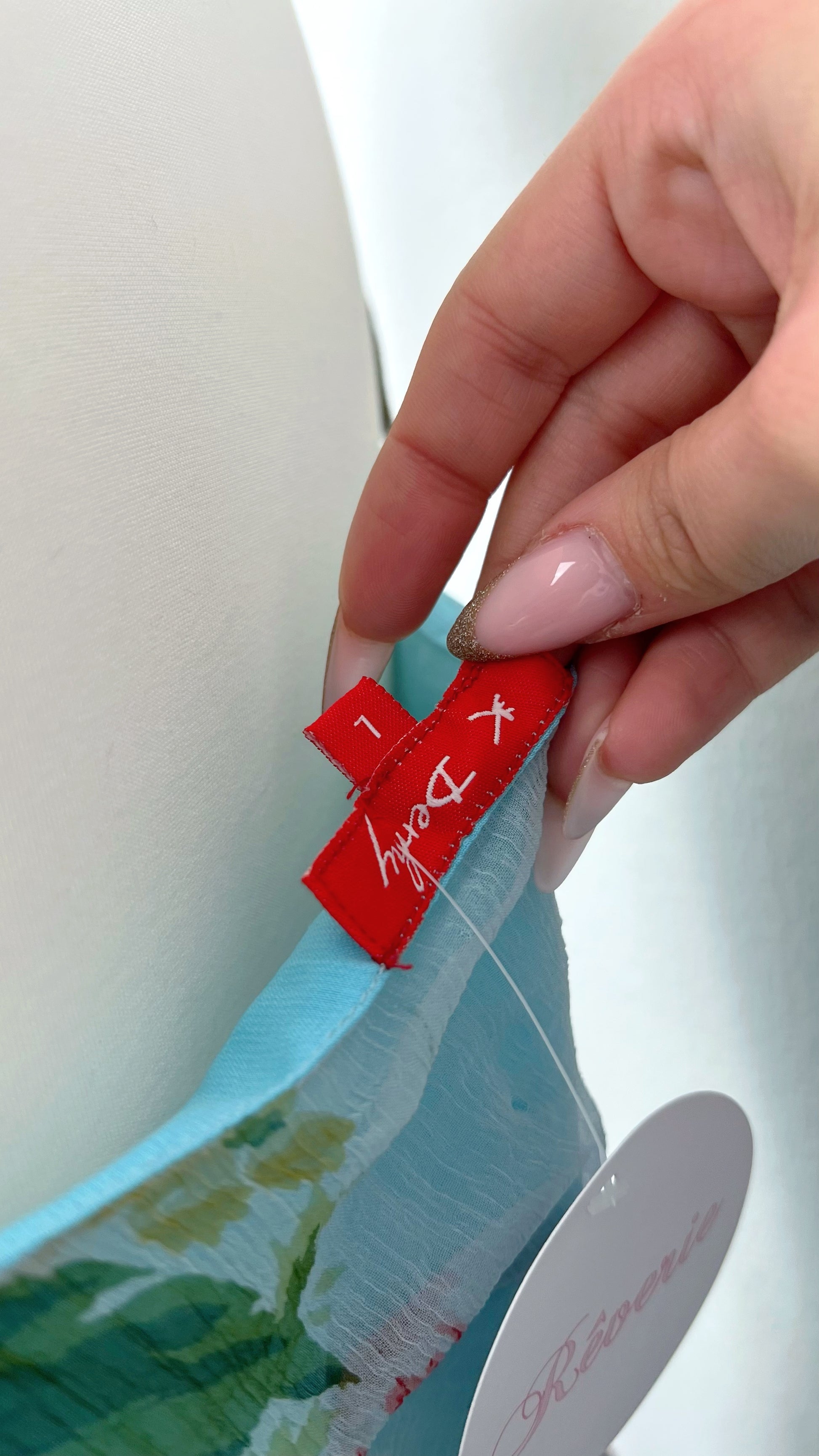 Robe Derhy délicate et lumineuse, confectionnée en viscose fluide au tombé léger et aérien. Son imprimé floral romantique mêle des nuances de bleu ciel, vert tendre et touches de rose, évoquant un jardin en fleurs baigné de lumière estivale.