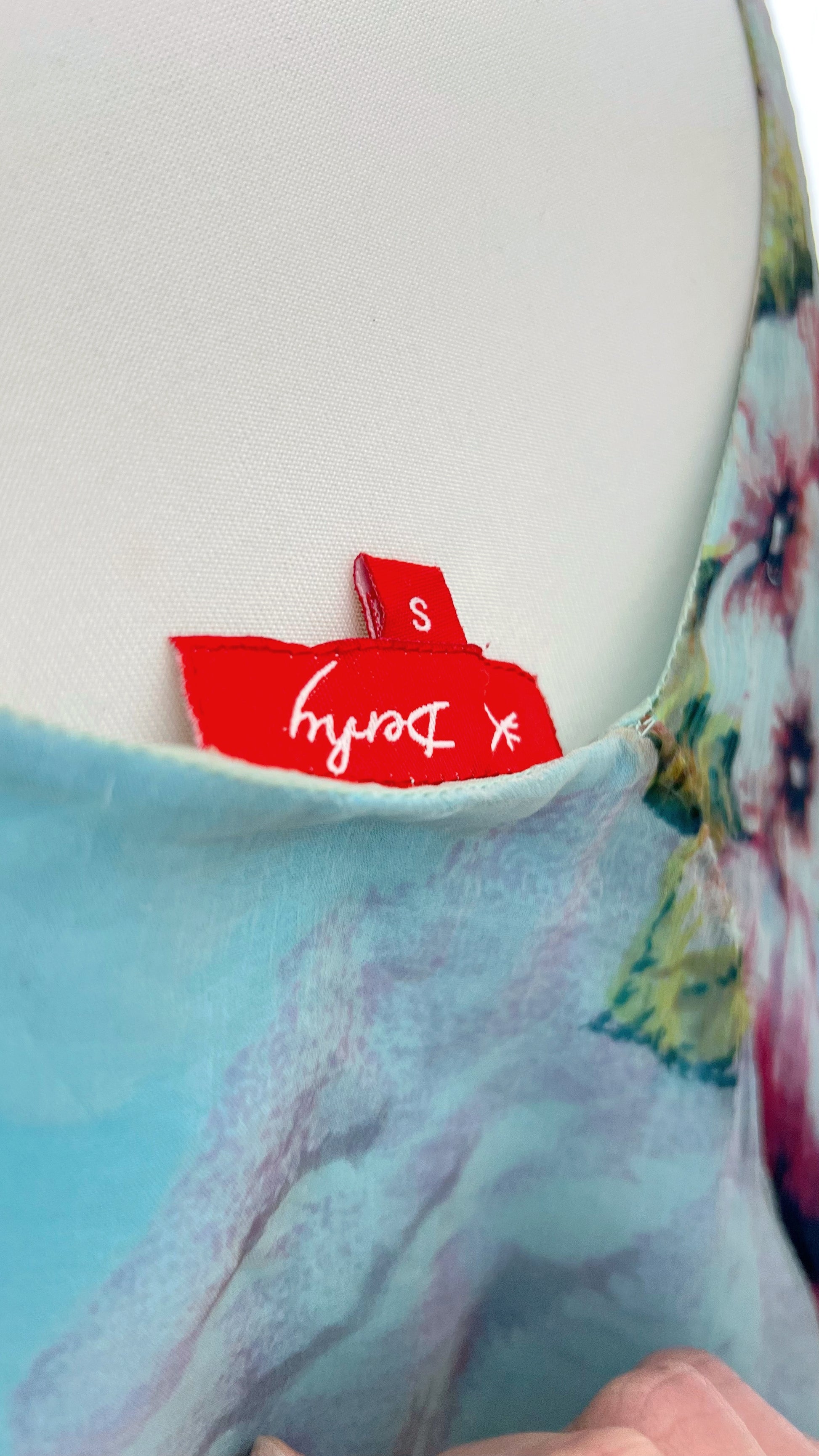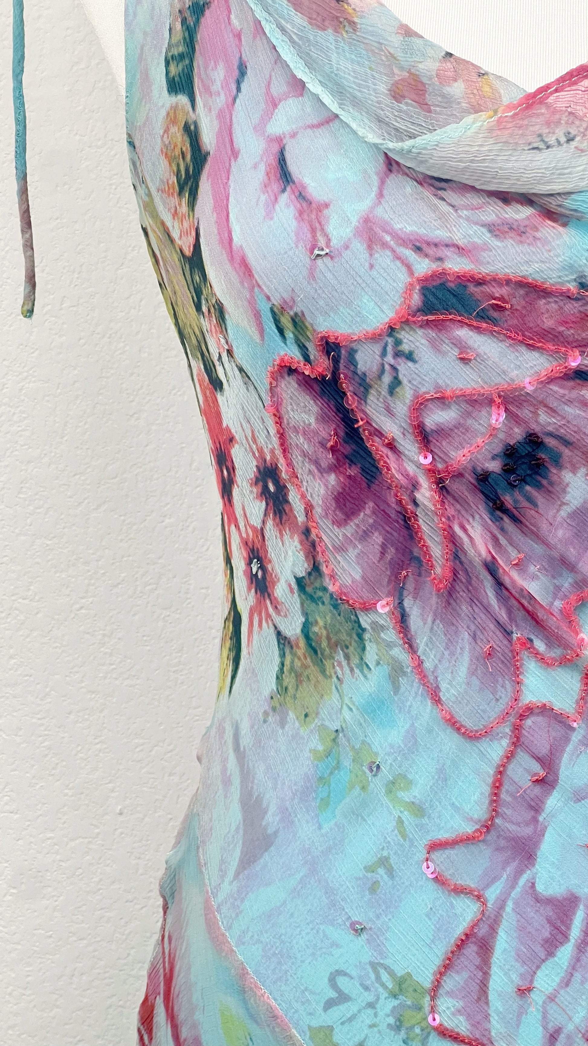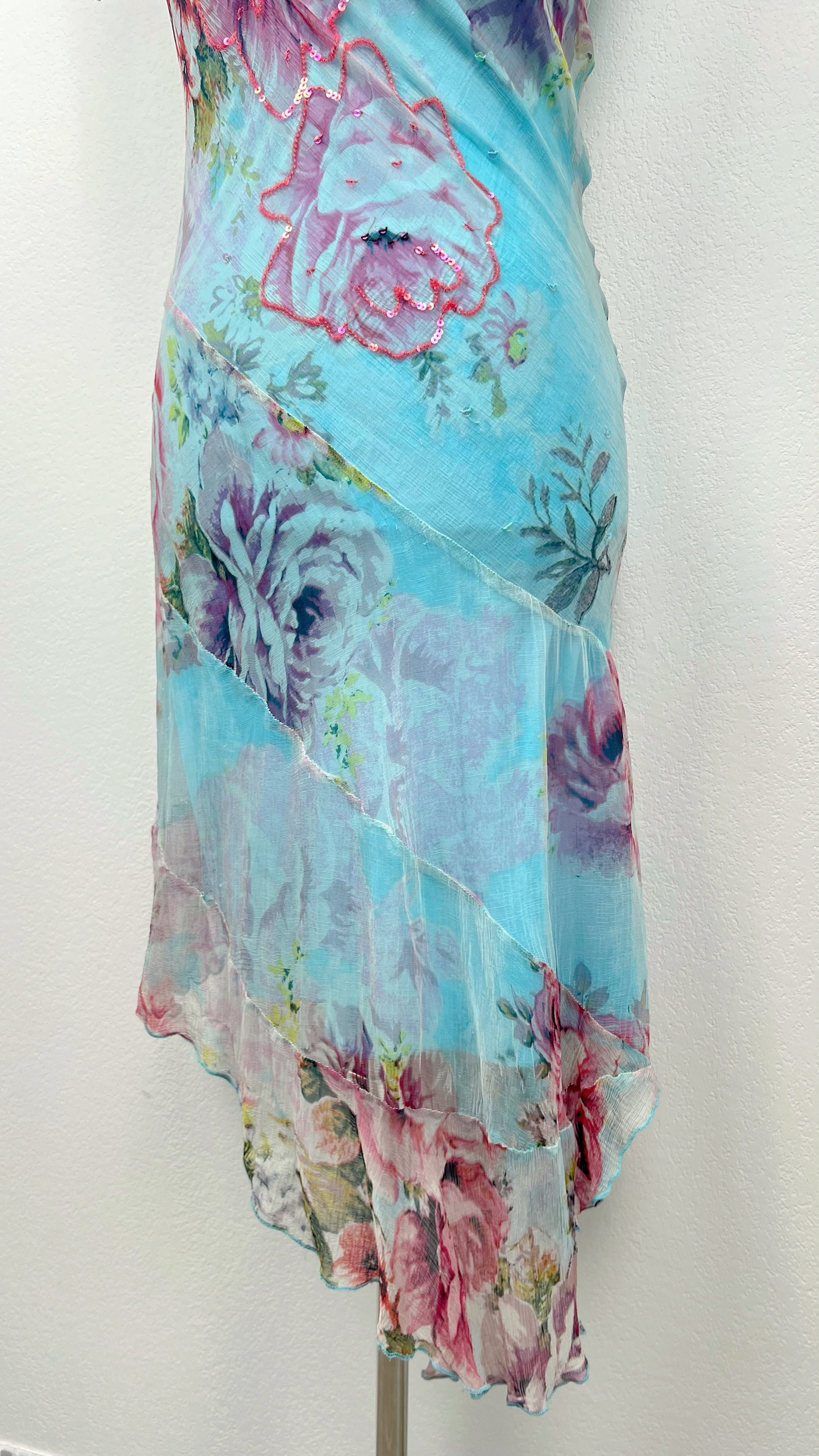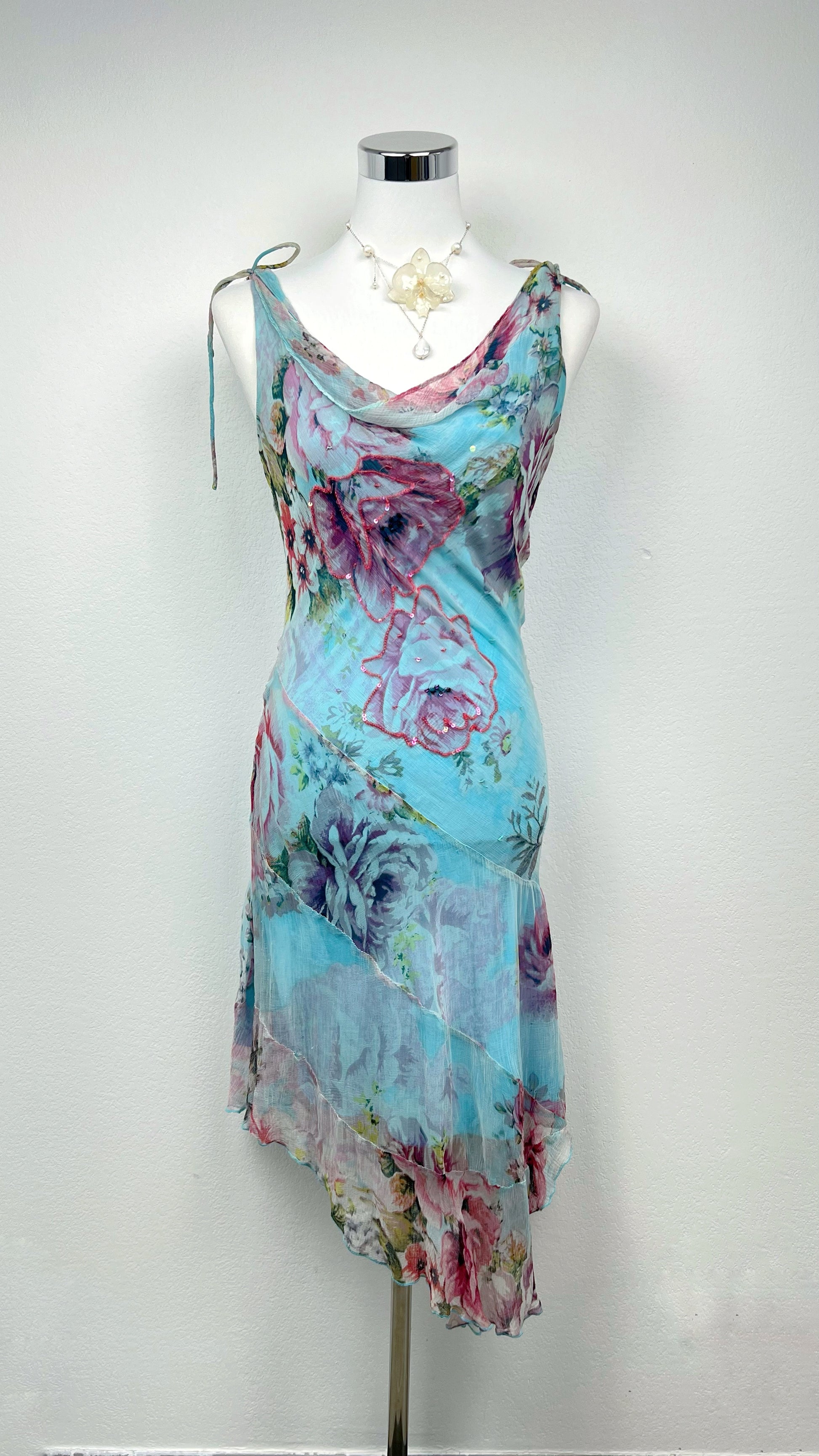 This rare Derhy dress floats in soft shades of sky blue and pastel florals, as if painted by morning light. Delicate embroidered roses shimmer gently across the fabric, while the airy, layered chiffon moves like a whisper with every step. The asymmetrical cut and draped neckline give it an effortless, romantic grace — light, poetic, and endlessly feminine.