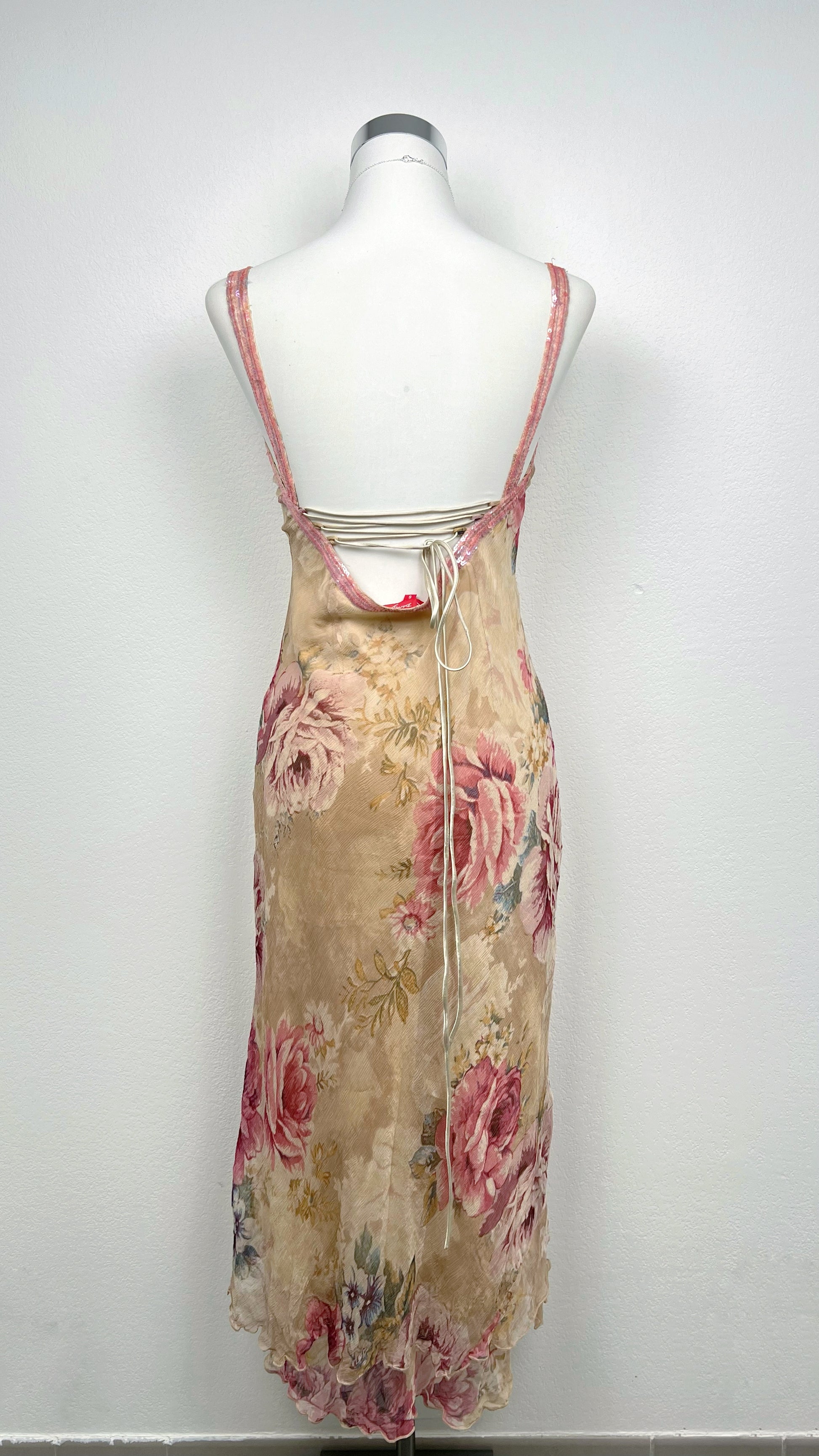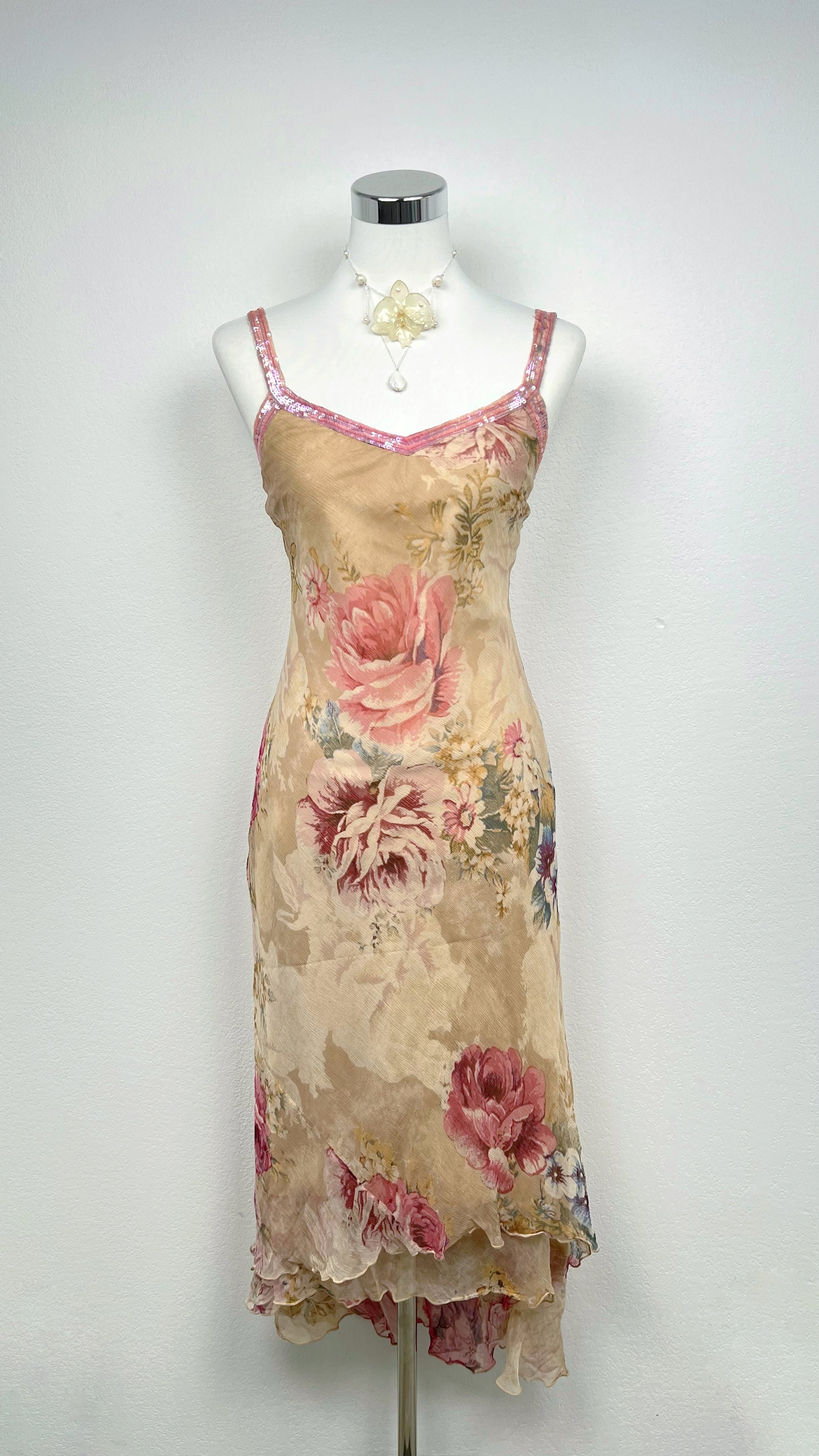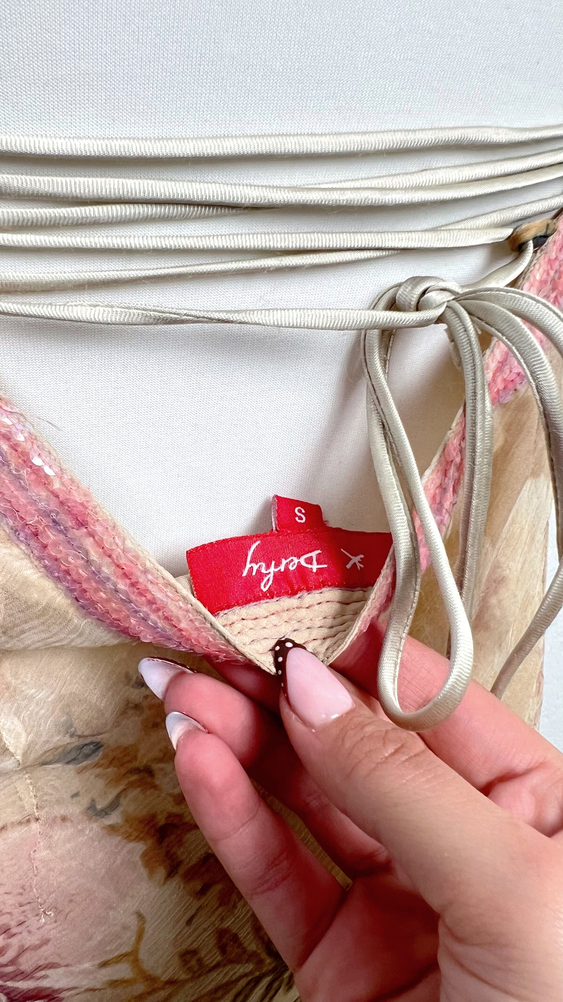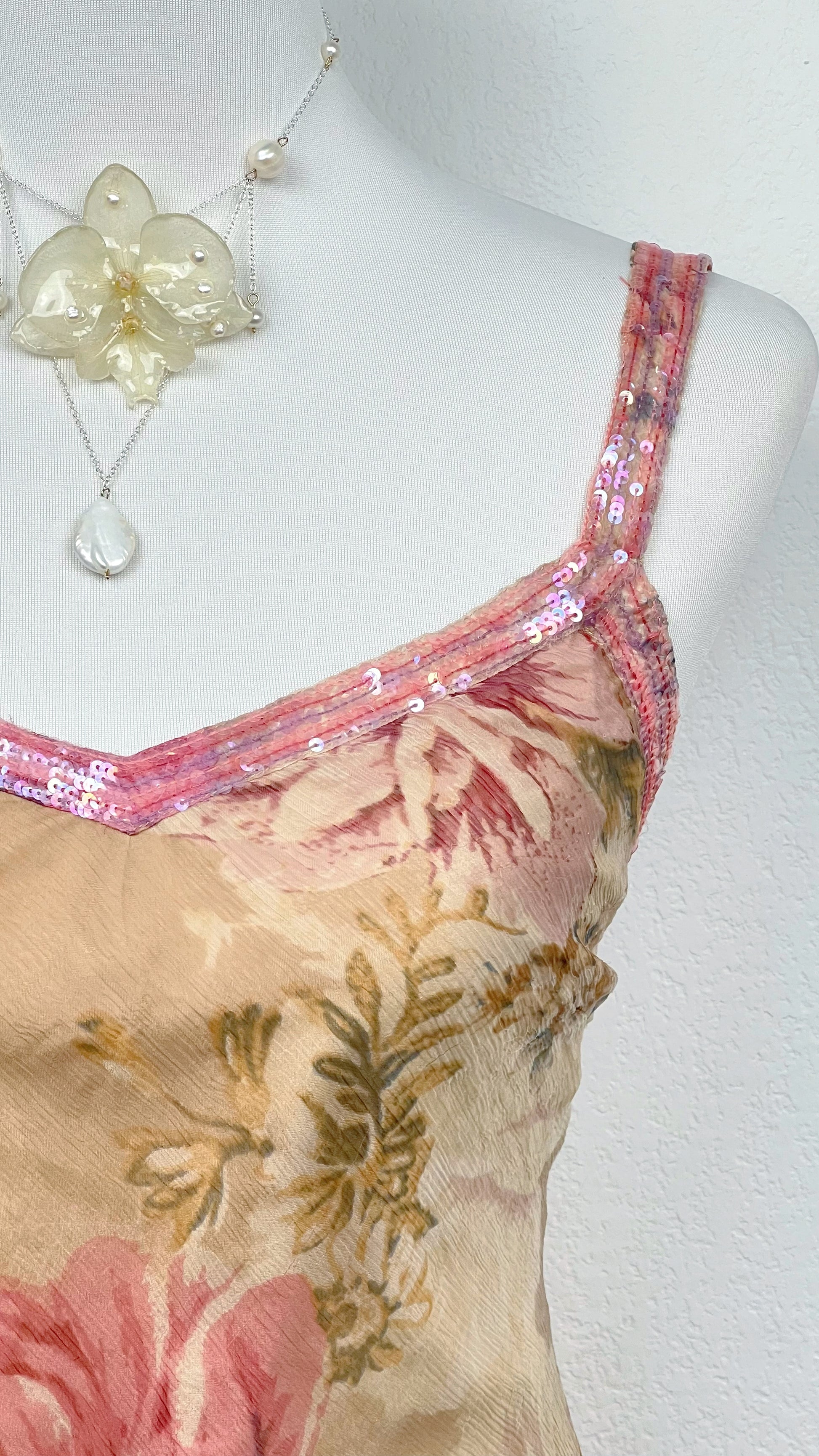 Chaque détail respire le raffinement vintage — des fines bretelles rosées perlées à la superposition légère du tissu.