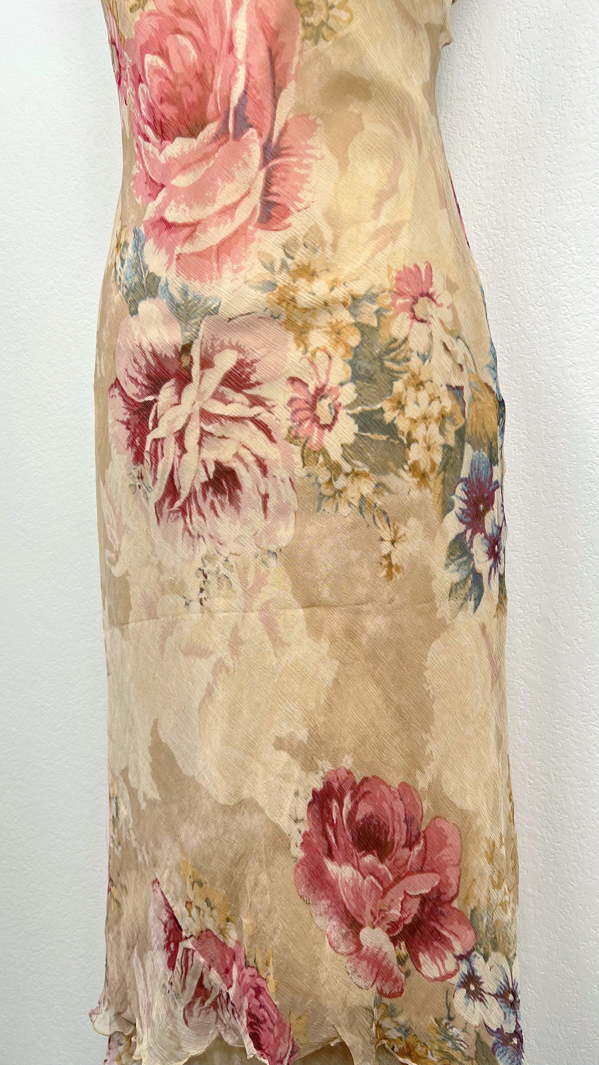 Cette robe Derhy rare en 100% viscose est une véritable œuvre florale : un tissu façon tapisserie ancienne, orné de grandes roses peintes dans des tons poudrés de beige, vieux rose et parme.