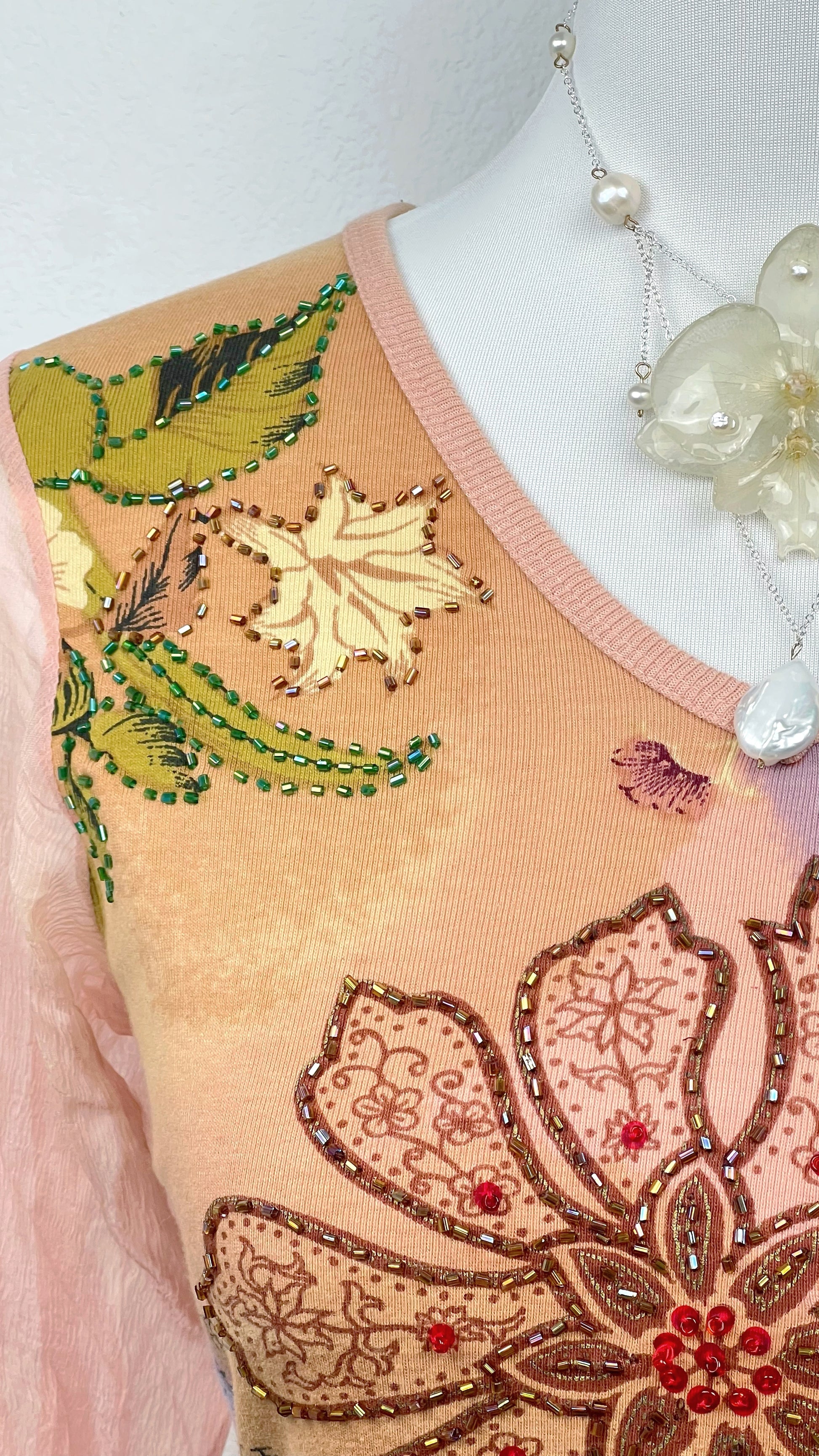Ce haut féerique aux teintes pastel pêche, lilas et vert mousse semble sorti d’un rêve printanier. Les fleurs perlées et les détails scintillants racontent une histoire douce — celle d’un jardin enchanté où chaque pétale capte la lumière.