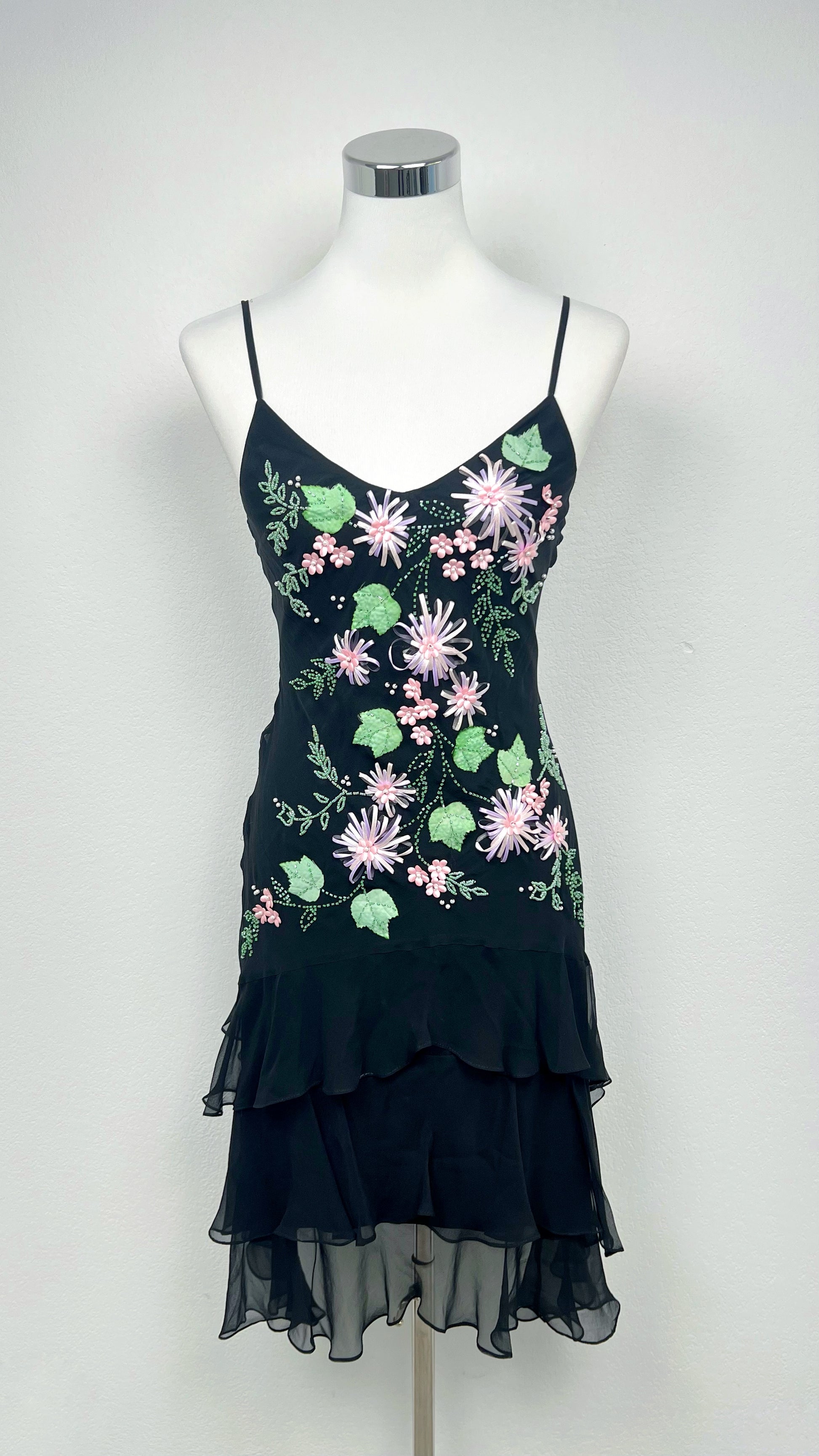 La Garden Fairy Dress est une pièce féerique en 100% soie, délicatement brodée de fleurs pastel et de feuilles perlées.