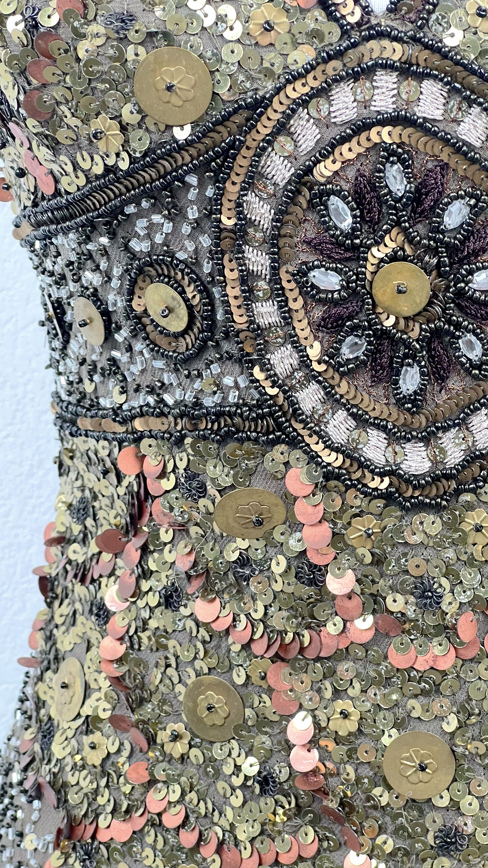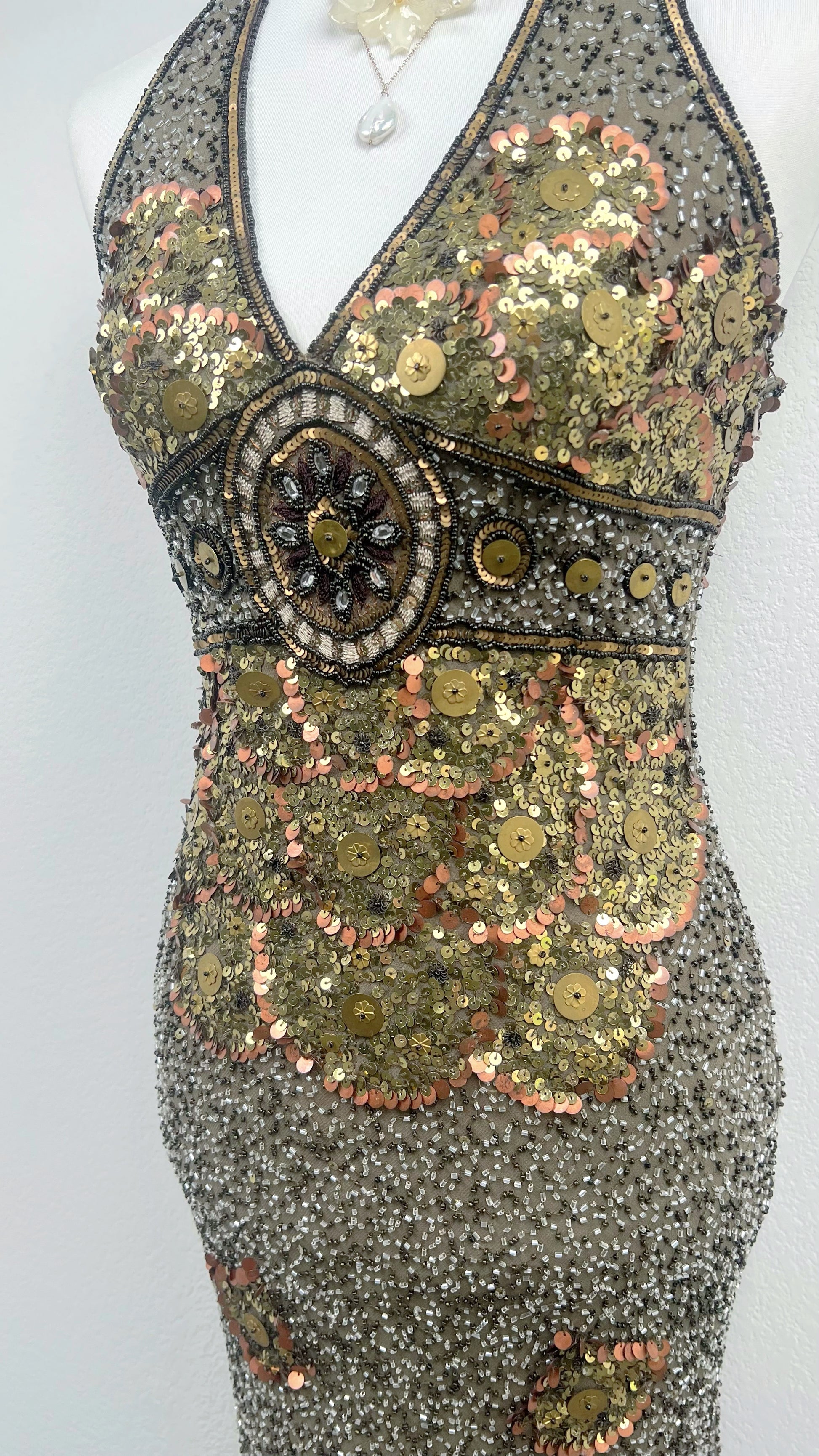 Entirely adorned in intricate beadwork and layered metallic sequins, this dress catches the light from every angle. Warm tones of antique gold, bronze, and soft copper shimmer across the surface, arranged in ornate, almost celestial patterns. The halter neckline elongates the silhouette, while the structured, embellished waistband draws the eye to a striking central medallion detail — bold, regal, unforgettable.