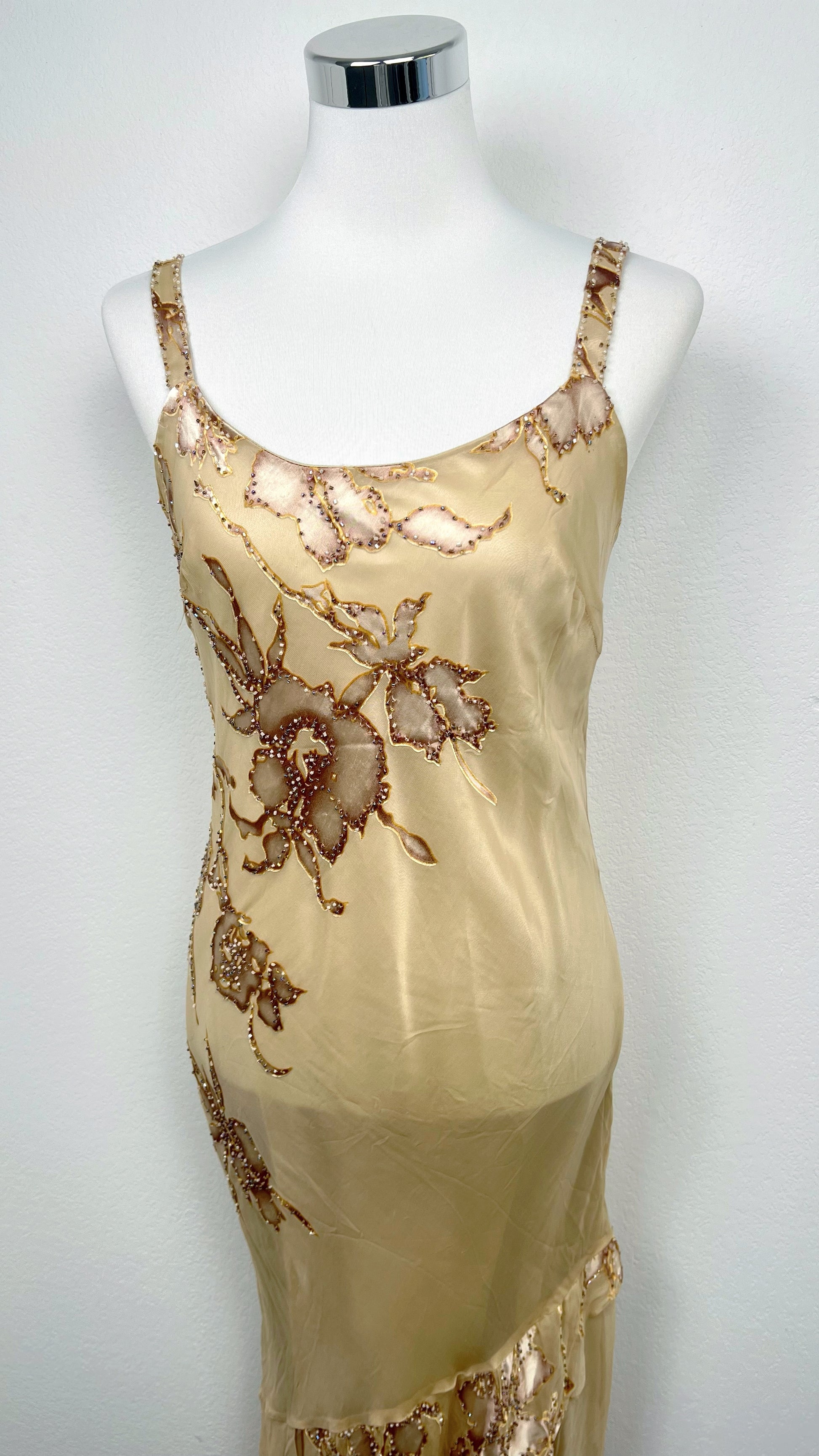 La Golden Petal Gown est une robe d’exception, confectionnée en 100% soie et entièrement brodée à la main de perles et de fils dorés.