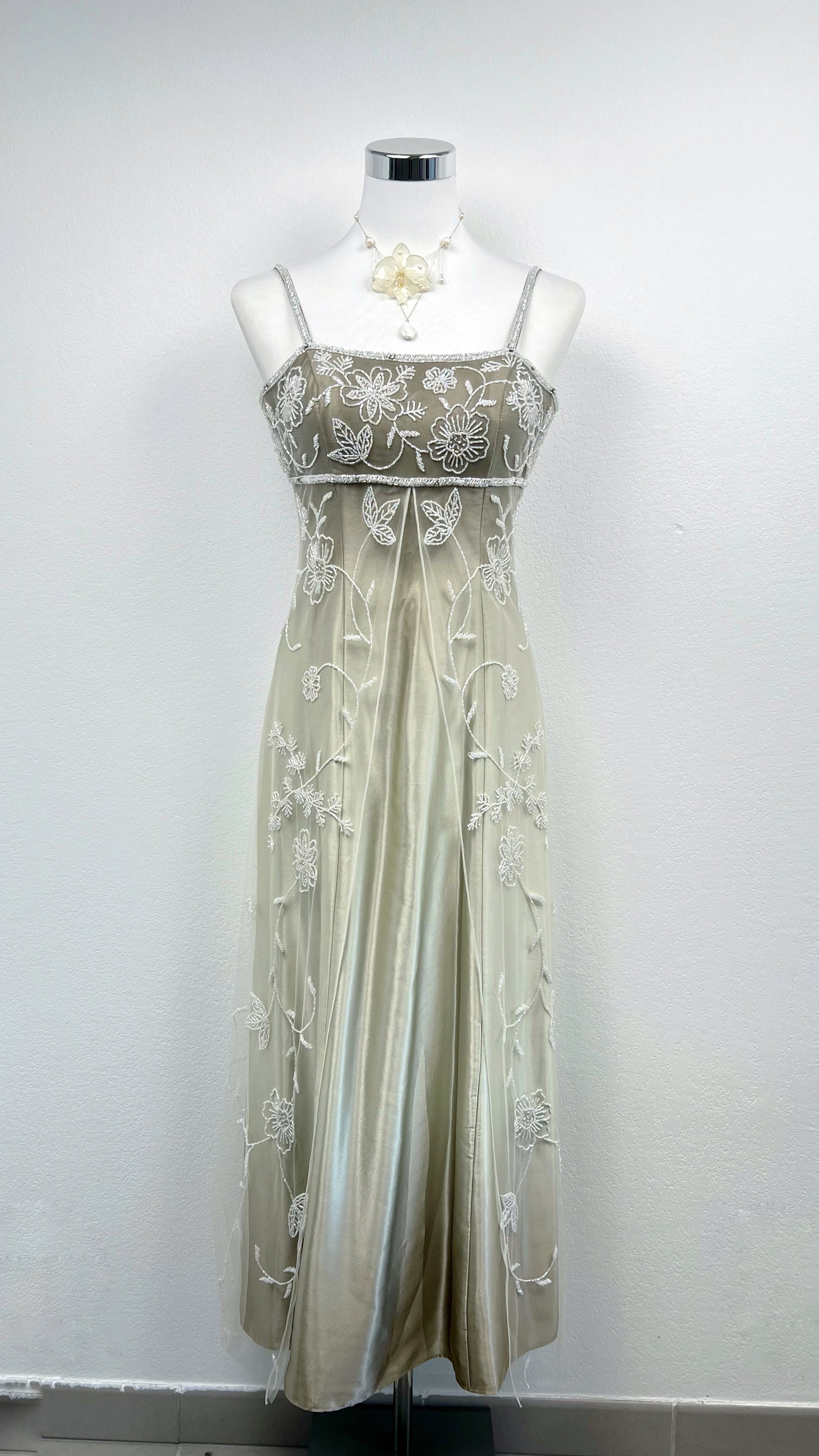 Les fines bretelles et la coupe empire apportent une féminité légère, presque angélique. C’est une robe pensée pour les moments suspendus : cérémonie intime, soirée d’été, shooting poétique ou simplement pour celles qui aiment porter des pièces rares, douces et profondément romantiques.